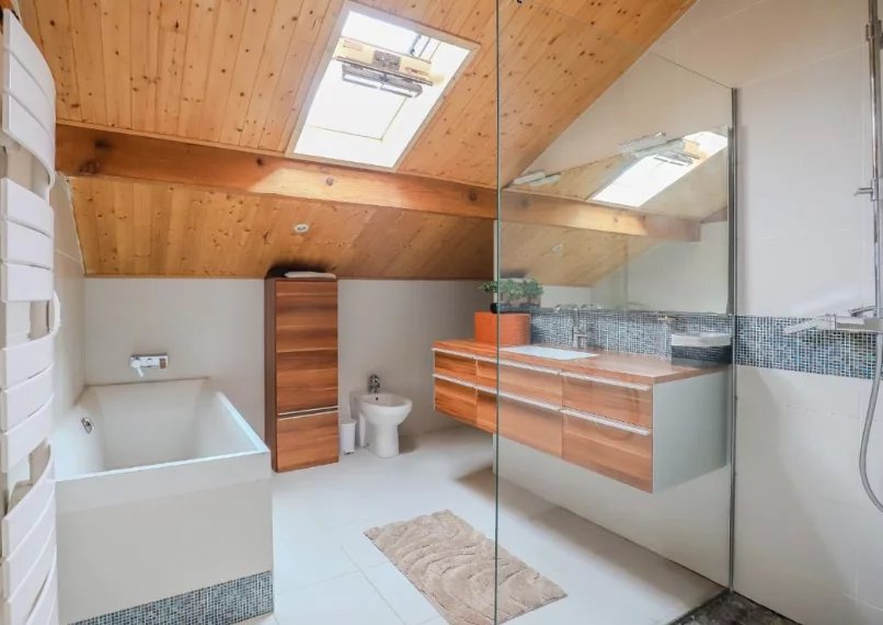 Le tout se complète de 2 garages de 27 m² et 25 m² pouvant accueillir de grands véhicules et beaucoup de rangement avec la mezzanine.