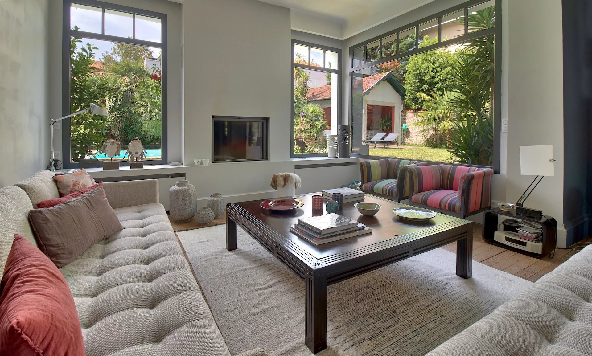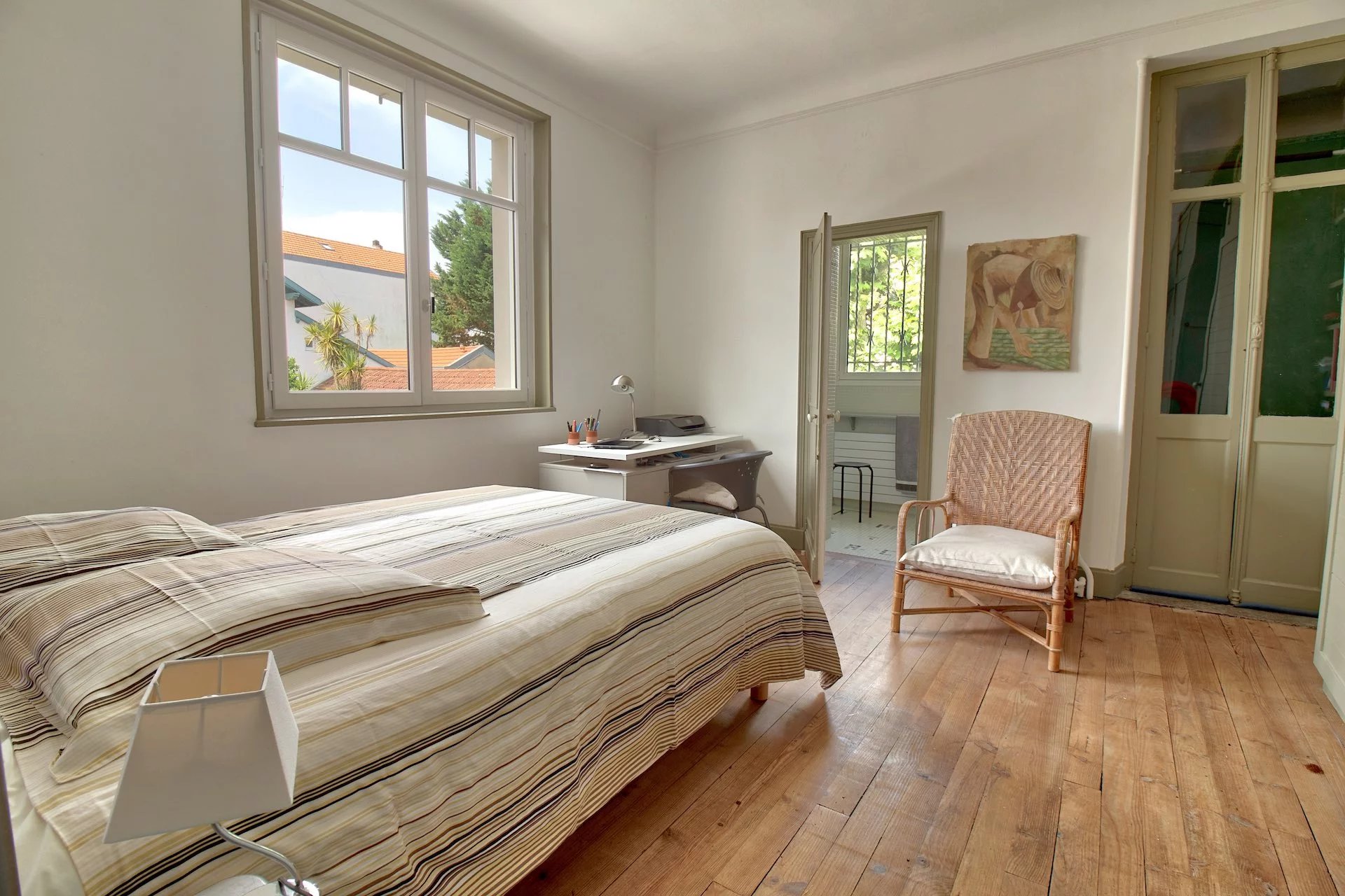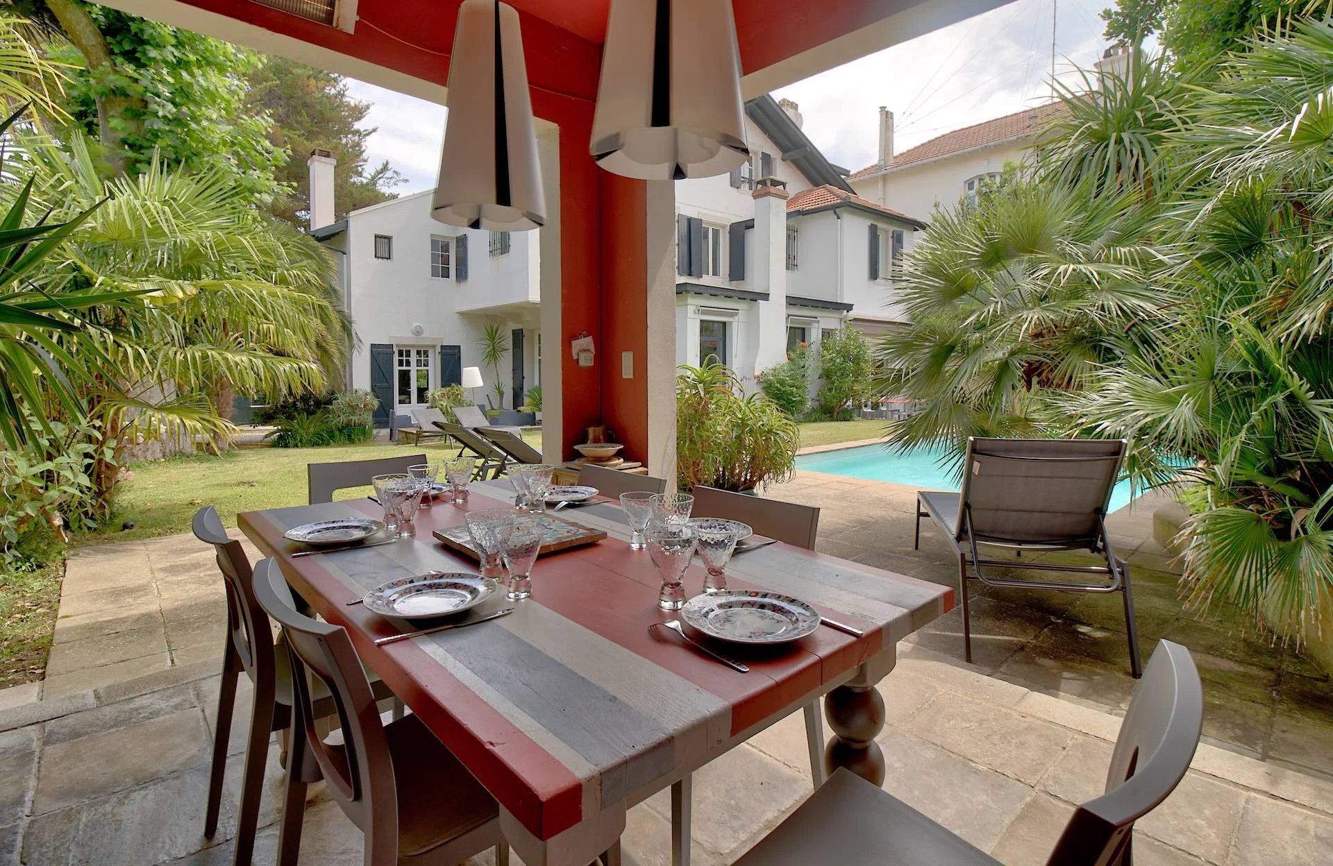 Proche du centre ville à pied, très belle demeure néobasque de caractère construite en 1925 d'environ 280m2 sur un terrain de plus de 1000m2 avec piscine carrelée et chauffée, pool-house. Très belles pièces de réception lumineuses ouvertes sur le jardin, 7 chambres, 3 salles de douche et 1 salle de bains. Cave. Véritable maison de famille, de charme à l'abri des regards.