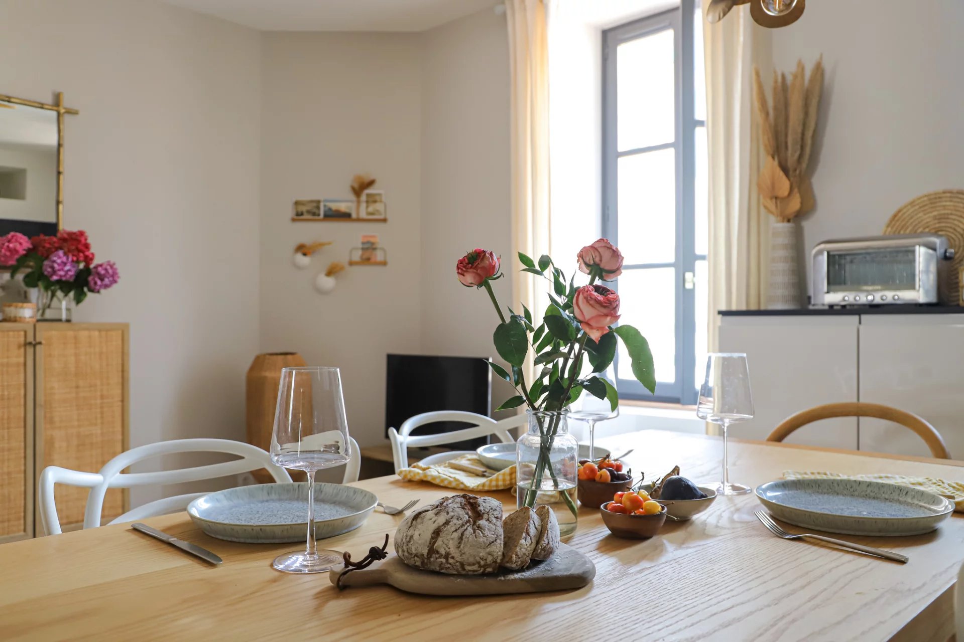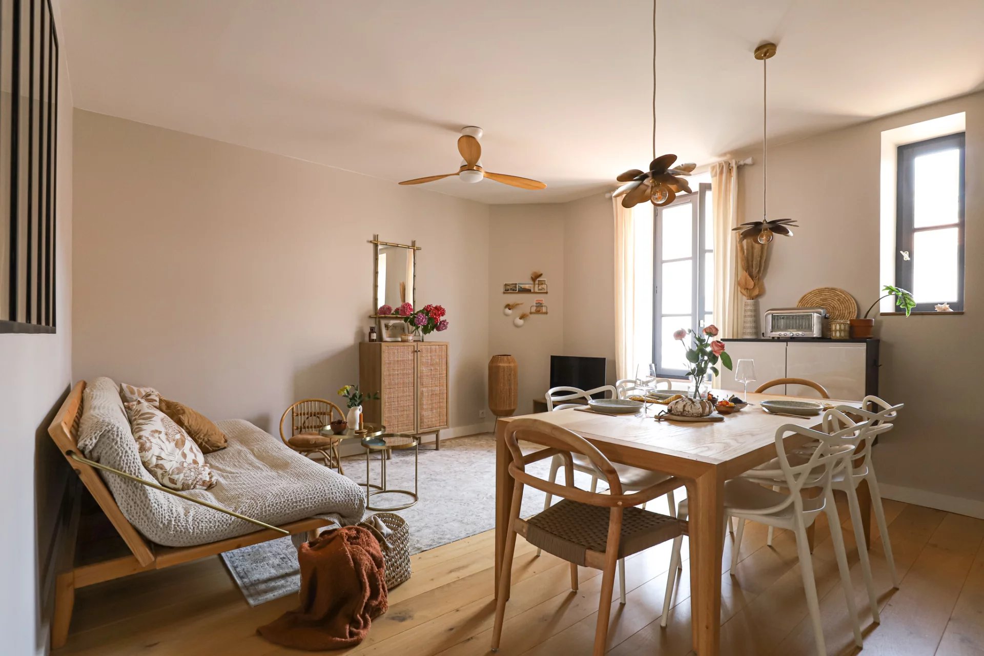 La pièce principale, cœur de l’appartement, se compose d’une cuisine ouverte élégante, avec son plan de travail en quartz Silestone, complétée par une grande table bien éclairée, propice aux repas entre amis ou en famille, et enfin d’un coin salon pour la détente.