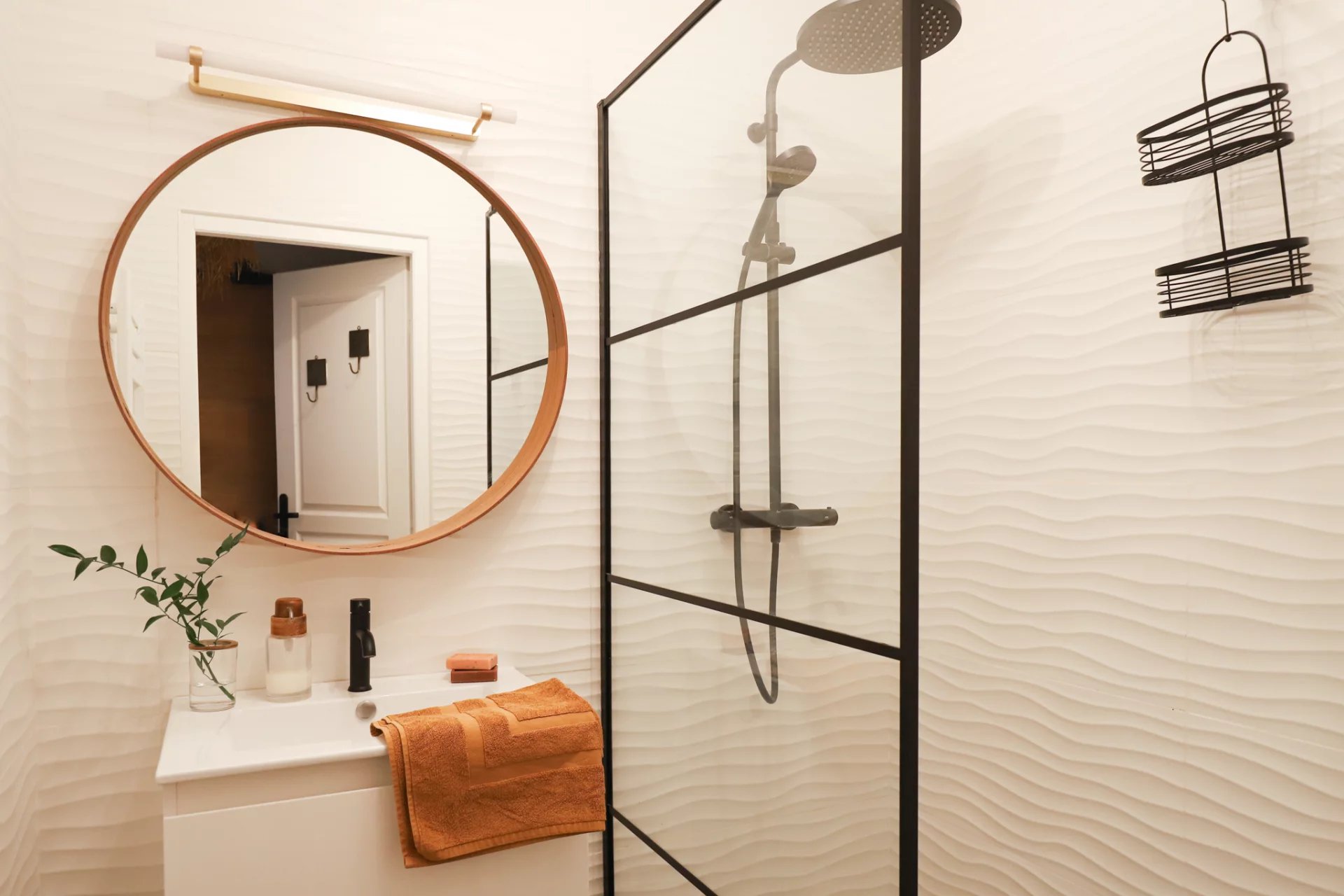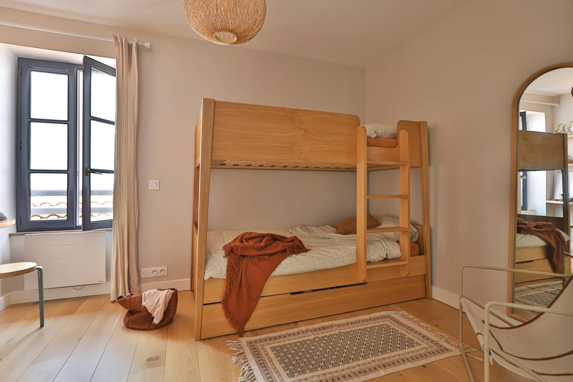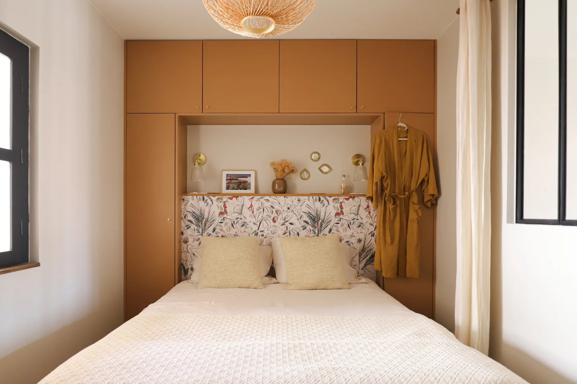 La première chambre offre de beaux rangements avec deux grandes armoires et un petit coin bureau. La deuxième chambre est séparée du salon par une verrière et son grand lit double invite au cocooning avec sa tête de lit aux rangements astucieux et sur mesure.