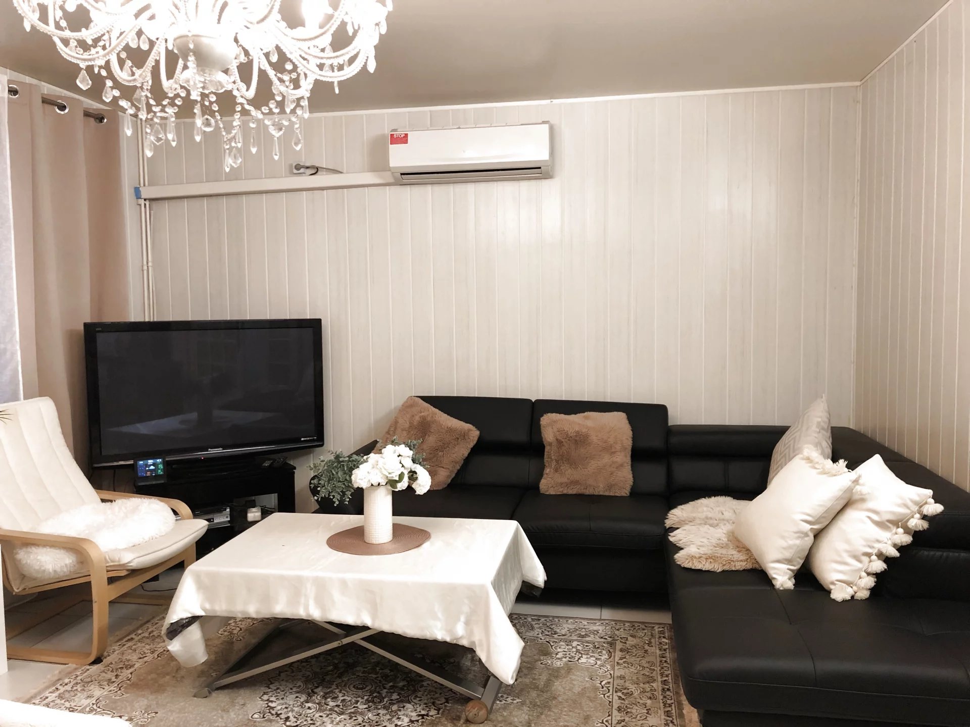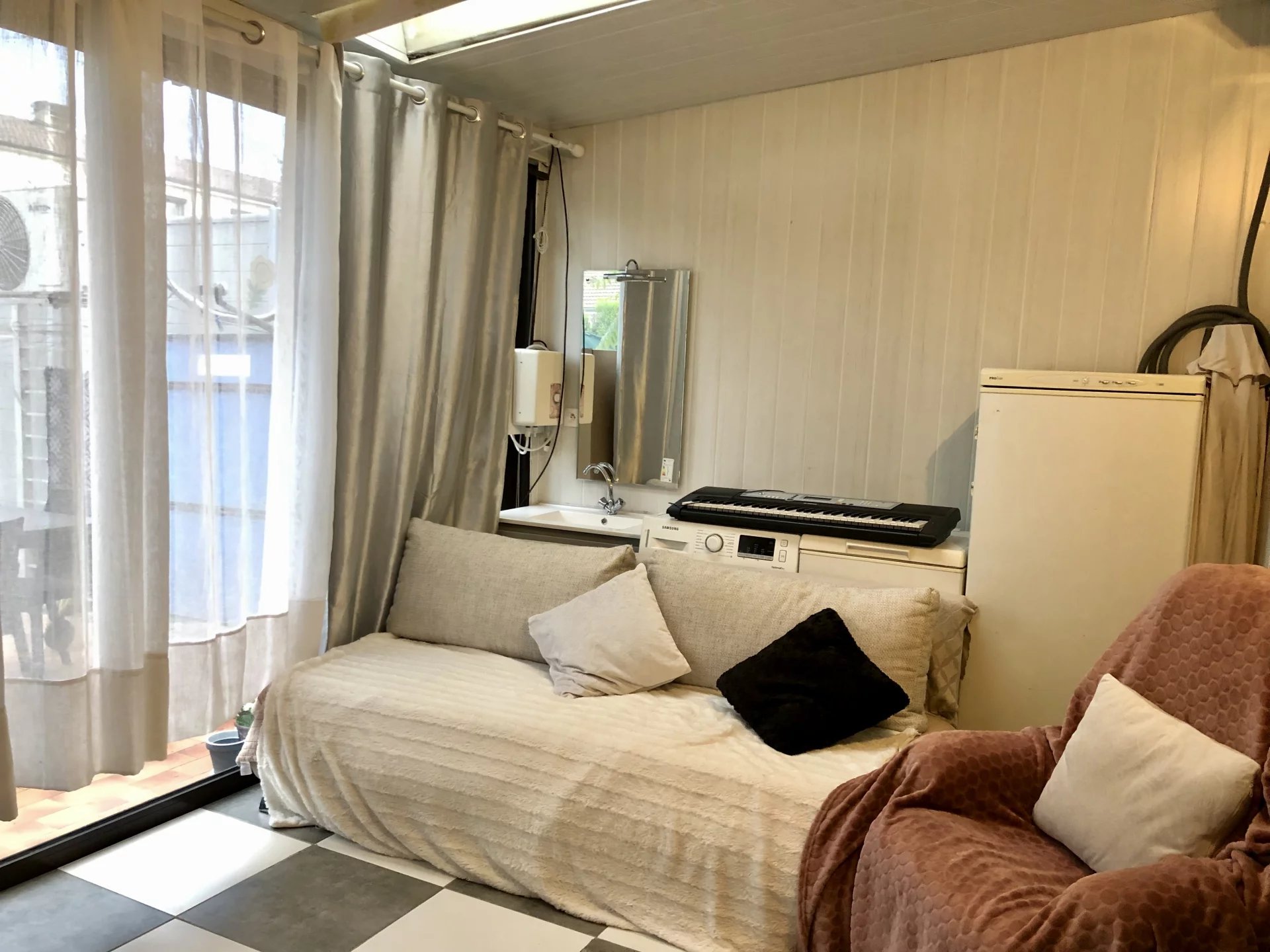 L'entrée est précédée d'un sas, elle distribue une cuisine, une salle de douches avec wc, une pièce de vie qui ouvre sur une véranda permettant l'accès à la terrasse et au jardin.