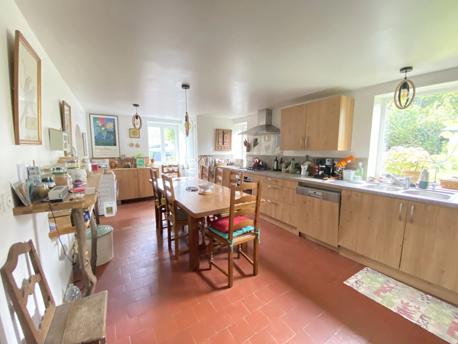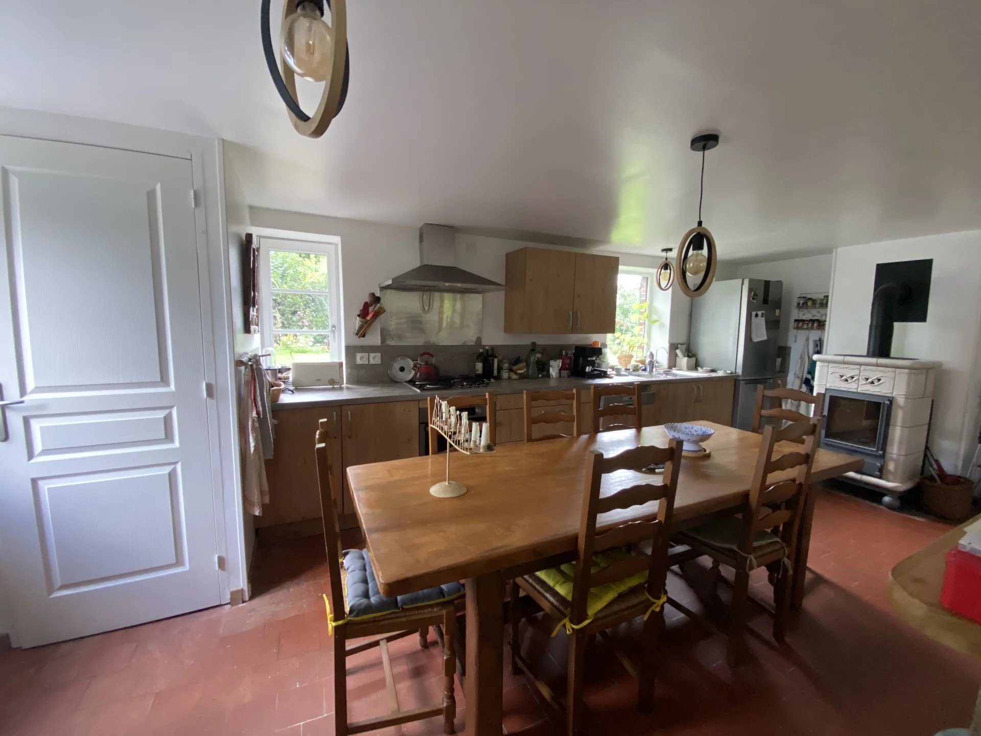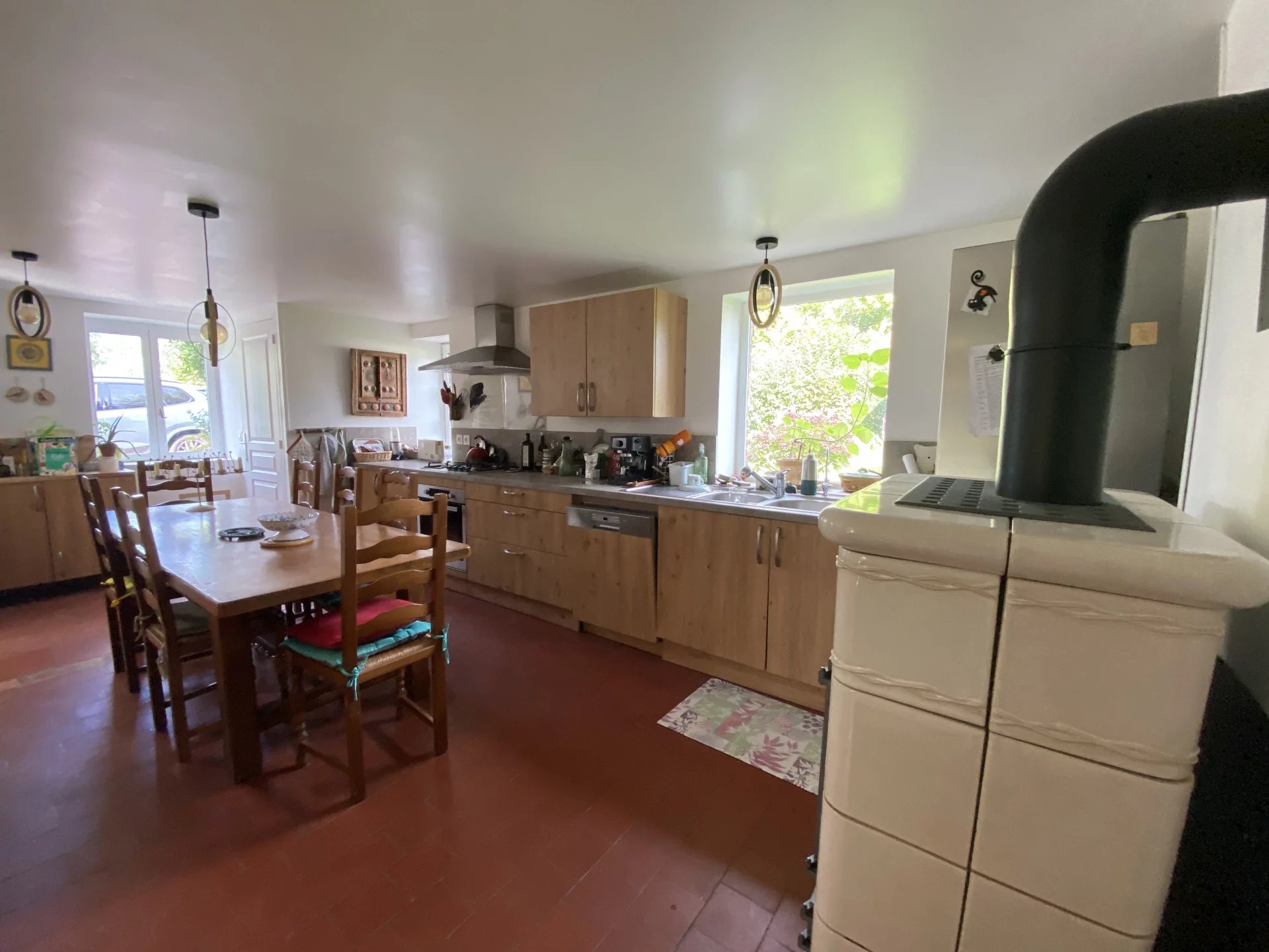VENDUE PAR RIVARD IMMOBILIER. A proximité de Vimoutiers à pied, longère restaurée avec goût et matériaux de qualité offrant sur deux niveaux et environ 159 m² : au rez-de-chaussée, une entrée avec dressing, une cuisine dînatoire indépendante et équipée avec un poêle Oliger et un wc, un grand salon avec un poêle Godin et accès à une terrasse, une salle à manger ou bureau, une chaufferie-buanderie; à l'étage, un couloir desservant trois chambres dont une avec salle d'eau et wc, une salle de bains avec wc, une petite chambre enfant avec accès à une salle d'eau avec wc (commune avec la chambre de l'appartement); un appartement attenant et communiquant avec la maison avec un séjour avec poêle Godin et une cuisine en rez-de-chaussée et à l'étage, une chambre avec salle d'eau et wc. Une dépendance transformée en gîte offrant sur environ 30 m² : un séjour avec cuisine équipée, une salle d'eau-wc et une chambre en mezzanine. Double-vitrage dans l'ensemble de la maison et du gîte. Jardin clos et arborée de 1340 m². Beaucoup de charme et environnement calme et agréable. Proche de toutes les commodités. A 30 minutes de Lisieux et Evreux, à deux heures de Paris (1h30 en train).