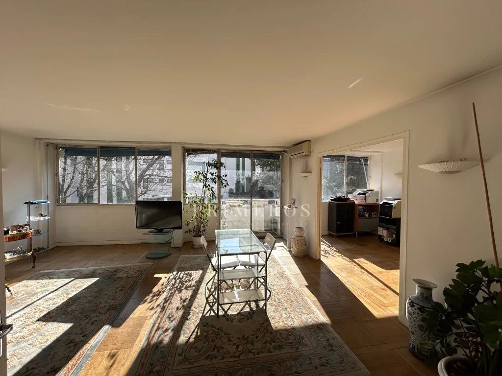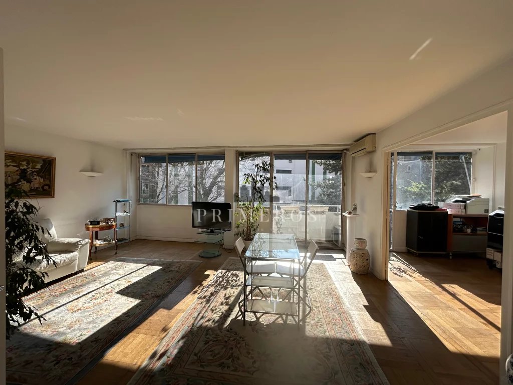 Appartement lumineux de bon standing + Parking - 2ème étage - 112 m² Situé au 2ème étage par ascenseur dans un immeuble semi-récent, en plein cœur du 16ème arrondissement dans le quartier de La Muette, à proximité directe de la Rue de Passy. Sectorisation très demandée. L'appartement de 5 pièces est composé d'un vaste double séjour de plus de 30m², avec un balcon de 2,6m² disposant d'une vue dégagée sur un beau jardin privatif. Le bien dispose d'une grande galerie d'entrée, 3 chambres, un dressing, une cuisine séparée, une salle de bain, une salle d'eau, ainsi que des WC séparés. Aucun murs porteurs, le plan est totalement modulable. L'appartement est traversant, avec une exposition est/ouest, offrant une vue dégagée sur un jardin privatif et sur rue, sans vis-à-vis. L'appartement est calme et très lumineux, avec une proximité immédiate des commerces et des transports. La copropriété est saine, avec des travaux de ravalement et d'entretien effectués récemment, ainsi que des parties communes biens entretenues et de bon standing. Gardien présent dans l'immeuble. Aucun travaux à prévoir au sein de la copropriété. Une grande cave ainsi qu'une place de parking en sous-sol de l'immeuble complètent ce bien. Charges : 456€/mois (inclus chauffage et eau chaude). DPE : En cours de réalisation Copropriété : Aucune procédure en cours.