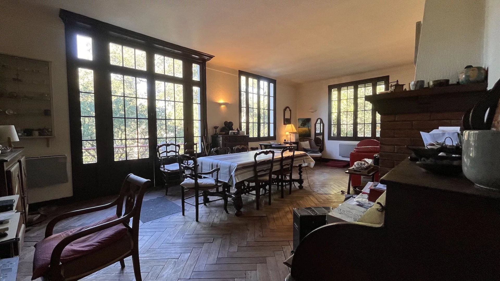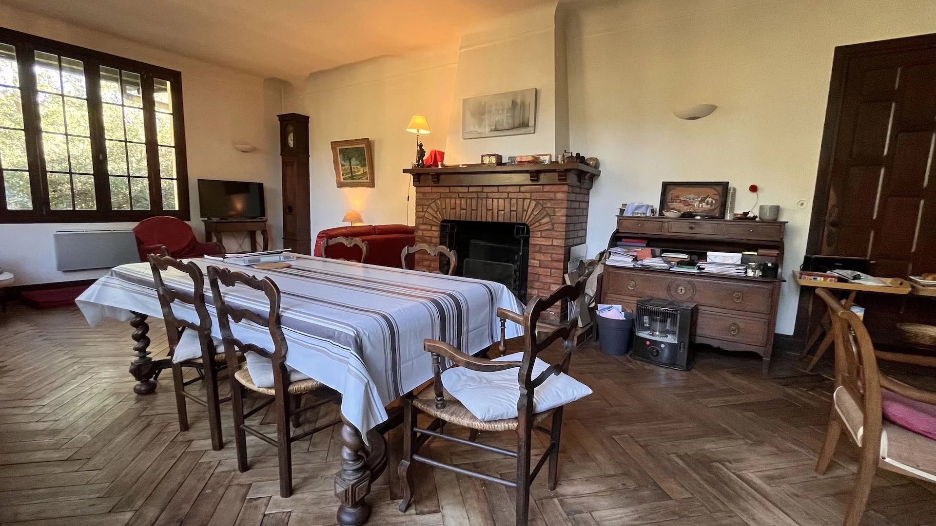 Elle est composée d'un salon/salle à manger avec une belle cheminée d'époque, une cuisine, 3 chambres, un bureau, de nombreux points d'eau, 2 wc ainsi que des combles d'environ 80 m2.