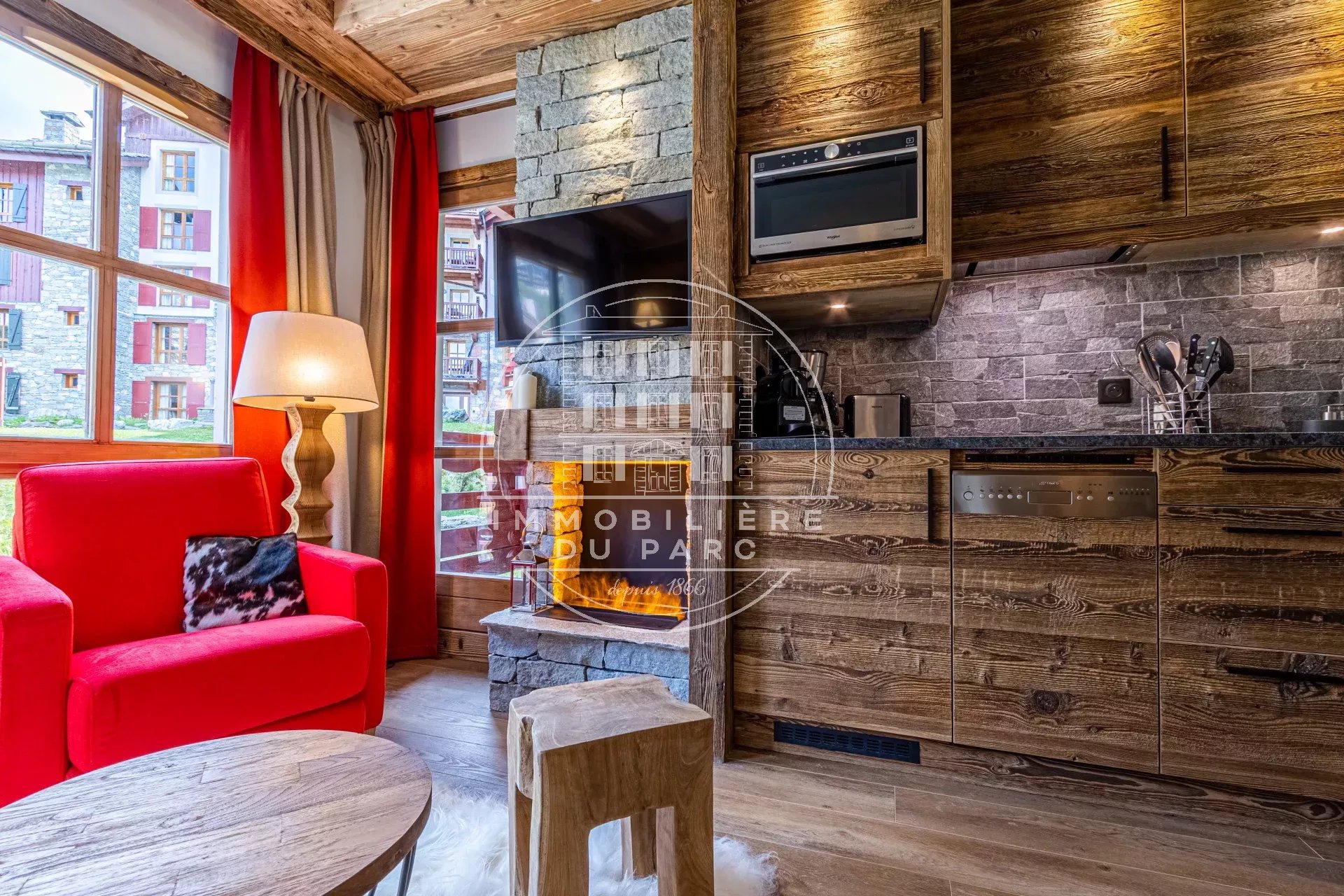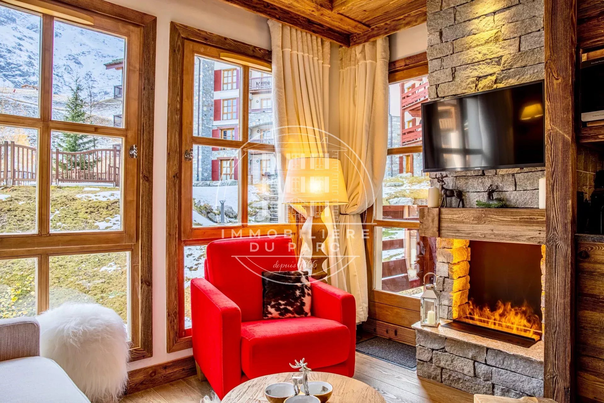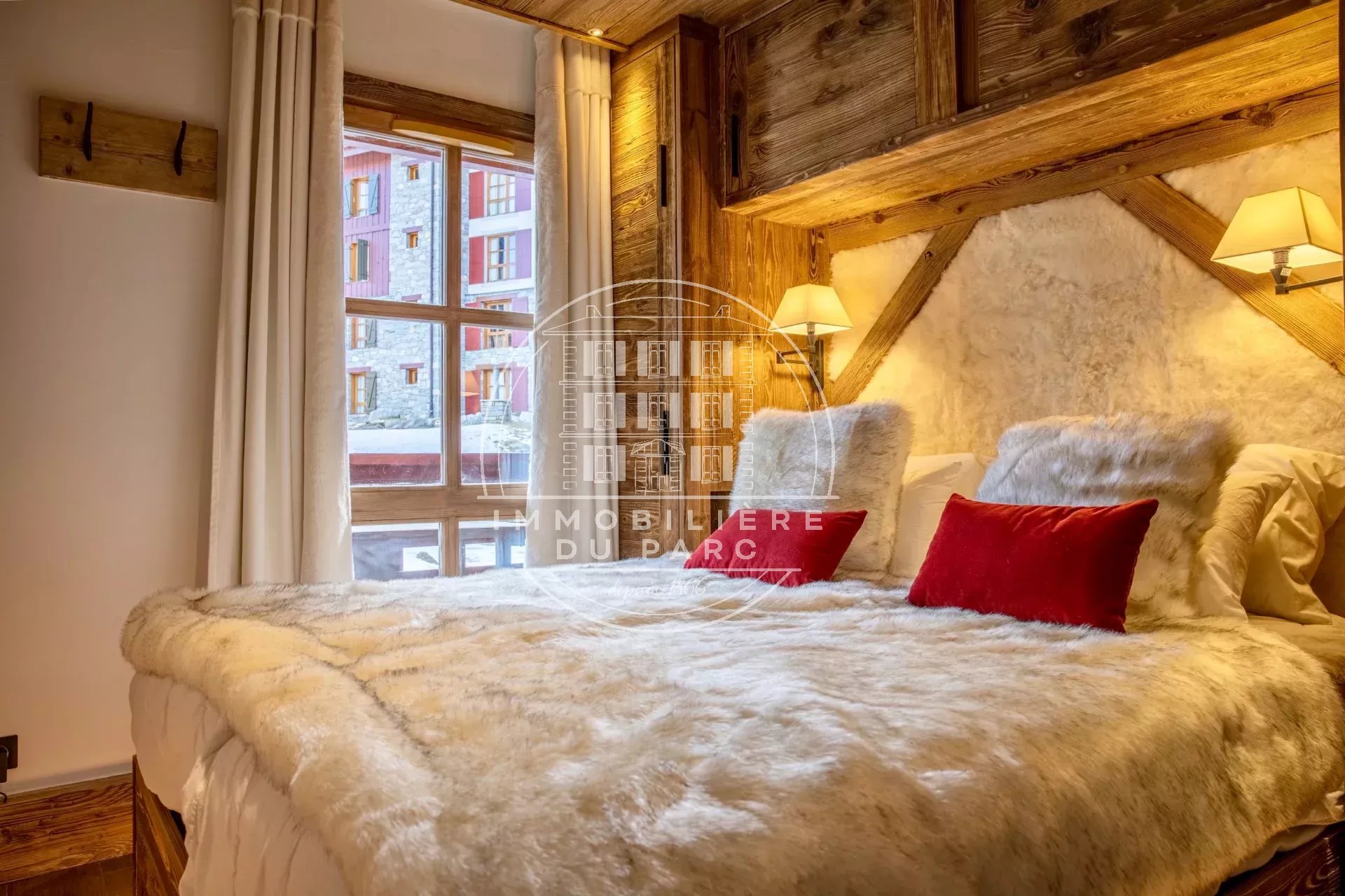 Ce magnifique appartement, entièrement rénové pour 2 à 4 personnes dans un esprit chalet de prestige, situé dans la résidence 5* Le Hameau du Glacier, propose des prestations rares et uniques au village. Le séjour exposé Sud bénéficie d'un canapé-lit, TV, ampli home cinéma, lecteur DVD, et cheminée à vapeur d'eau. Balcon avec vue sur les montagnes et les pistes de ski. La cuisine est entièrement équipée. La chambre disposant de 2 lits 80x 200 transformables en lit king size sur demande est équipée d’une TV grand écran et d’un lecteur DVD. Elle ouvre sur un couloir desservant un WC séparé et une salle de bains avec baignoire balnéothérapie. Un sèche-gants dans le placard de l’entrée vous permettra de sécher vos gants de ski ou chaussures après-skis. Ce magnifique appartement complète la féérie du village.