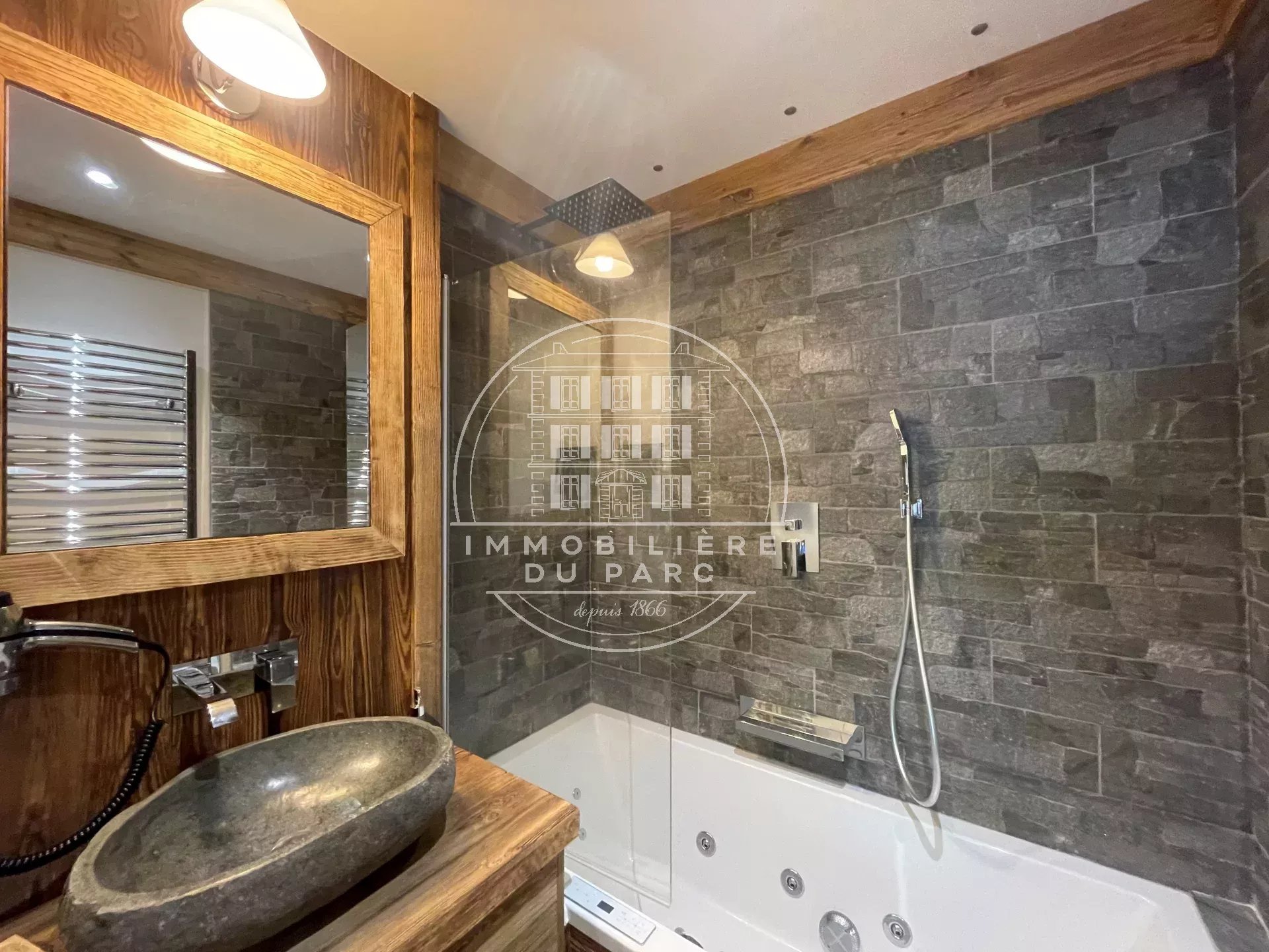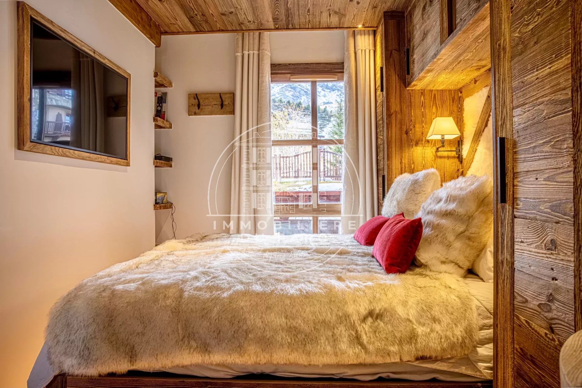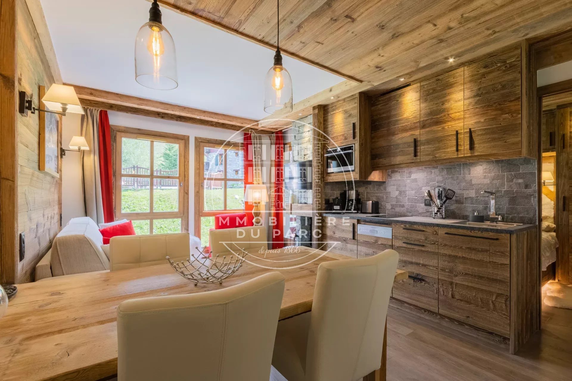 Ce magnifique appartement, entièrement rénové pour 2 à 4 personnes dans un esprit chalet de prestige, situé dans la résidence 5* Le Hameau du Glacier, propose des prestations rares et uniques au village. Le séjour exposé Sud bénéficie d'un canapé-lit, TV, ampli home cinéma, lecteur DVD, et cheminée à vapeur d'eau. Balcon avec vue sur les montagnes et les pistes de ski. La cuisine est entièrement équipée. La chambre disposant de 2 lits 80x 200 transformables en lit king size sur demande est équipée d’une TV grand écran et d’un lecteur DVD. Elle ouvre sur un couloir desservant un WC séparé et une salle de bains avec baignoire balnéothérapie. Un sèche-gants dans le placard de l’entrée vous permettra de sécher vos gants de ski ou chaussures après-skis. Ce magnifique appartement complète la féérie du village.