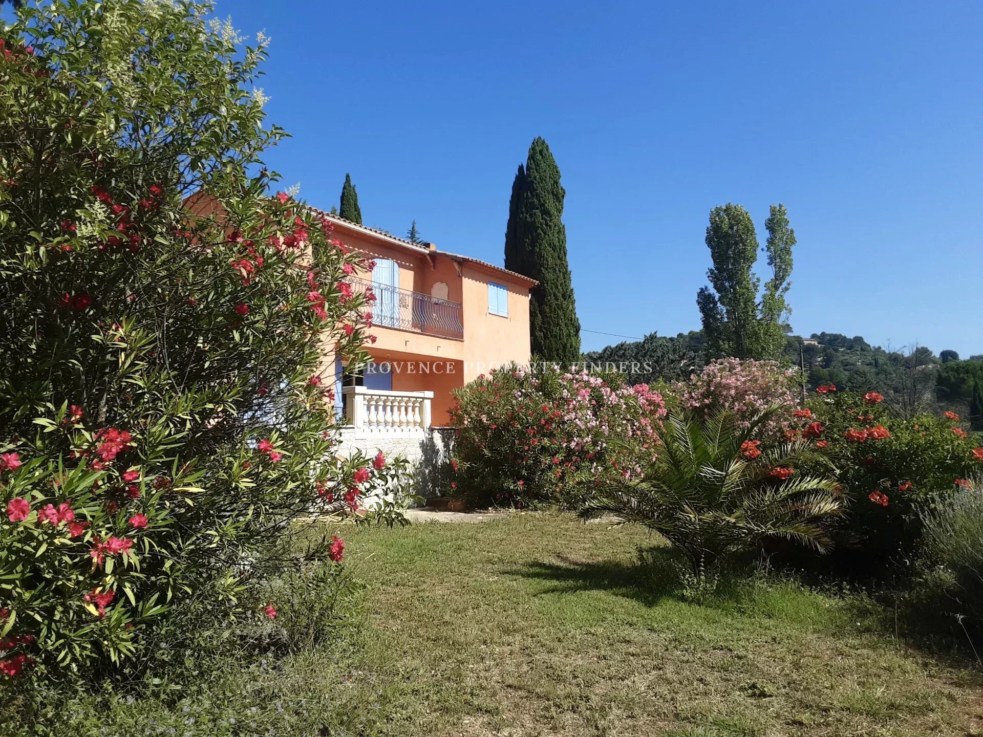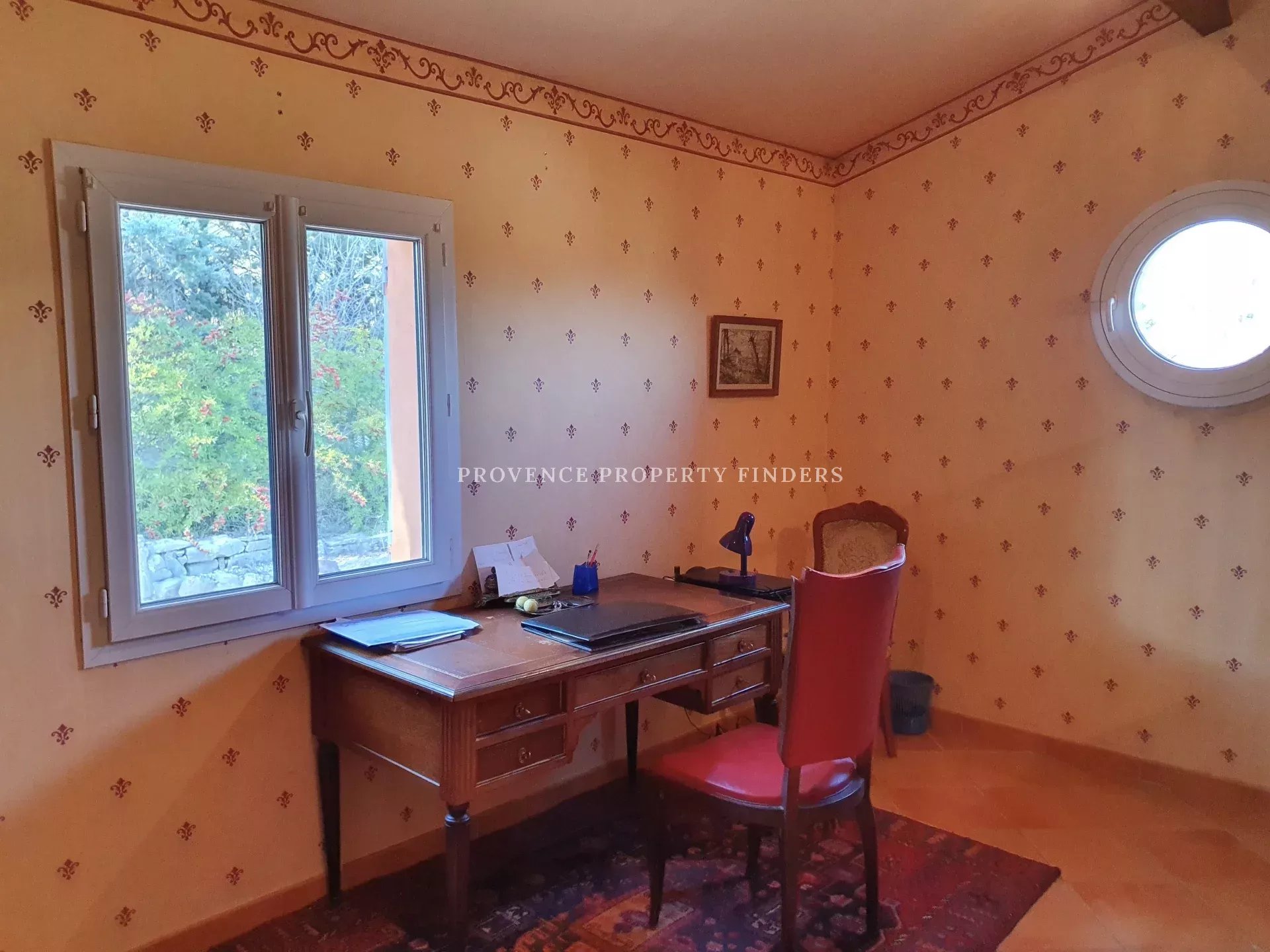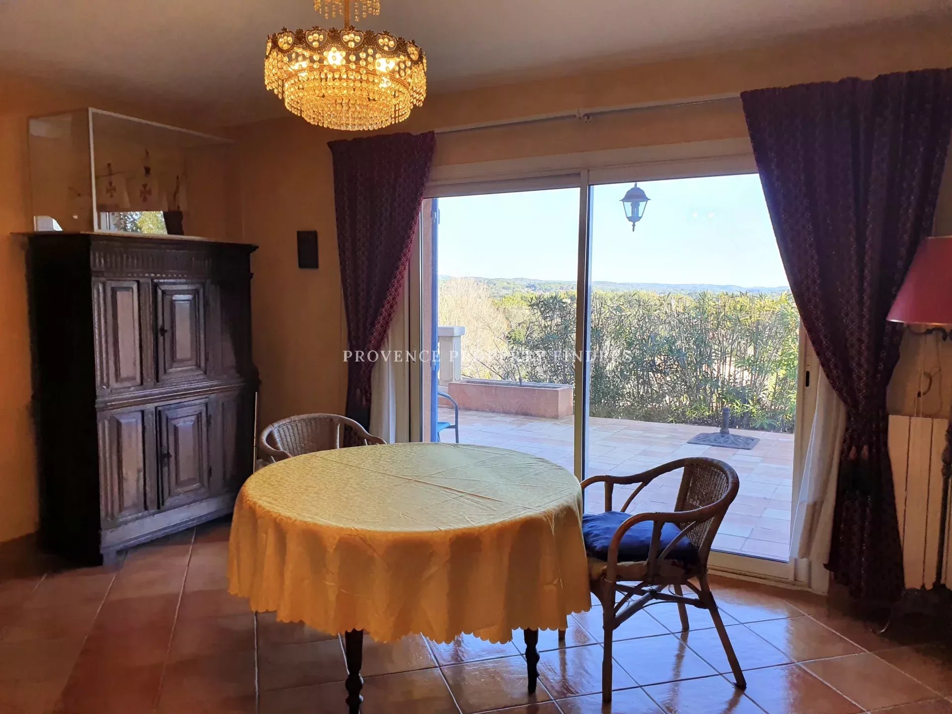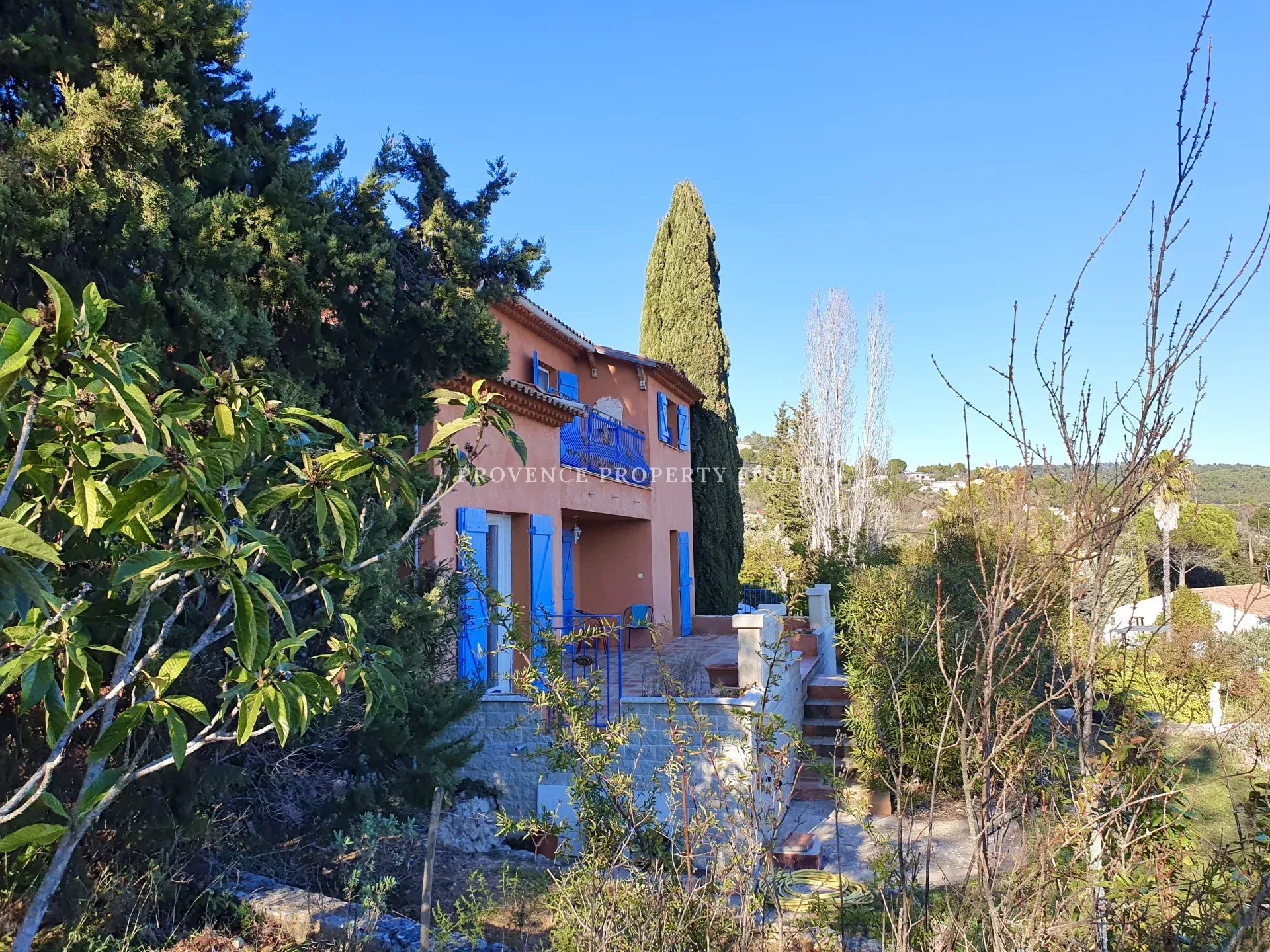 Villa (env. 180m2) avec de très belles vues, située à proximité du beau village de Cotignac. Le jardin, un parc , avec une clôture intégrale avec eucalyptus , figuiers , amandier ,pyracanthas, lauriers roses, lavandes , romarins, d'environ 4500 m2 vous offre une intimité totale. Au rez-de-chaussée, hall d'entrée, cuisine ouvrant sur la terrasse extérieure, séjour d'environ 40m2 avec cheminée, 1 chambre, une salle de bains, 1 buanderie. Au premier étage, 2 chambres, une salle de bain, un spacieux bureau pouvant être aménagé en 4ème chambre et une mezzanine. Piscine (chlore) 5x10, forme naturelle. Garage et carport supplémentaire. l’assainissement entièrement à neuf.