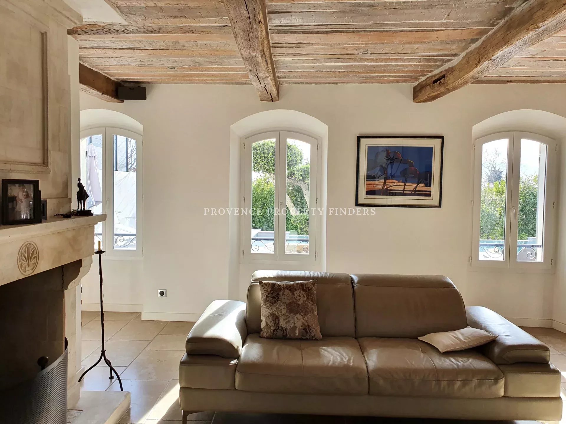 Un séjour ensoleillé avec cheminée et cuisine qui s'ouvre sur le terrace et la piscine.