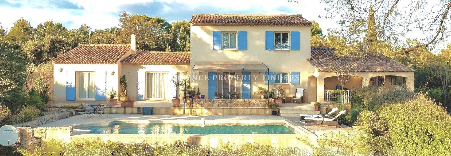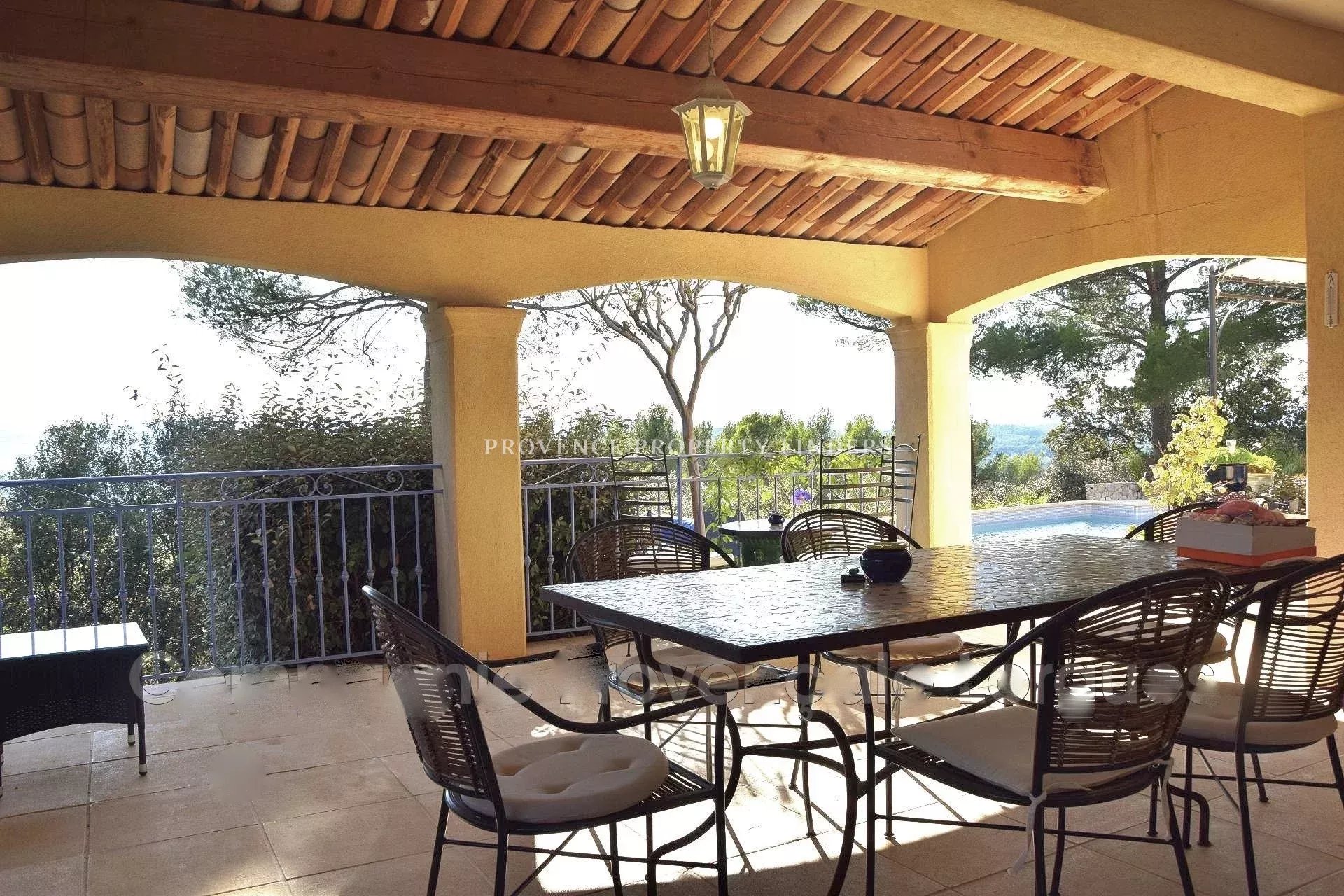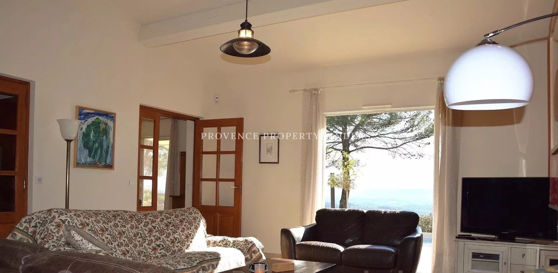 Belle villa provençale d'environ 180 M² en excellent état. Belle vue panoramique. Rez-de-chaussée : Entrée, spacieux séjour ensoleillé avec cheminée, salle à manger, cuisine moderne, buanderie, une suite parentale (chambre, salle de bains, dressing/bureau), toilettes invités, atelier/studio et garage A l'étage 3 chambres et une salle de bain avec WC Belle terrasse avec cuisine extérieure. Piscine chauffée.