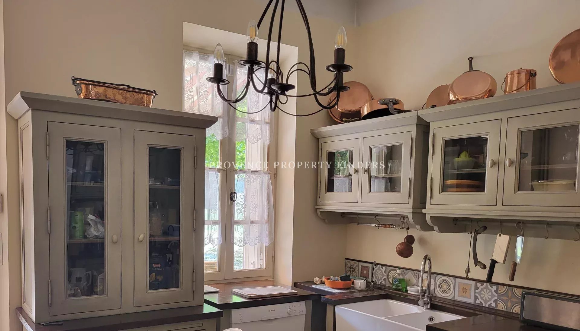 La cuisine campagnarde s'ouvre sur la terrasse extérieure et son joli jardin verdoyant et luxuriant.