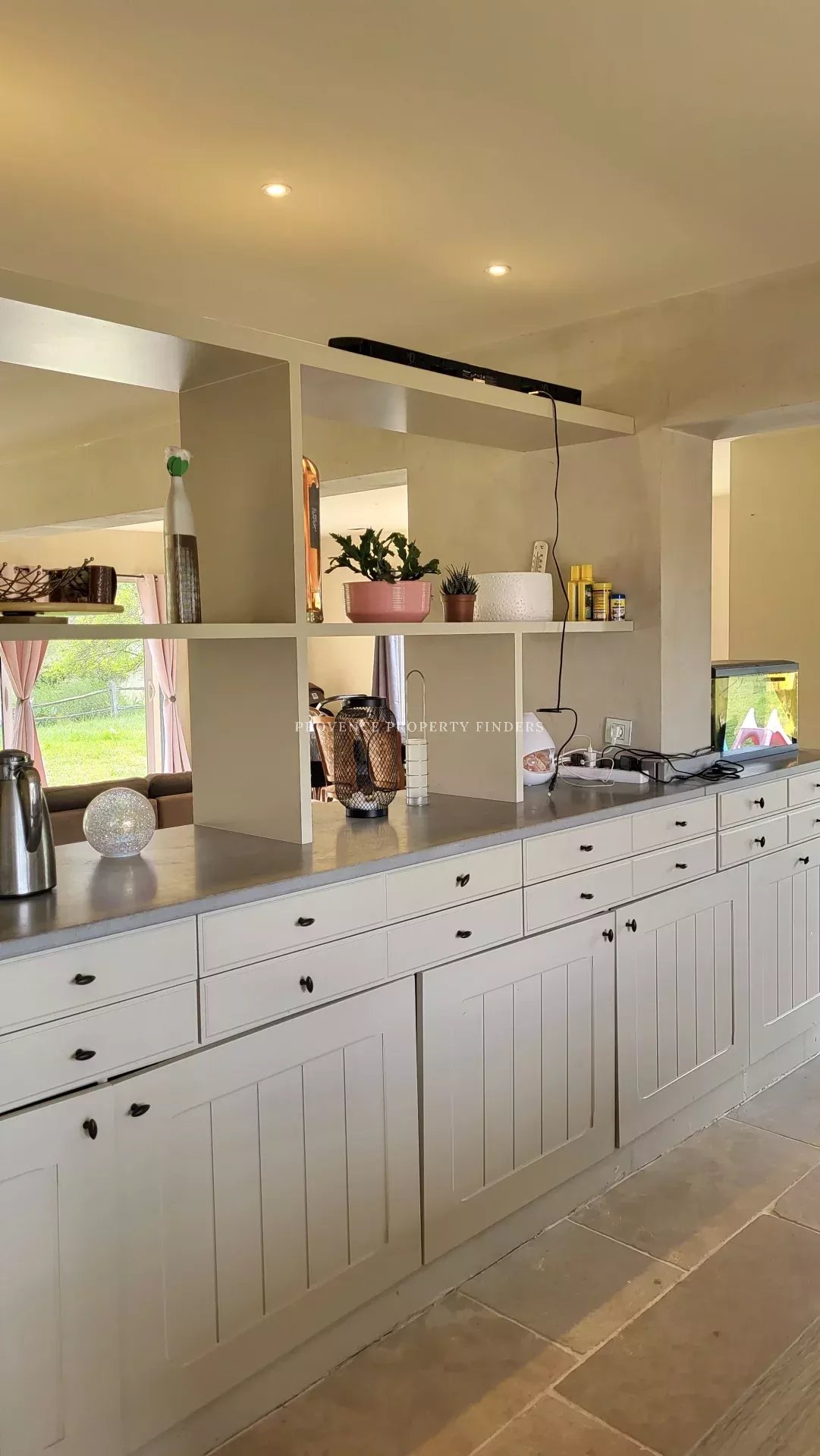 La maison principale, vous offre un grand séjour ensoleillé avec vue sur le jardin. Une cheminée, une cuisine ouverte et une buanderie.
