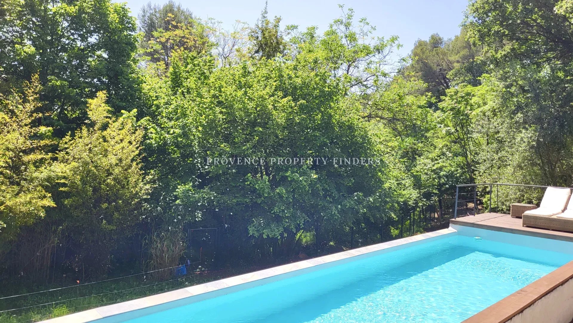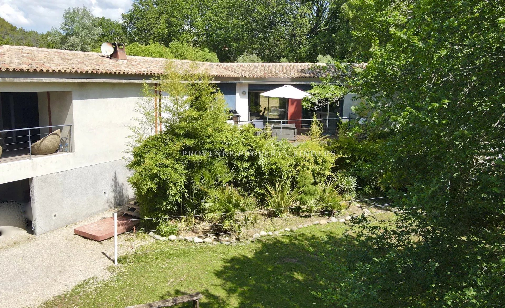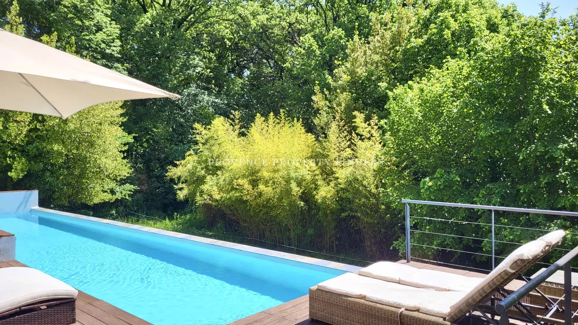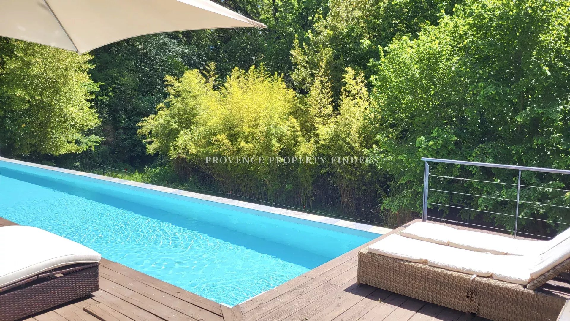 une maison d'architecte à vendre dans le sud de la France. Ambiance tropicale, 4 chambres, 3 salles de bains, cuisine ouverte, salon avec cheminée, salle à manger, belle terrasse donnant sur le jardin, l'étang et la piscine. Climatisation dans toutes les pièces, cuisine équipée, une cave et un grand garage. La maison est actuellement occupée et divisée en deux parties. Une moitié est transformée en appartement pour un membre de la famille, comprenant 2 chambres, 2 salles de douche et un espace de vie ouvert avec kitchenette. Bel environnement calme, mais non isolé.
