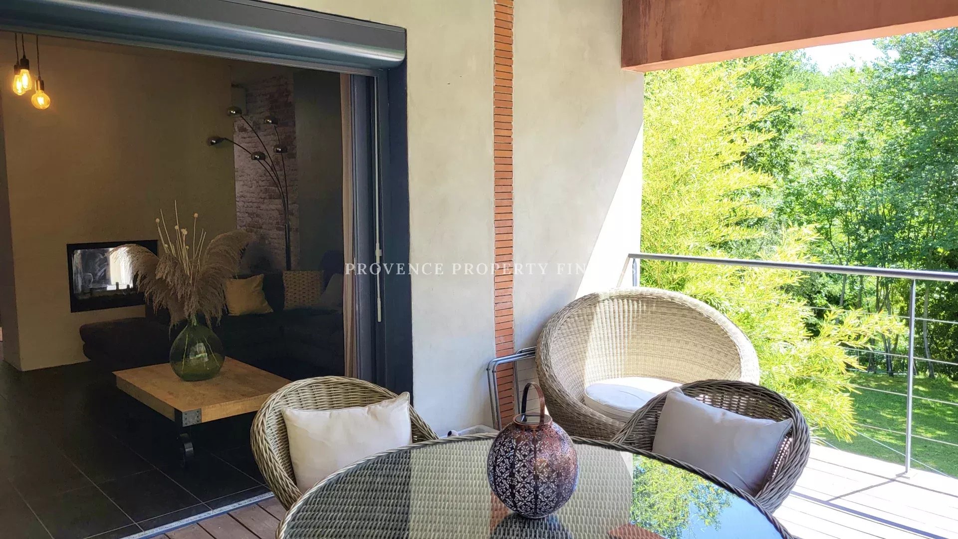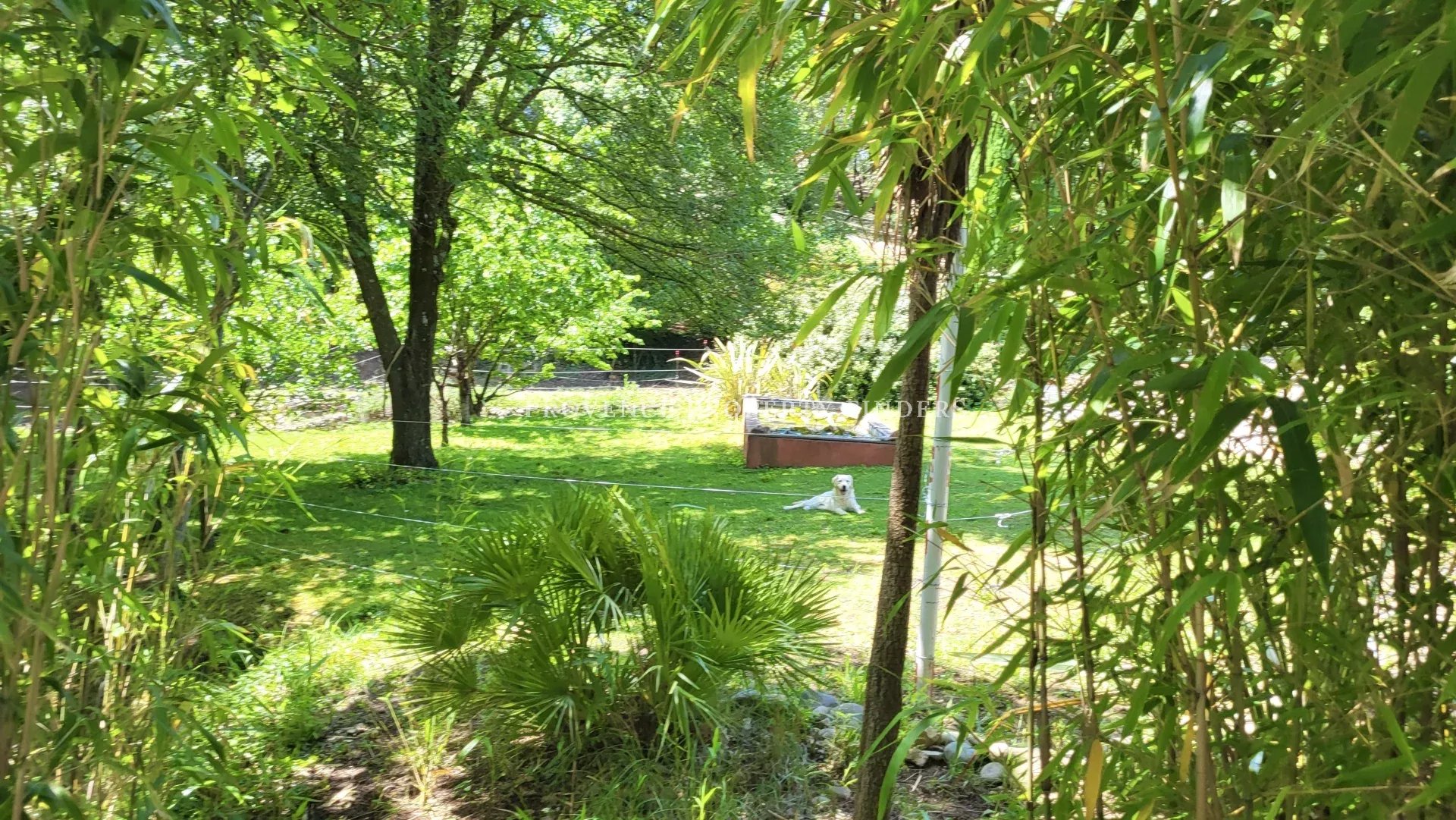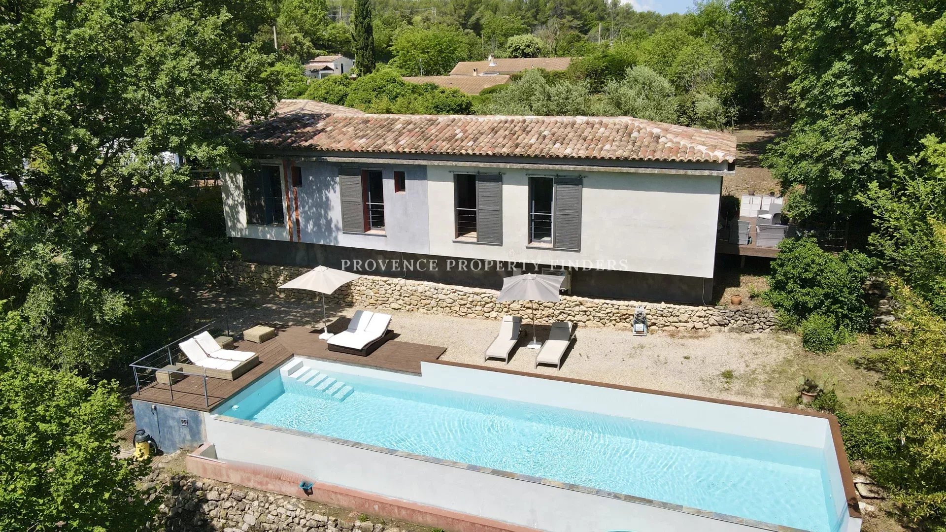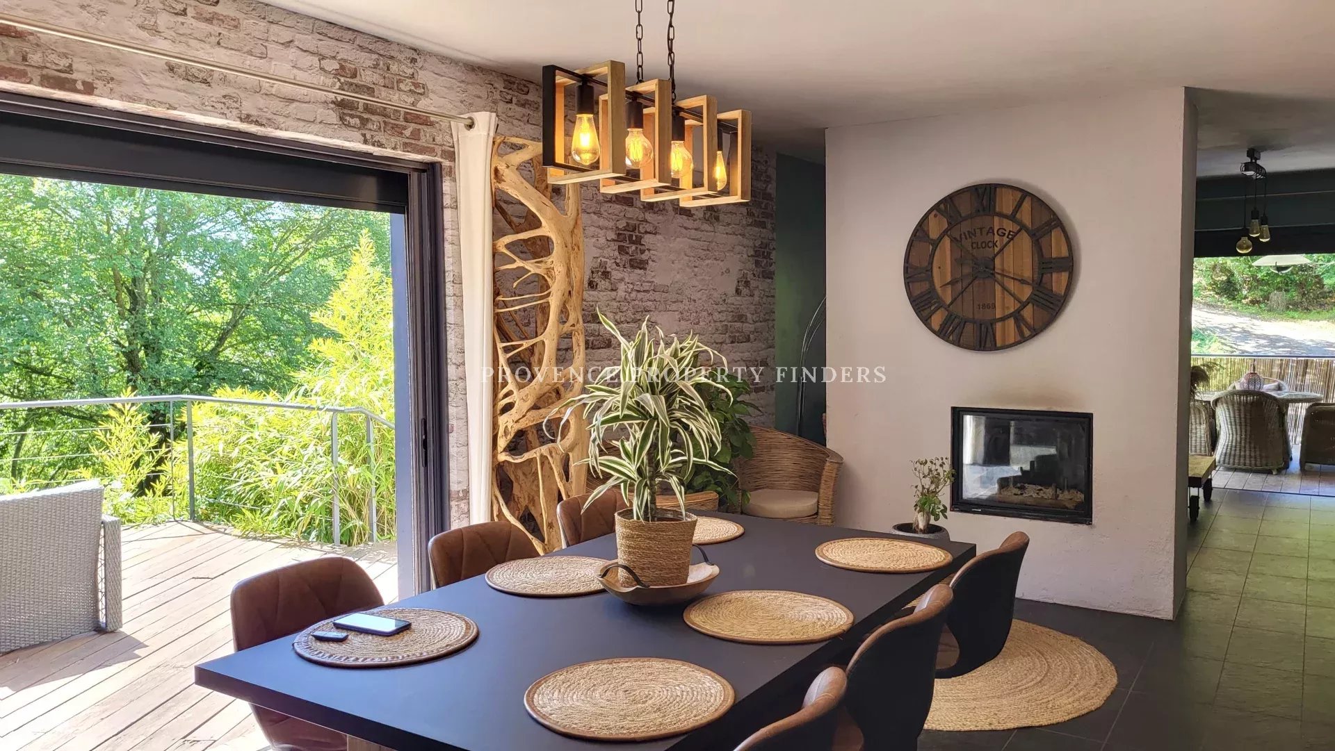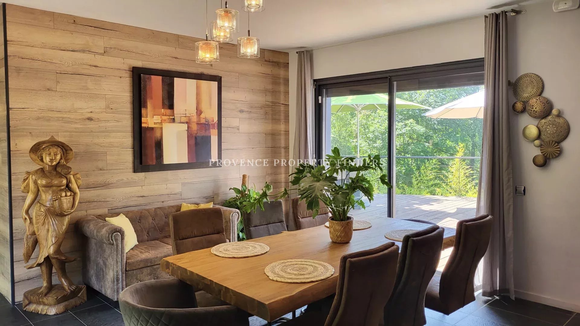 une maison d'architecte à vendre dans le sud de la France. Ambiance tropicale, 4 chambres, 3 salles de bains, cuisine ouverte, salon avec cheminée, salle à manger, belle terrasse donnant sur le jardin, l'étang et la piscine. Climatisation dans toutes les pièces, cuisine équipée, une cave et un grand garage. La maison est actuellement occupée et divisée en deux parties. Une moitié est transformée en appartement pour un membre de la famille, comprenant 2 chambres, 2 salles de douche et un espace de vie ouvert avec kitchenette. Bel environnement calme, mais non isolé.