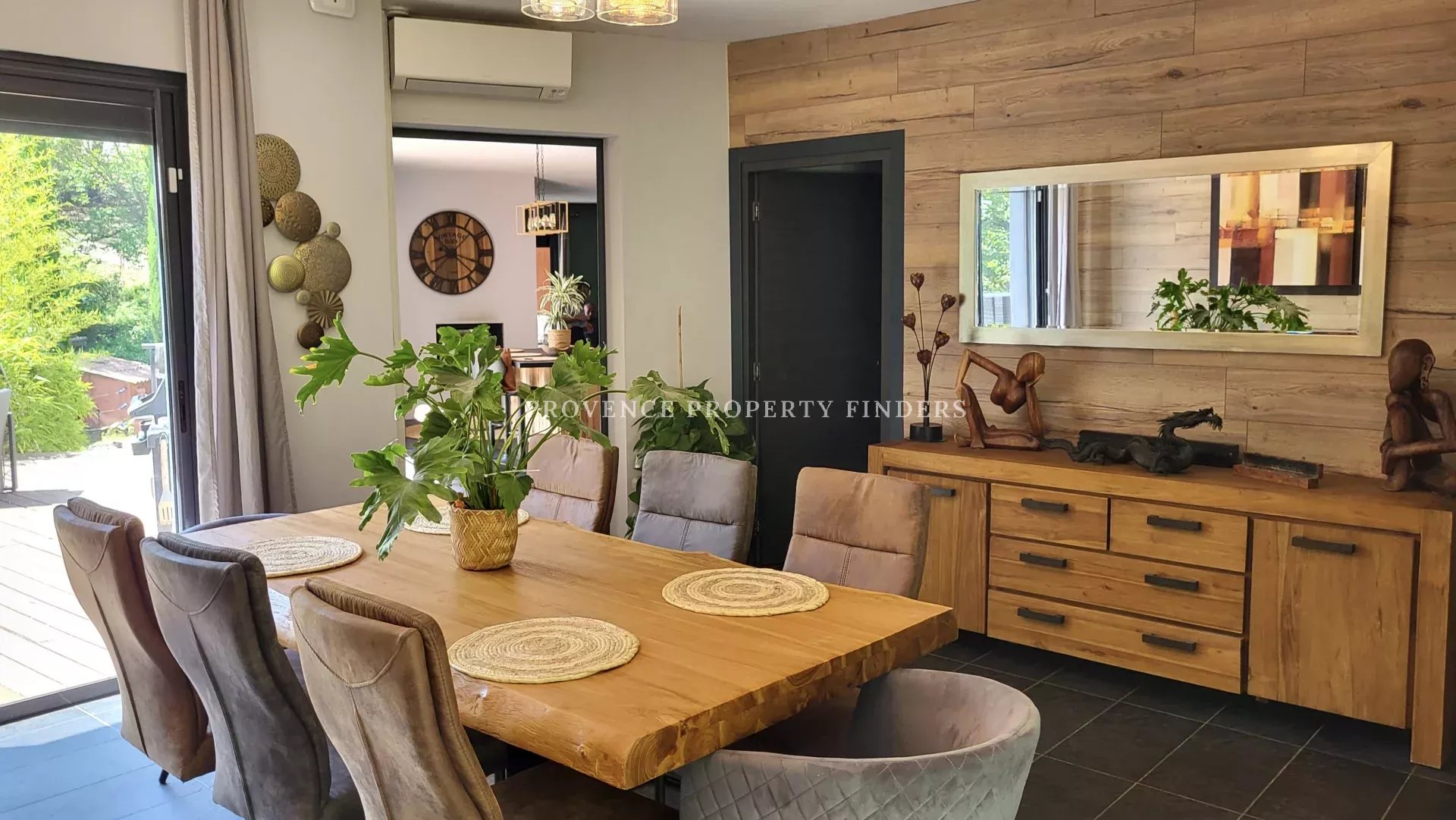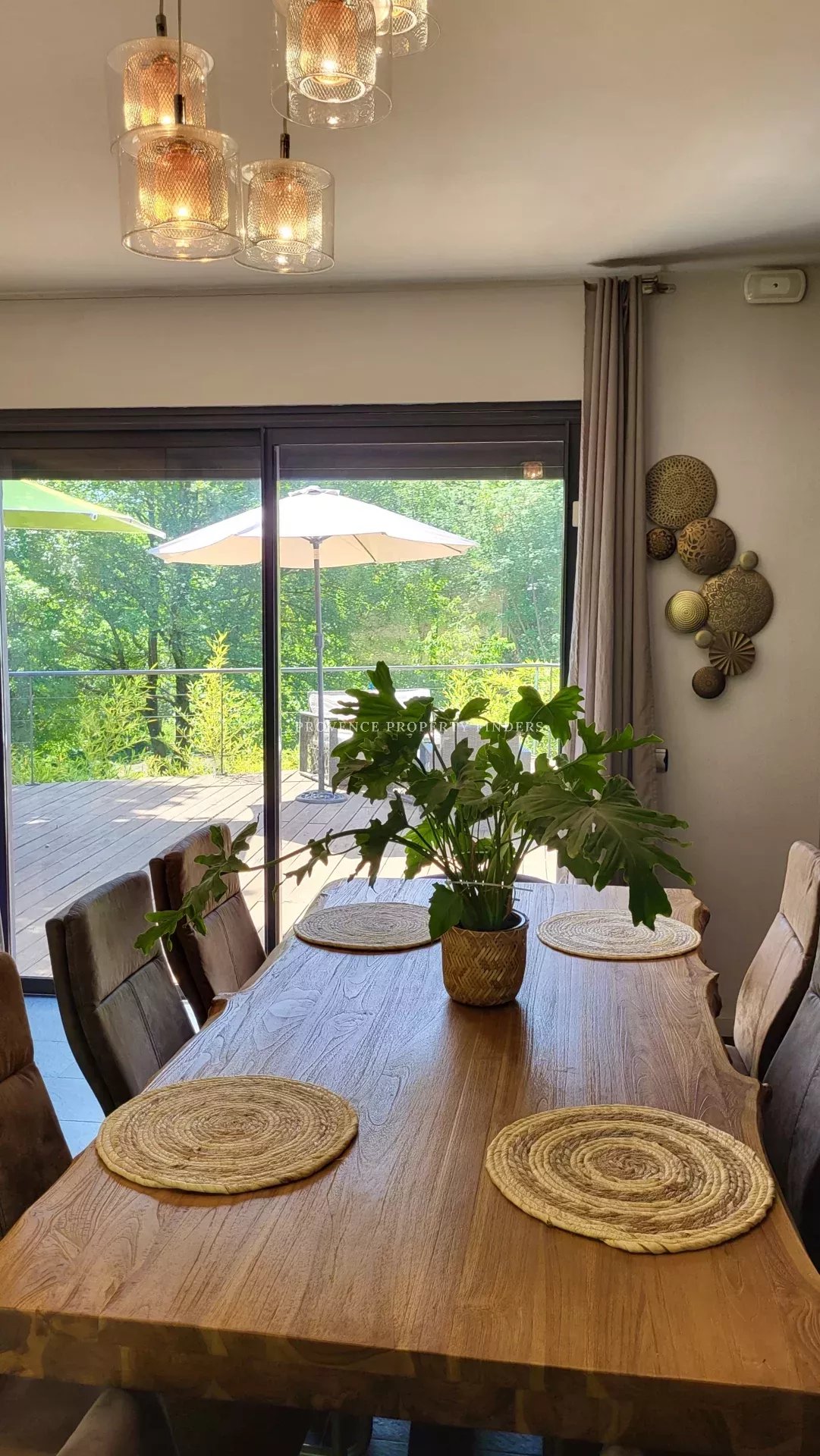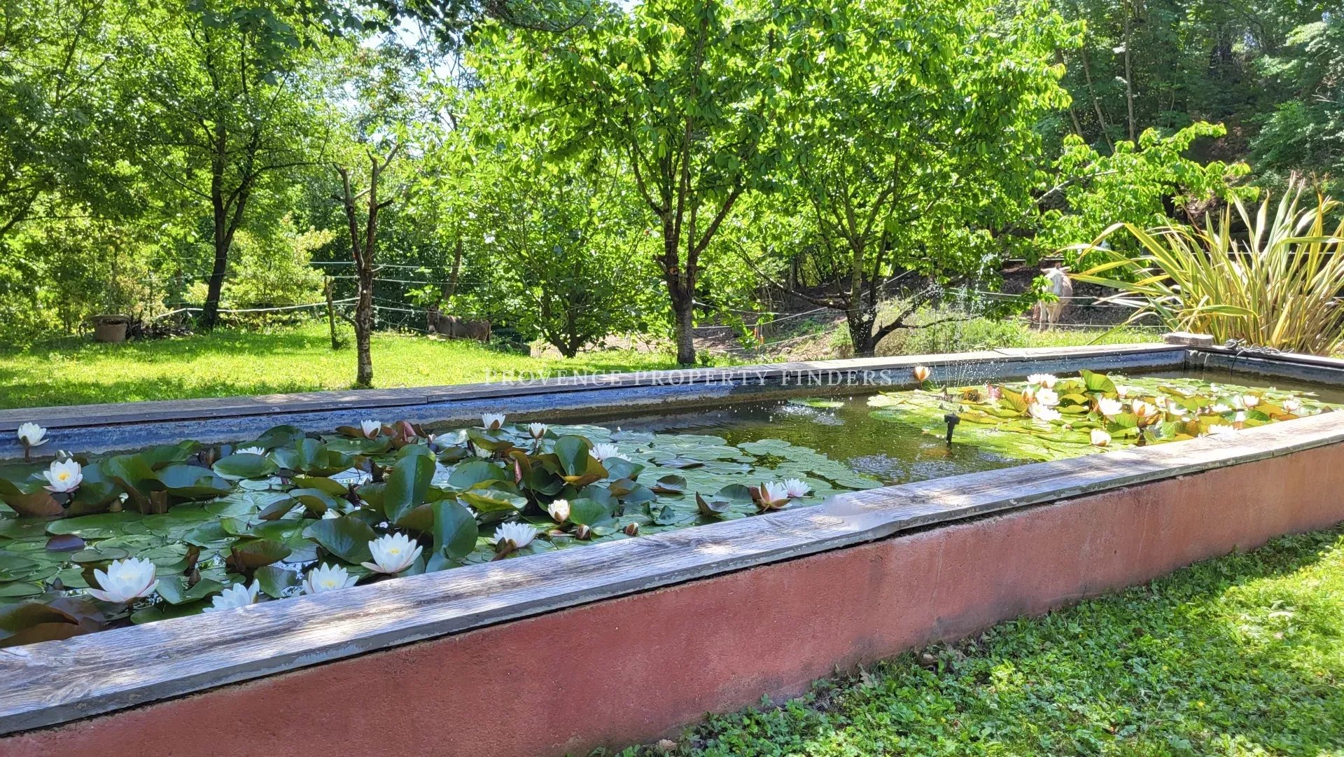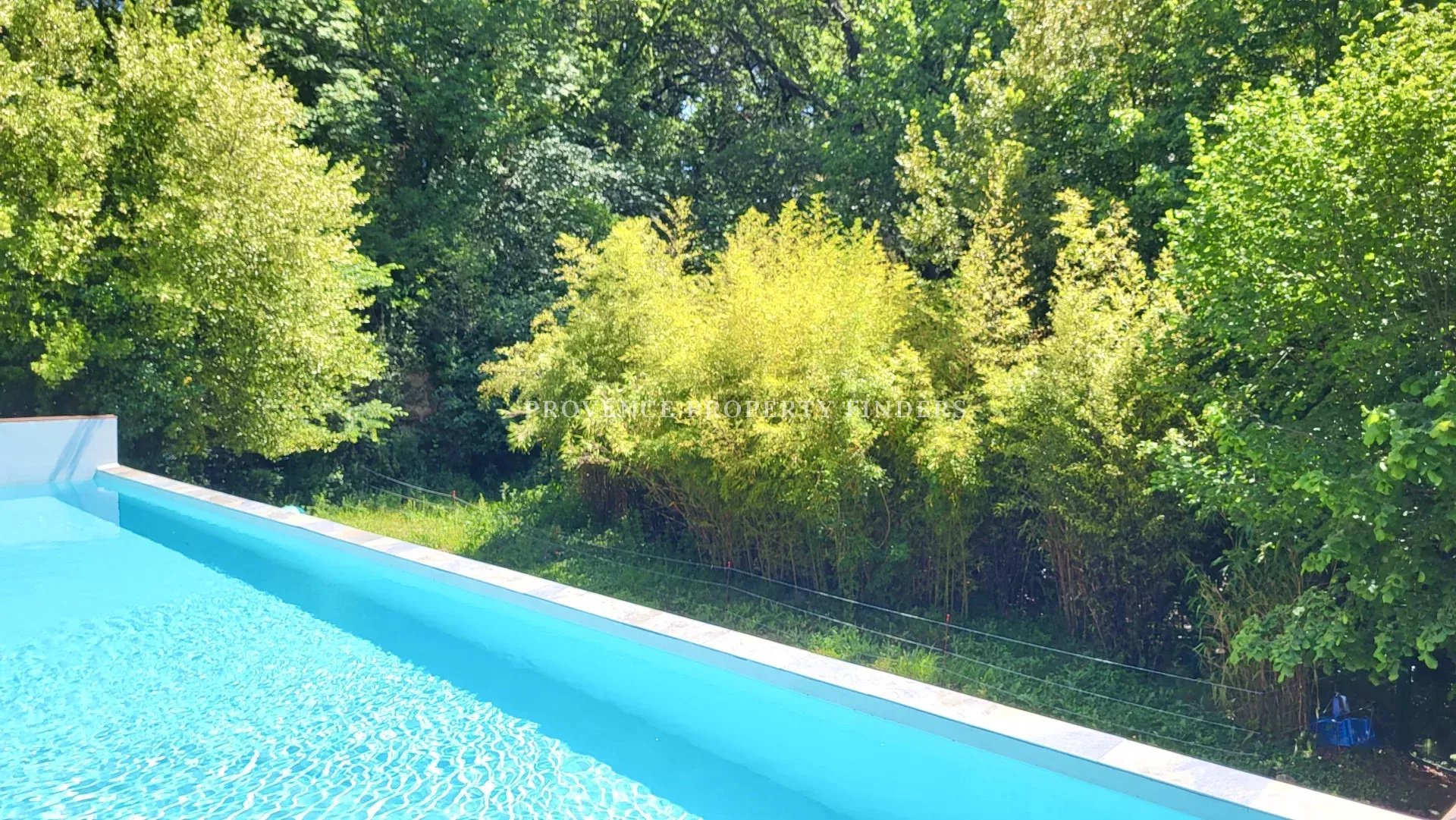 une maison d'architecte à vendre dans le sud de la France. Ambiance tropicale, 4 chambres, 3 salles de bains, cuisine ouverte, salon avec cheminée, salle à manger, belle terrasse donnant sur le jardin, l'étang et la piscine. Climatisation dans toutes les pièces, cuisine équipée, une cave et un grand garage. La maison est actuellement occupée et divisée en deux parties. Une moitié est transformée en appartement pour un membre de la famille, comprenant 2 chambres, 2 salles de douche et un espace de vie ouvert avec kitchenette. Bel environnement calme, mais non isolé.