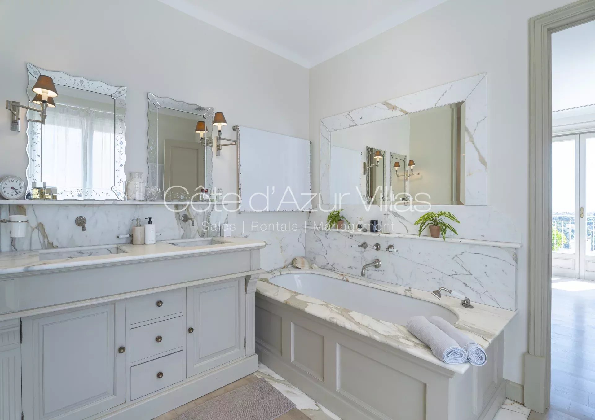 - Une suite parentale spacieuse, exposée sud et ouest, avec dressing séparé, salle de bains attenante (douche, baignoire, WC) et balcon privé donnant sur le jardin et la mer
