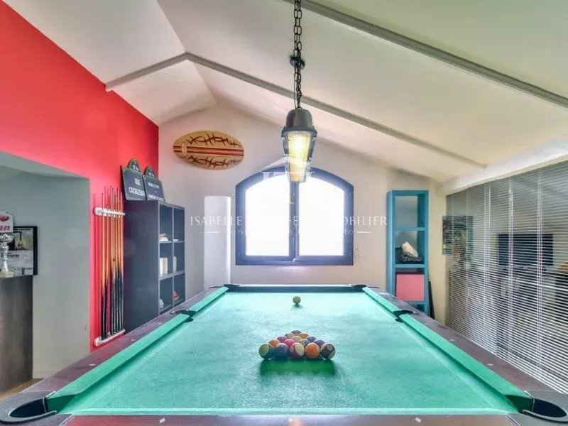 Etage supérieur : 5 chambres dont une MASTER chambre avec son Dressing et salle de douche ; Plus 3 salles d'eau, Grands placards et 2 toilettes. Salle de jeux avec billard, salon/chambres. Sols en parquet chêne.