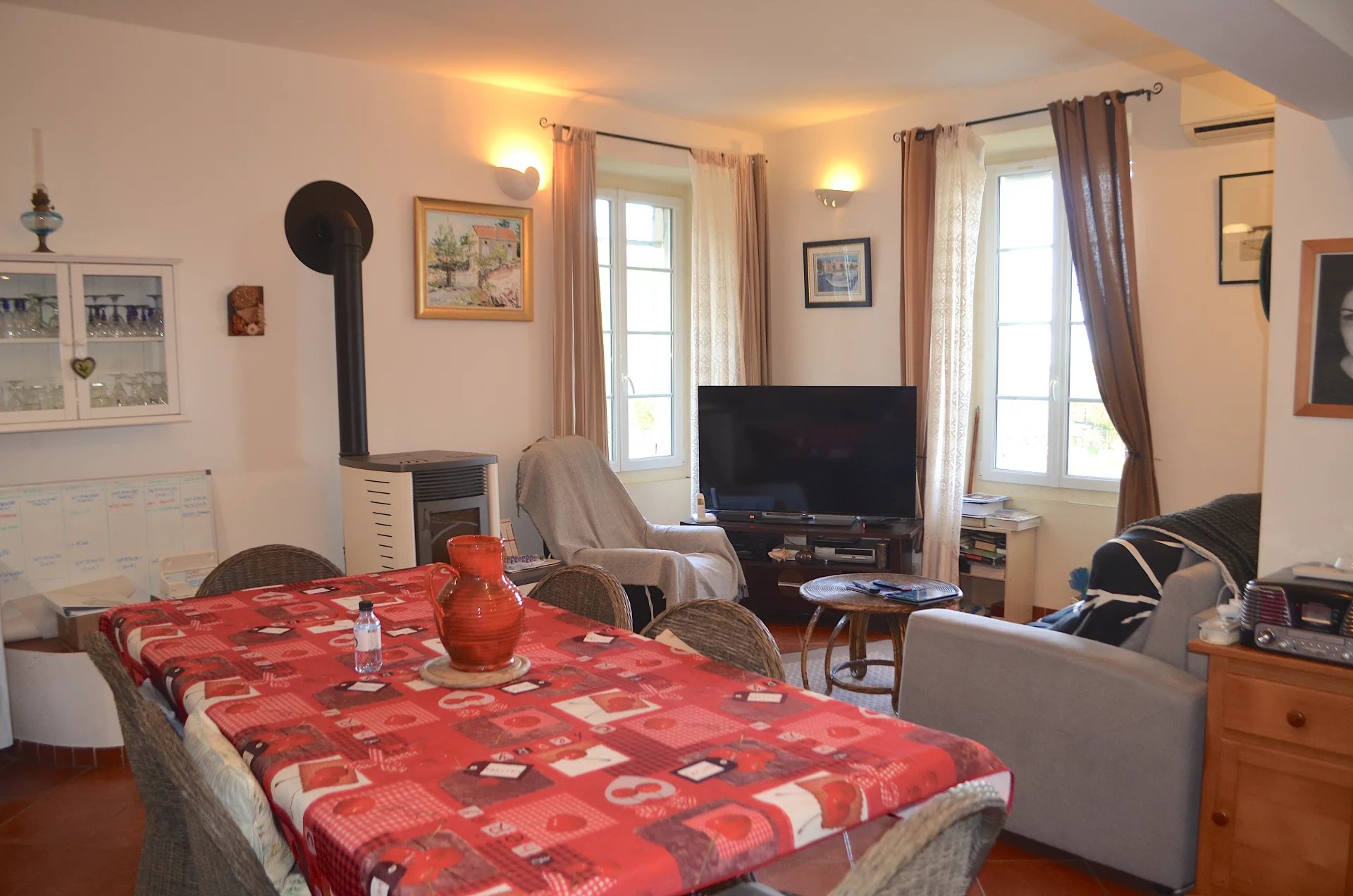 -Cette maison dispose de 8 chambres, un bureau, un atelier, un poële à granules, de la climatisation, du double vitrage pvc, dune parcelle de terrain de 555M2, la fibre.