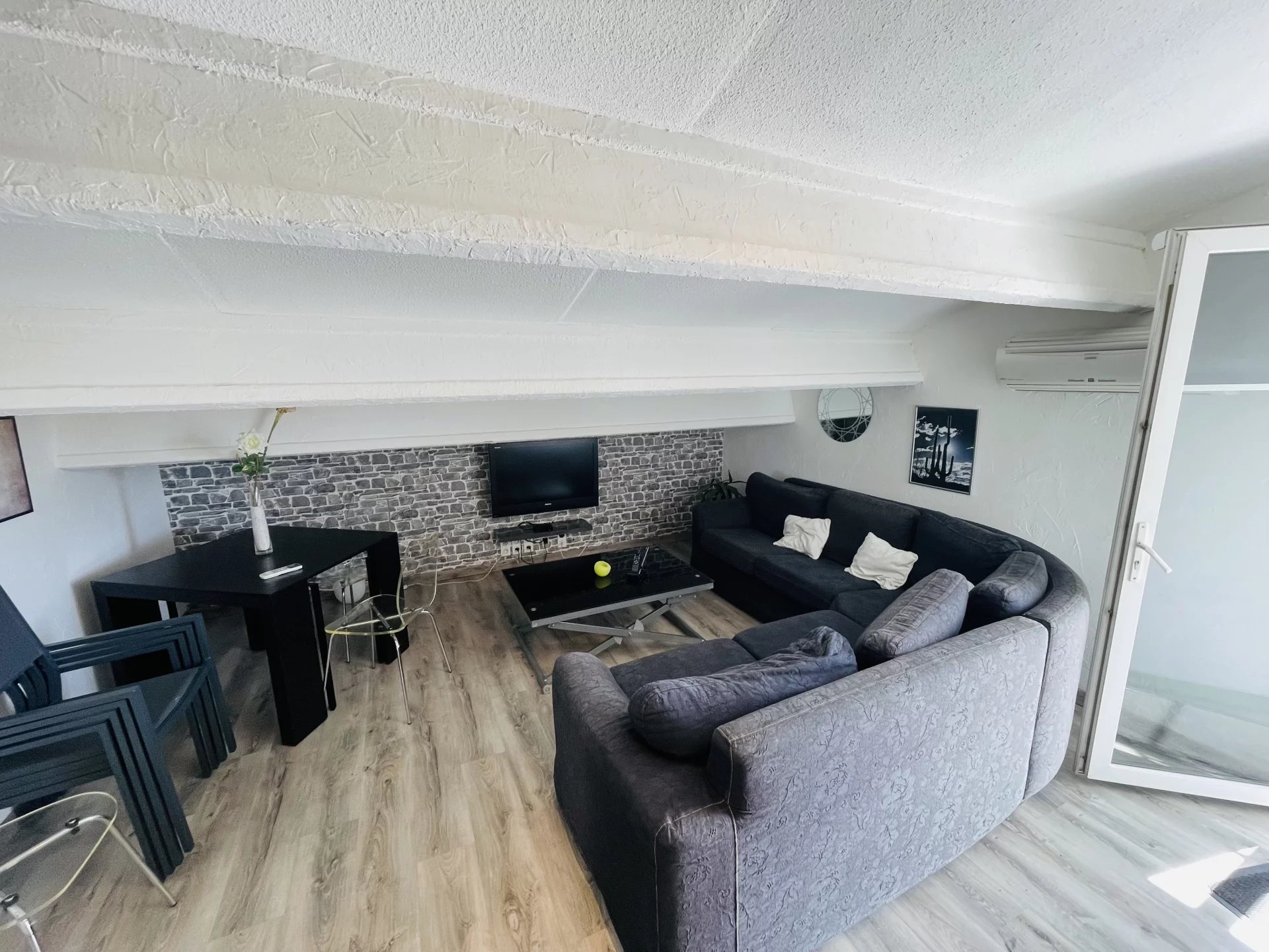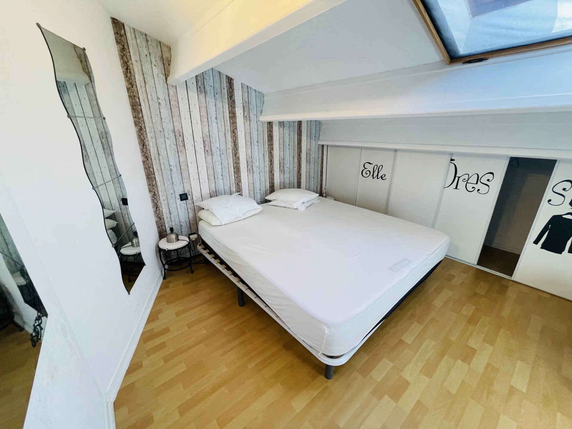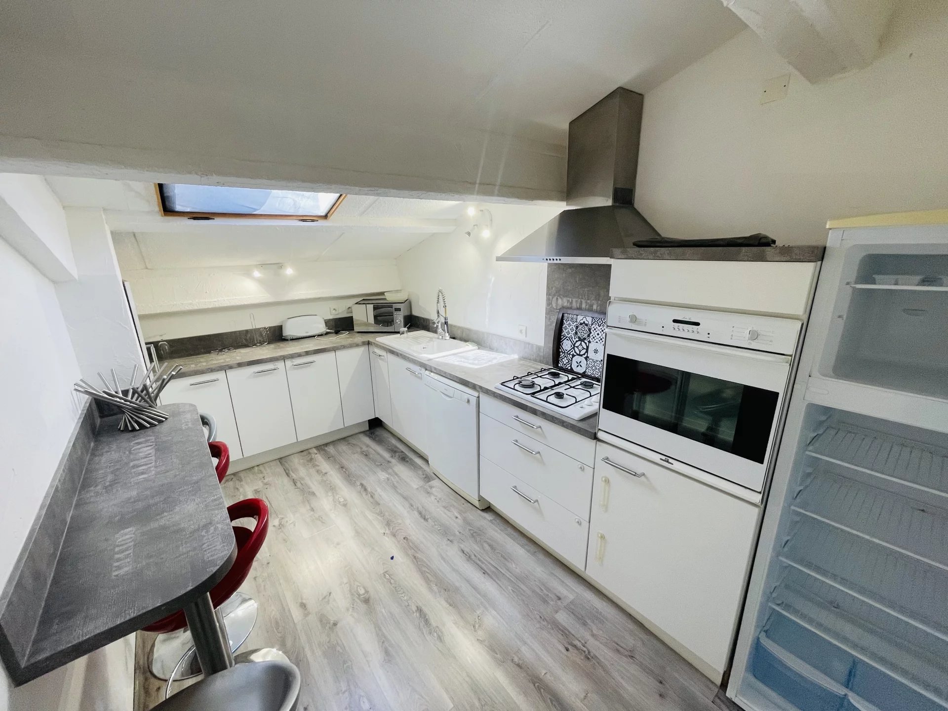 Au premier étage, le dernier appartement se compose d'un séjour salon mansardé, d'une cuisine avec cellier attenant, de 2 chambres, d'une salle d'eau. Une grande terrasse orientée sud vient compléter ce logement.