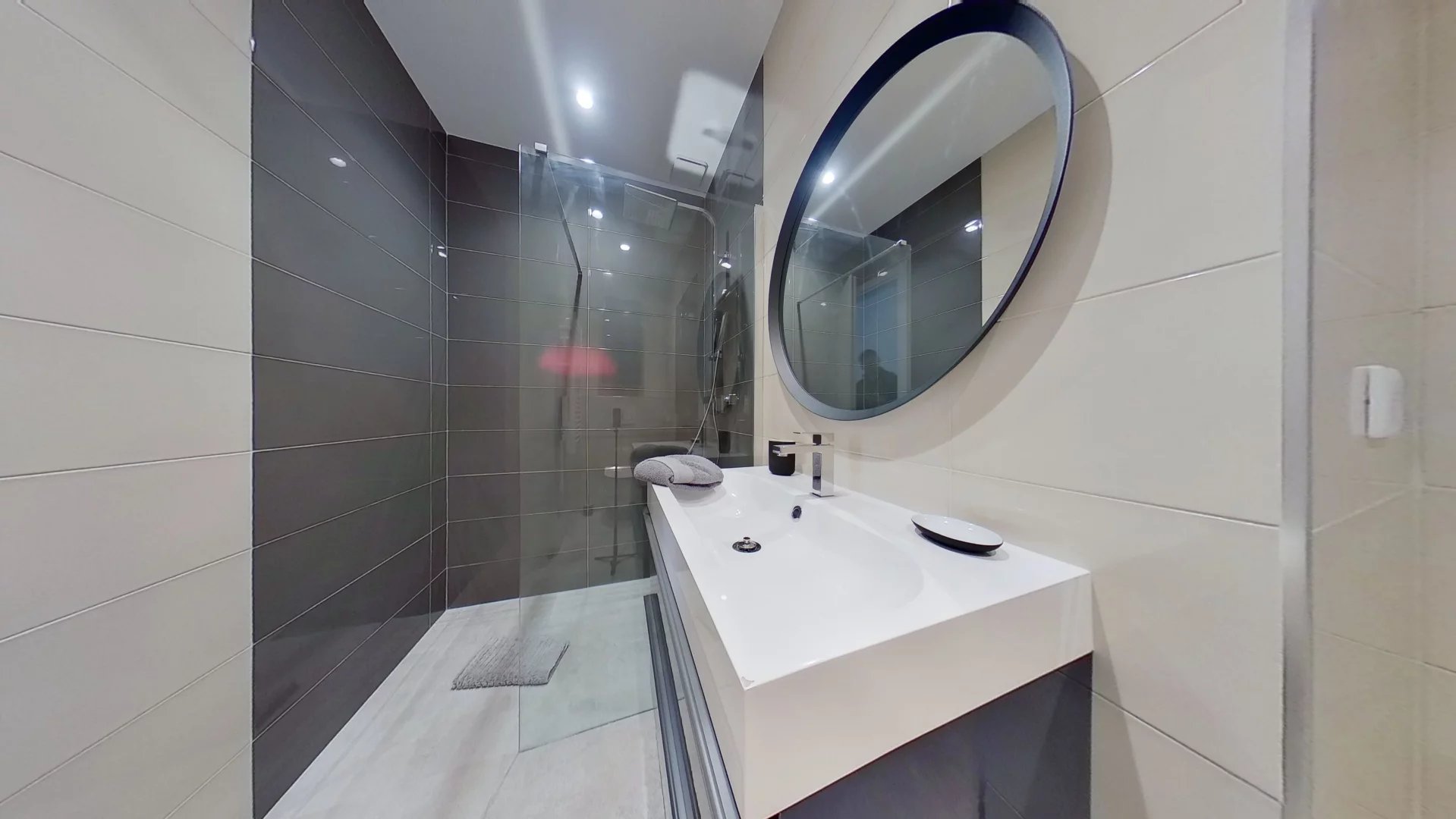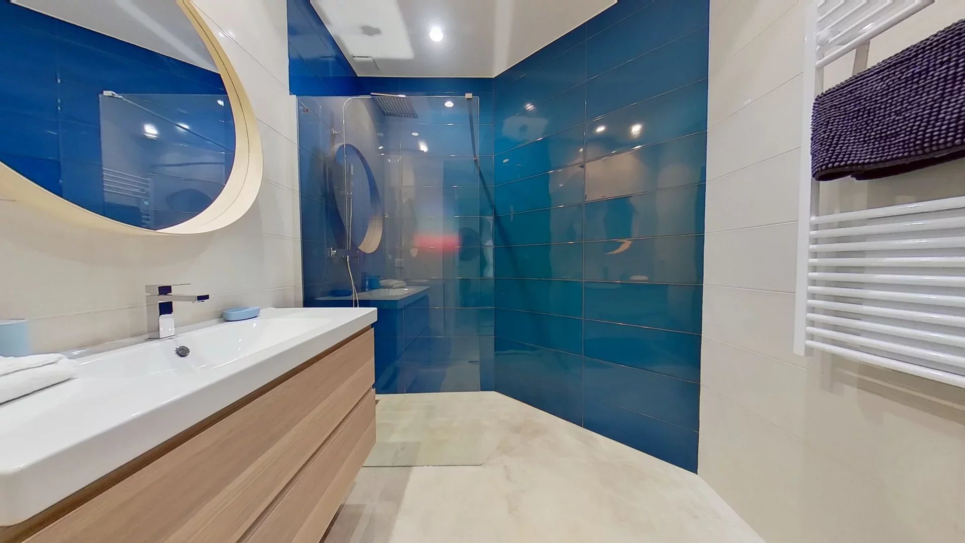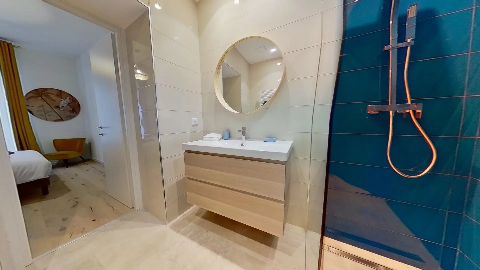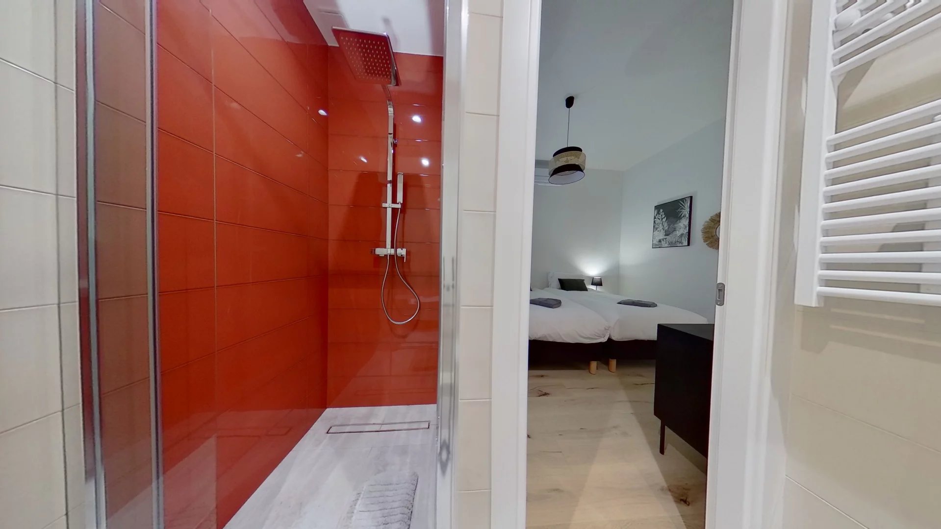 Pour l’espace nuit, nous avons une première belle chambre avec sa salle d’eau. Nous trouvons également une seconde tres grande chambre, toujours avec sa salle d’eau réservée, et petite surprise cachée derrière la verrière, à savoir un escalier descendant, distribuant (en -1) sur une troisième chambre.