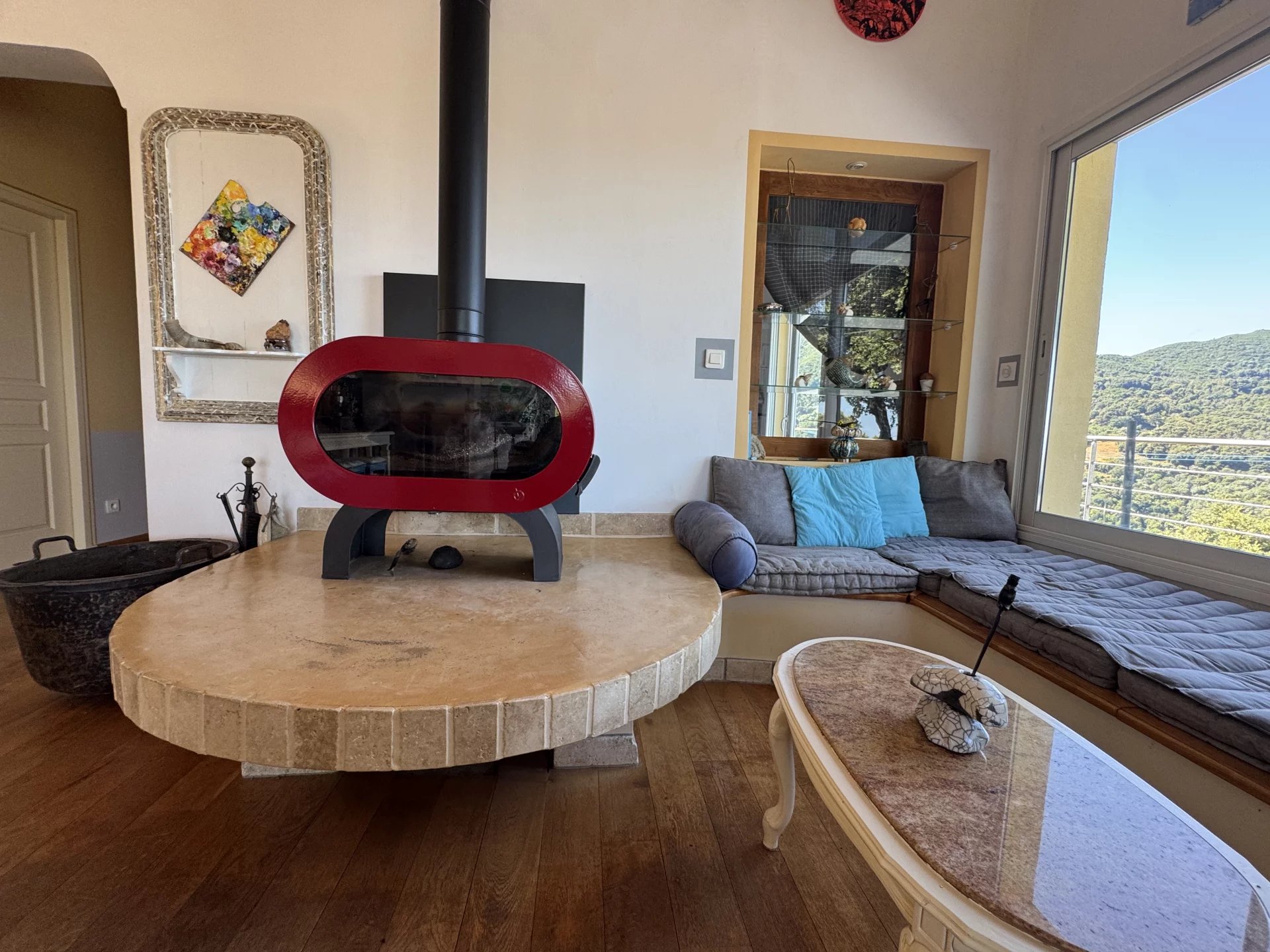 Un vaste et lumineux séjour avec poêle à bois donnant sur une terrasse vue mer