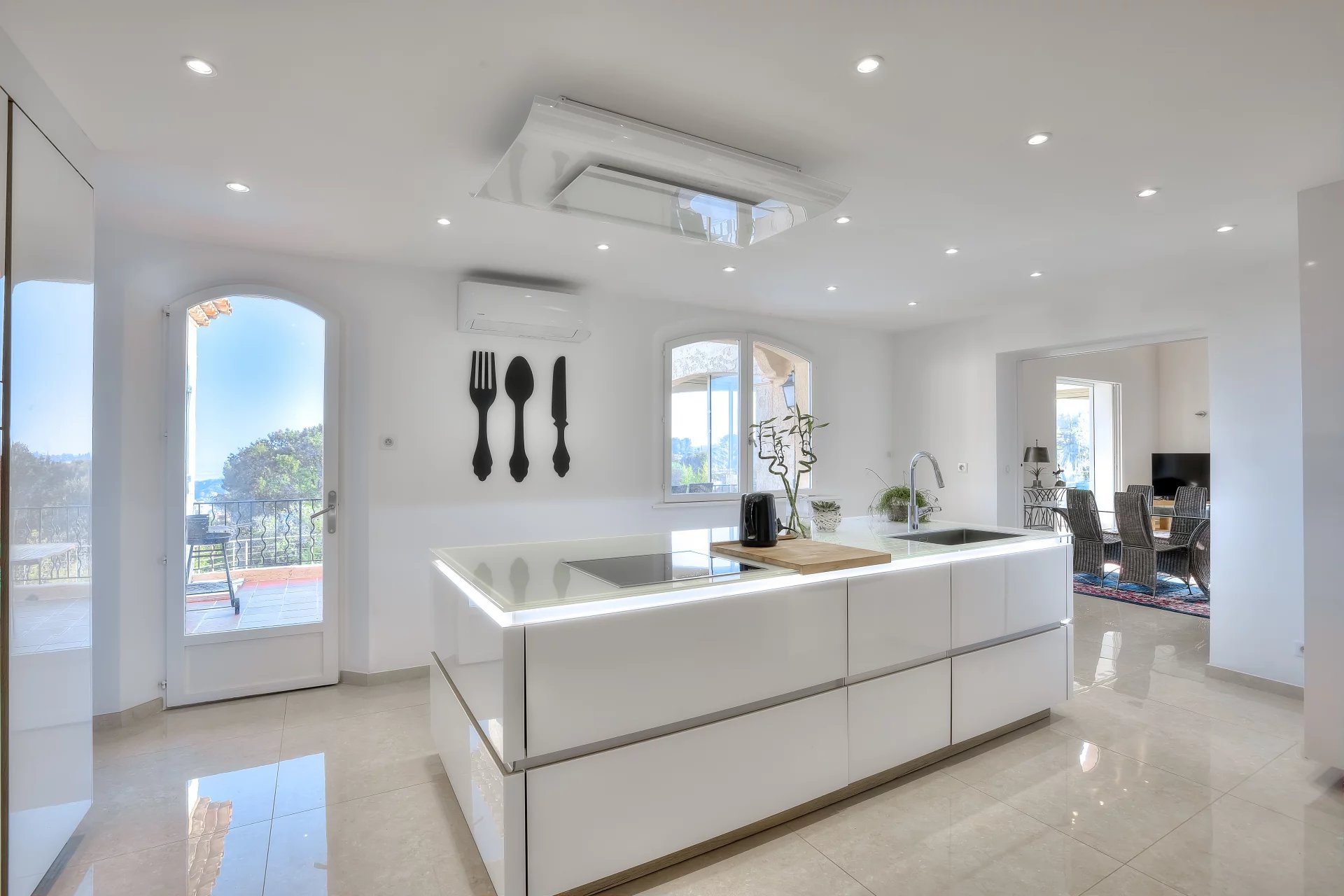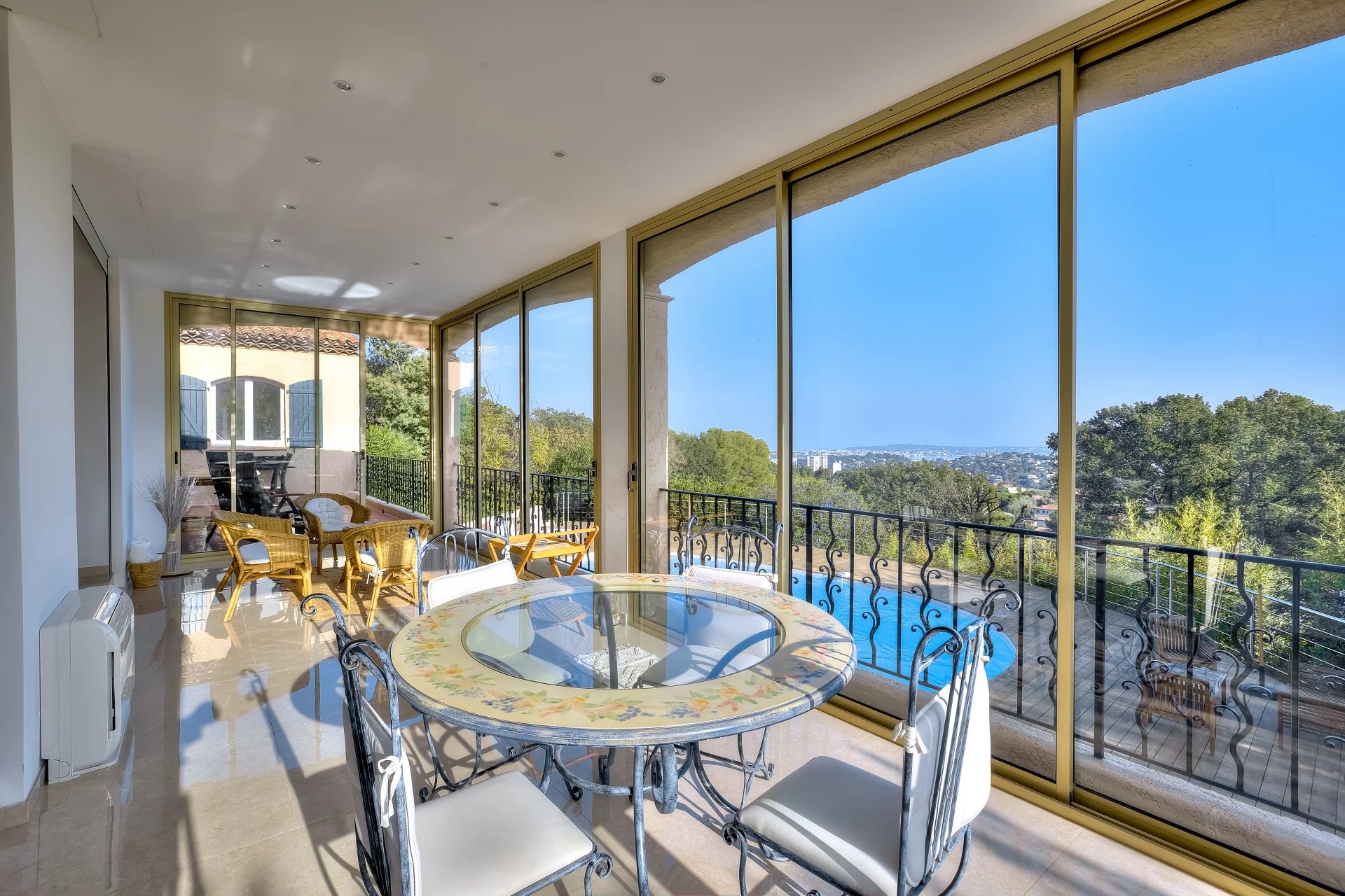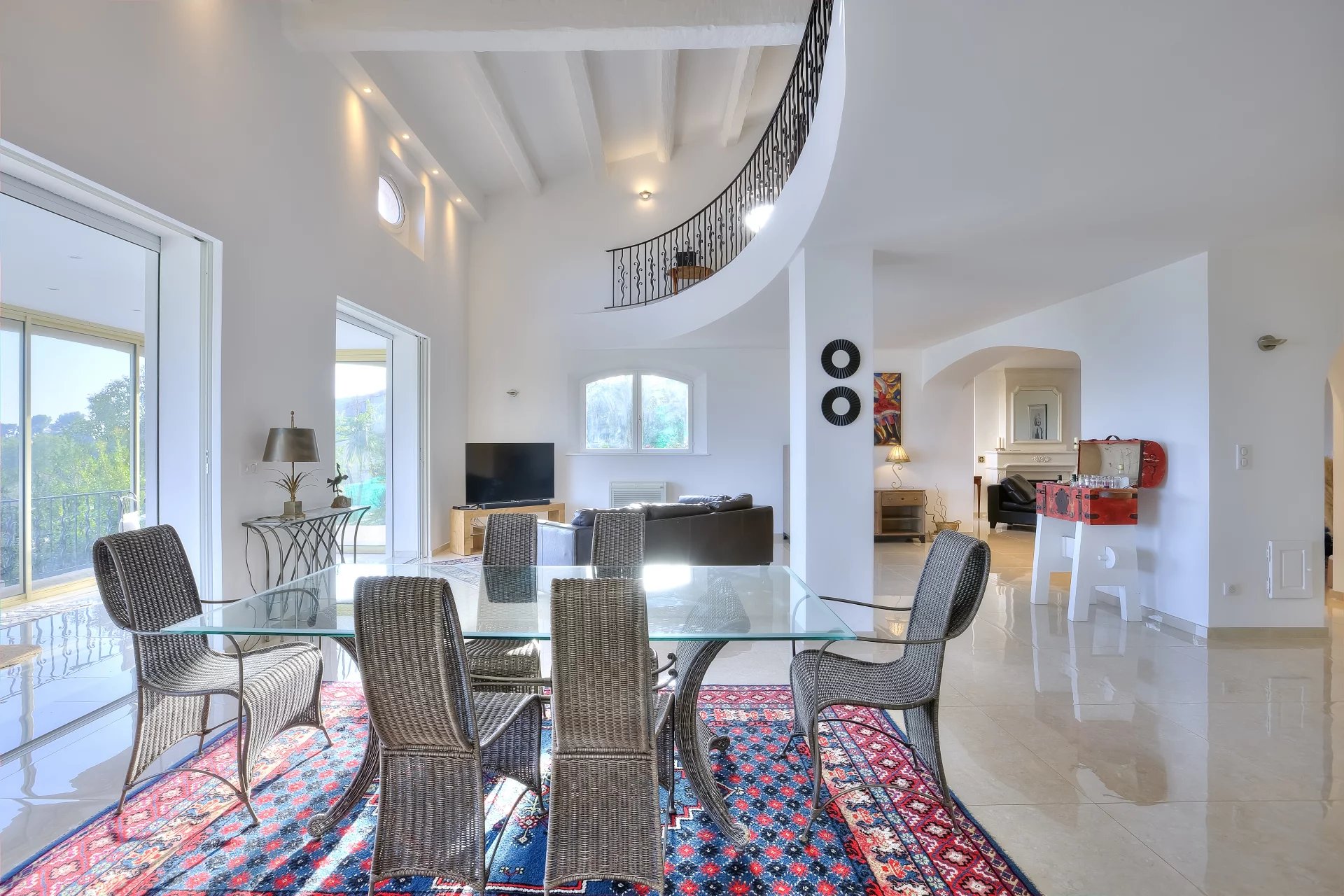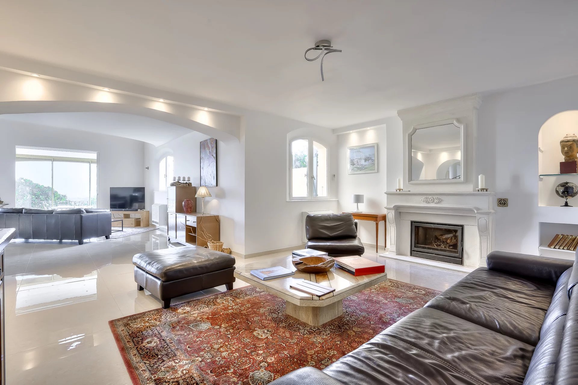Position dominante pour cette villa lumineuse de presque 300 m² habitable avec belle vue mer et dégagée sur le Cap d'Antibes, quartier au calme. Sans vis à vis. Construction traditionnelle sur deux niveaux avec garage, terrasses, sur terrain en restanque de 1500 m². L'espace se compose d'une large entrée, chambre de maitre avec salle de bains/ douche et dressing, à l'étage inférieur , cuisine gourmet équipée d'un ilôt, salle de réception de 136 m² ( cheminée), véranda, sauna, 3 chambres et 2 salles de douche/ wc. grande piscine avec plage en bois exotique de 150 m². climatisation dans toutes les pièces.