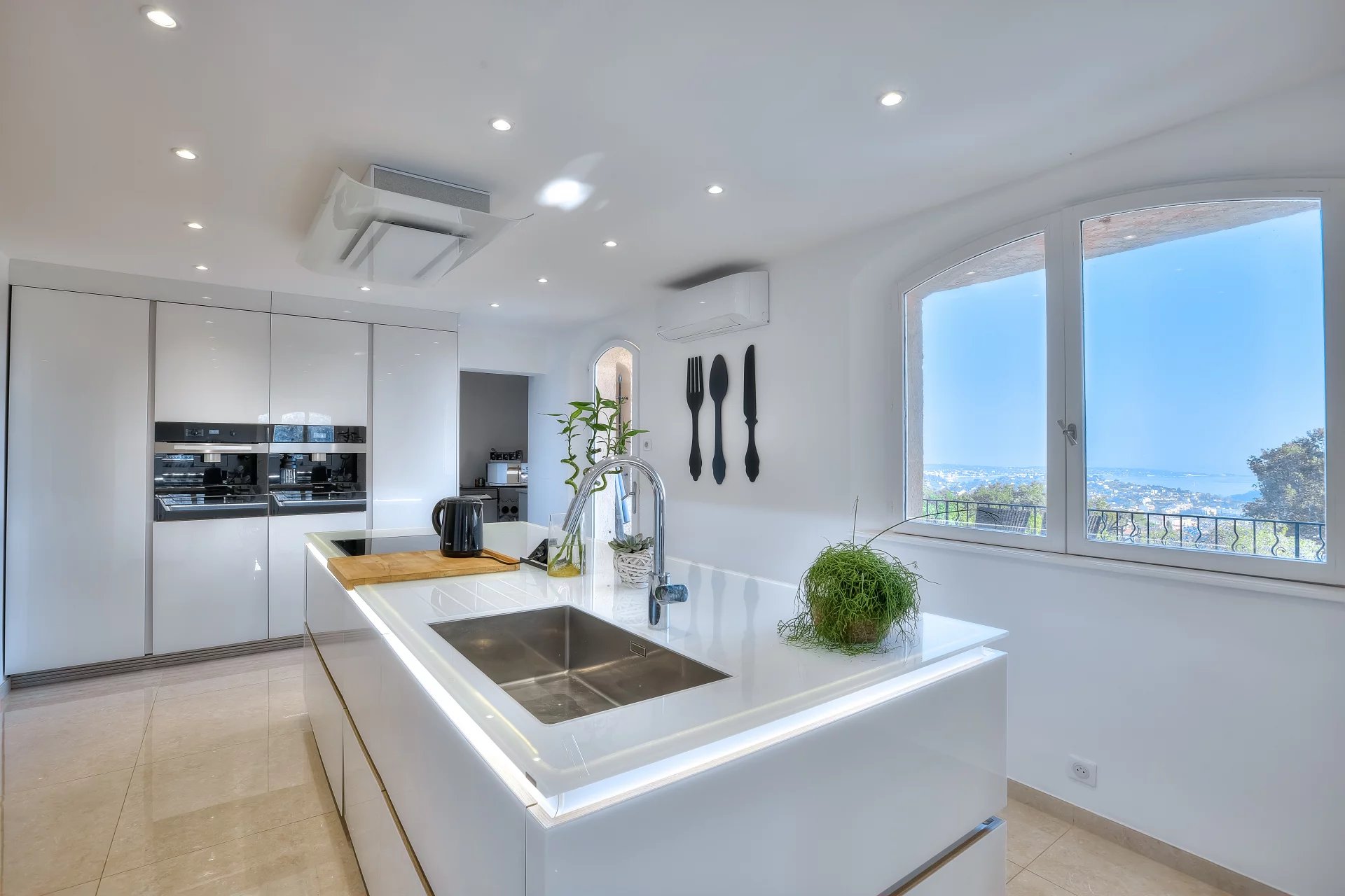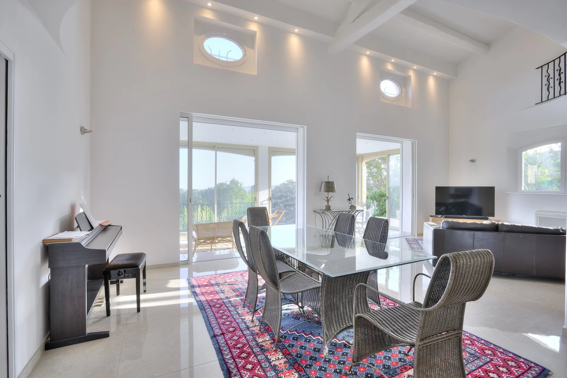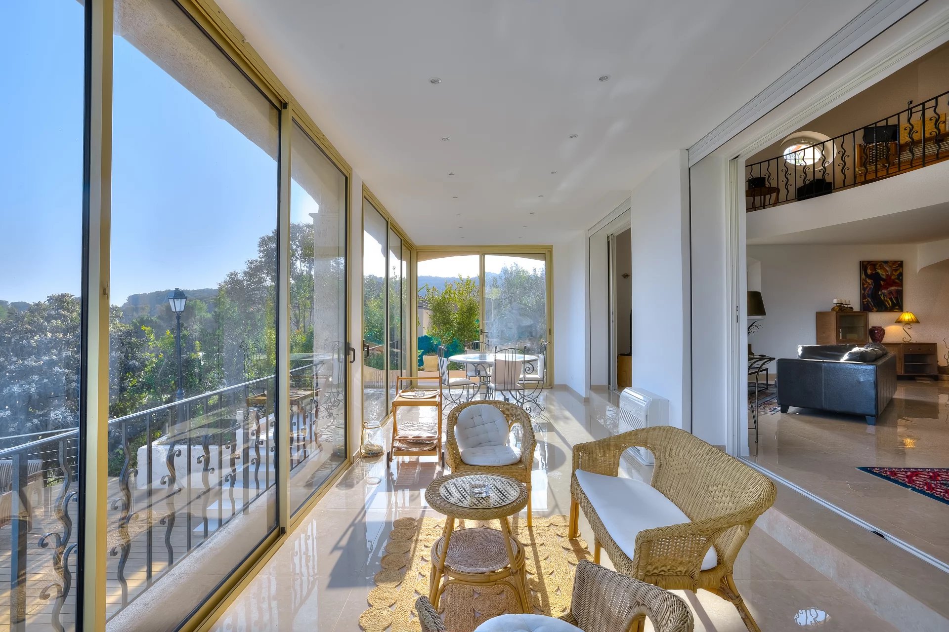 Position dominante pour cette villa lumineuse de presque 300 m² habitable avec belle vue mer et dégagée sur le Cap d'Antibes, quartier au calme. Sans vis à vis. Construction traditionnelle sur deux niveaux avec garage, terrasses, sur terrain en restanque de 1500 m². L'espace se compose d'une large entrée, chambre de maitre avec salle de bains/ douche et dressing, à l'étage inférieur , cuisine gourmet équipée d'un ilôt, salle de réception de 136 m² ( cheminée), véranda, sauna, 3 chambres et 2 salles de douche/ wc. grande piscine avec plage en bois exotique de 150 m². climatisation dans toutes les pièces.