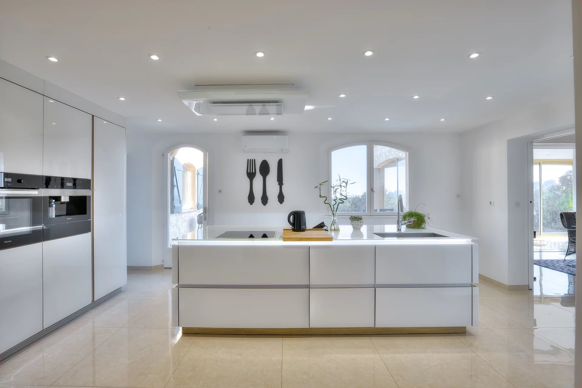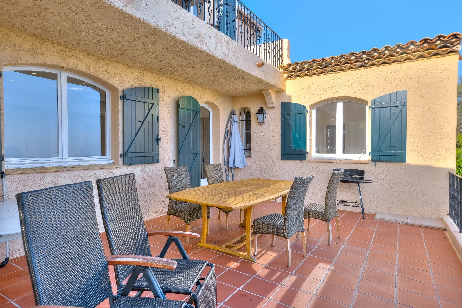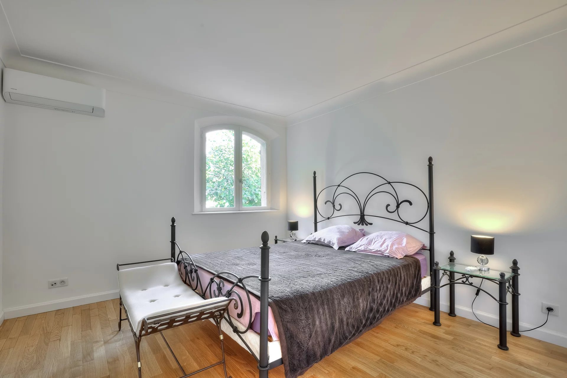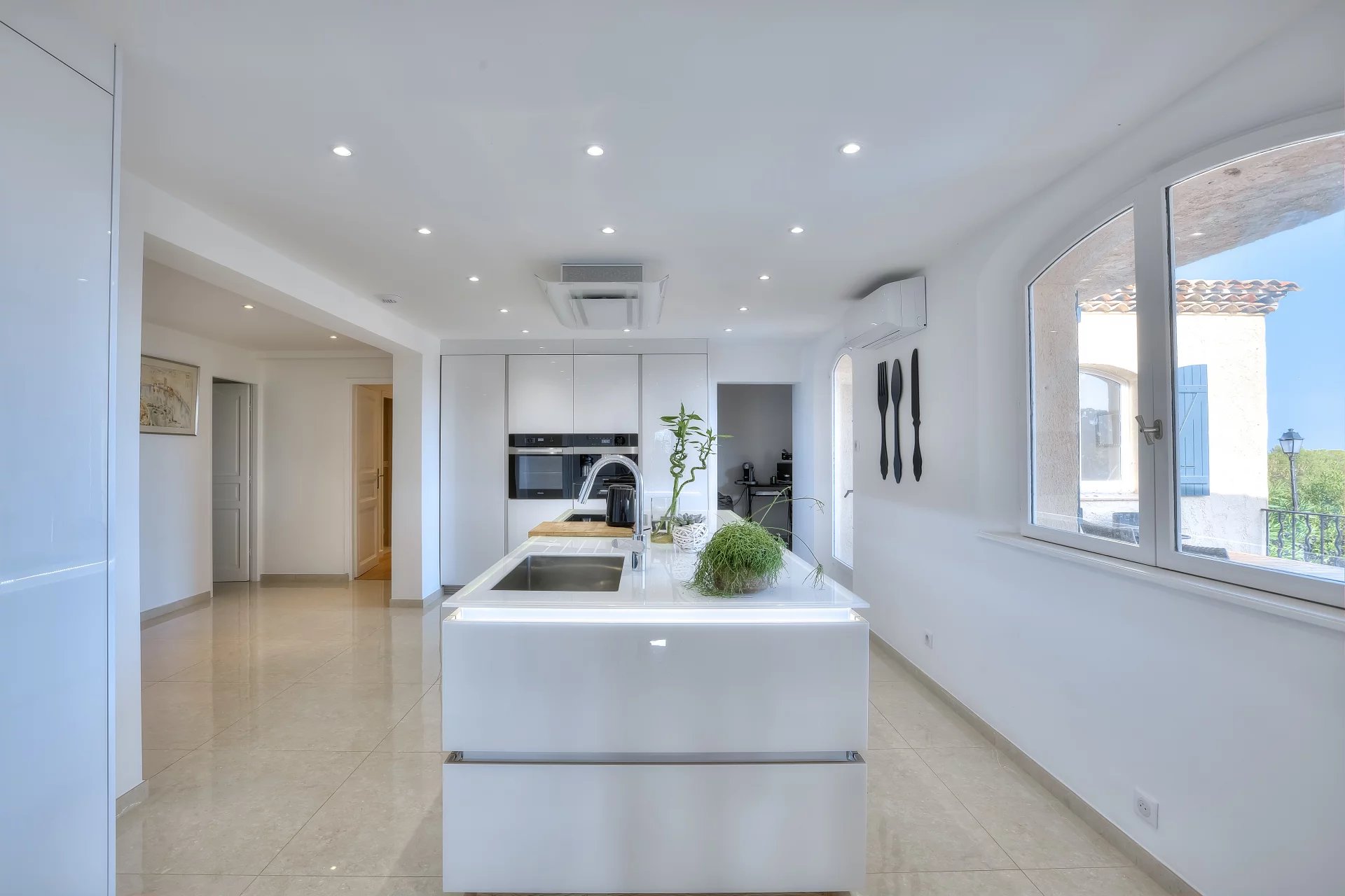 Position dominante pour cette villa lumineuse de presque 300 m² habitable avec belle vue mer et dégagée sur le Cap d'Antibes, quartier au calme. Sans vis à vis. Construction traditionnelle sur deux niveaux avec garage, terrasses, sur terrain en restanque de 1500 m². L'espace se compose d'une large entrée, chambre de maitre avec salle de bains/ douche et dressing, à l'étage inférieur , cuisine gourmet équipée d'un ilôt, salle de réception de 136 m² ( cheminée), véranda, sauna, 3 chambres et 2 salles de douche/ wc. grande piscine avec plage en bois exotique de 150 m². climatisation dans toutes les pièces.