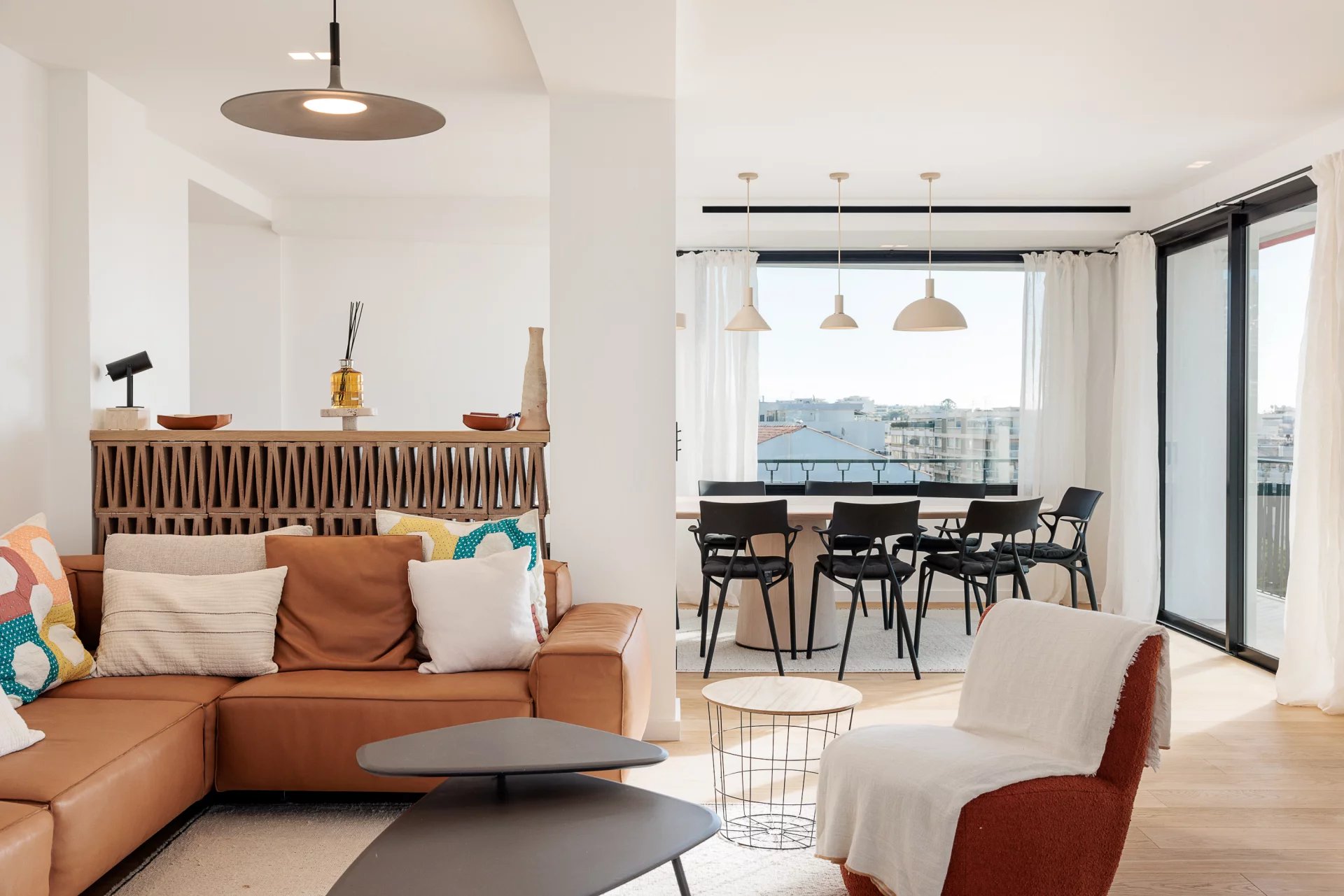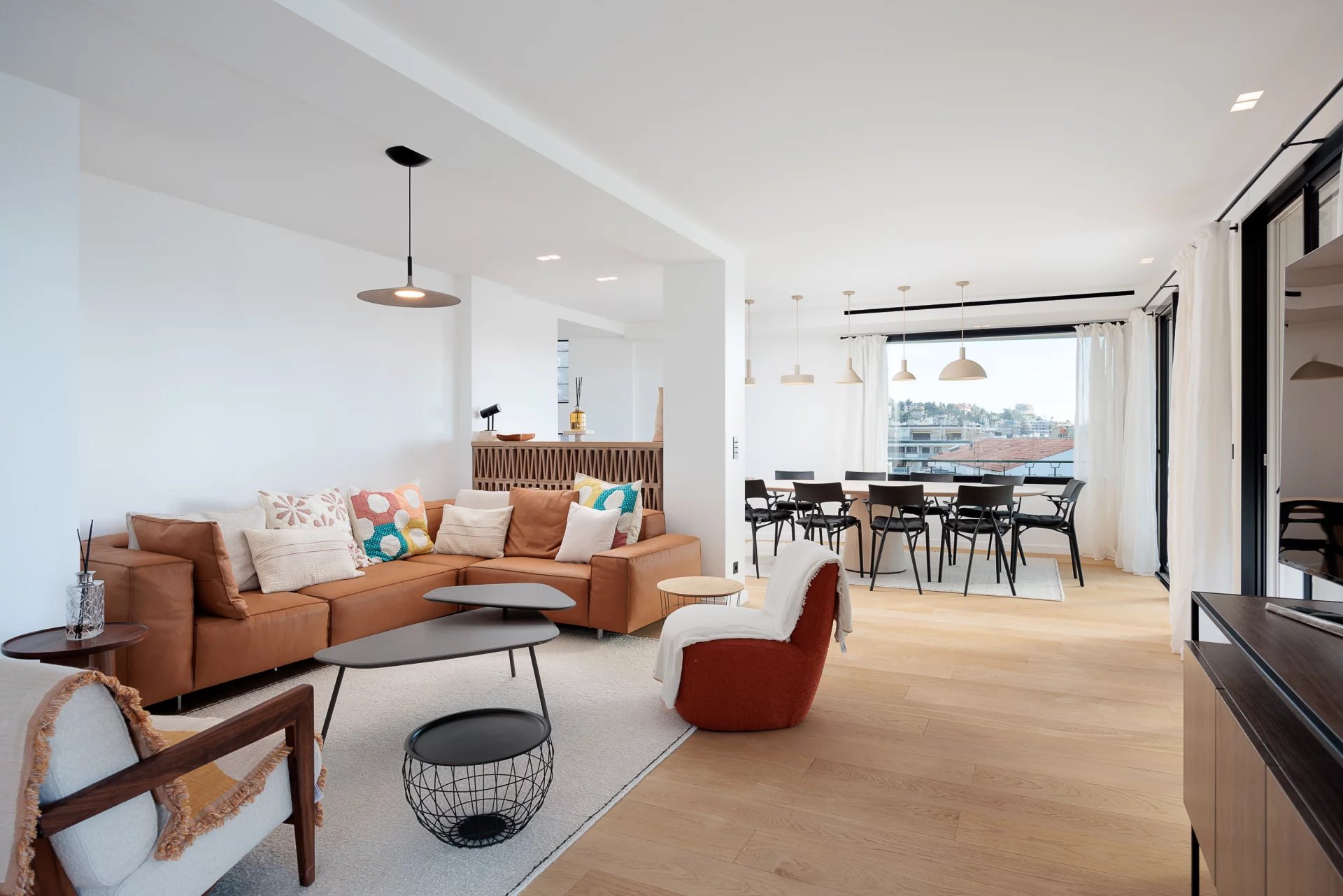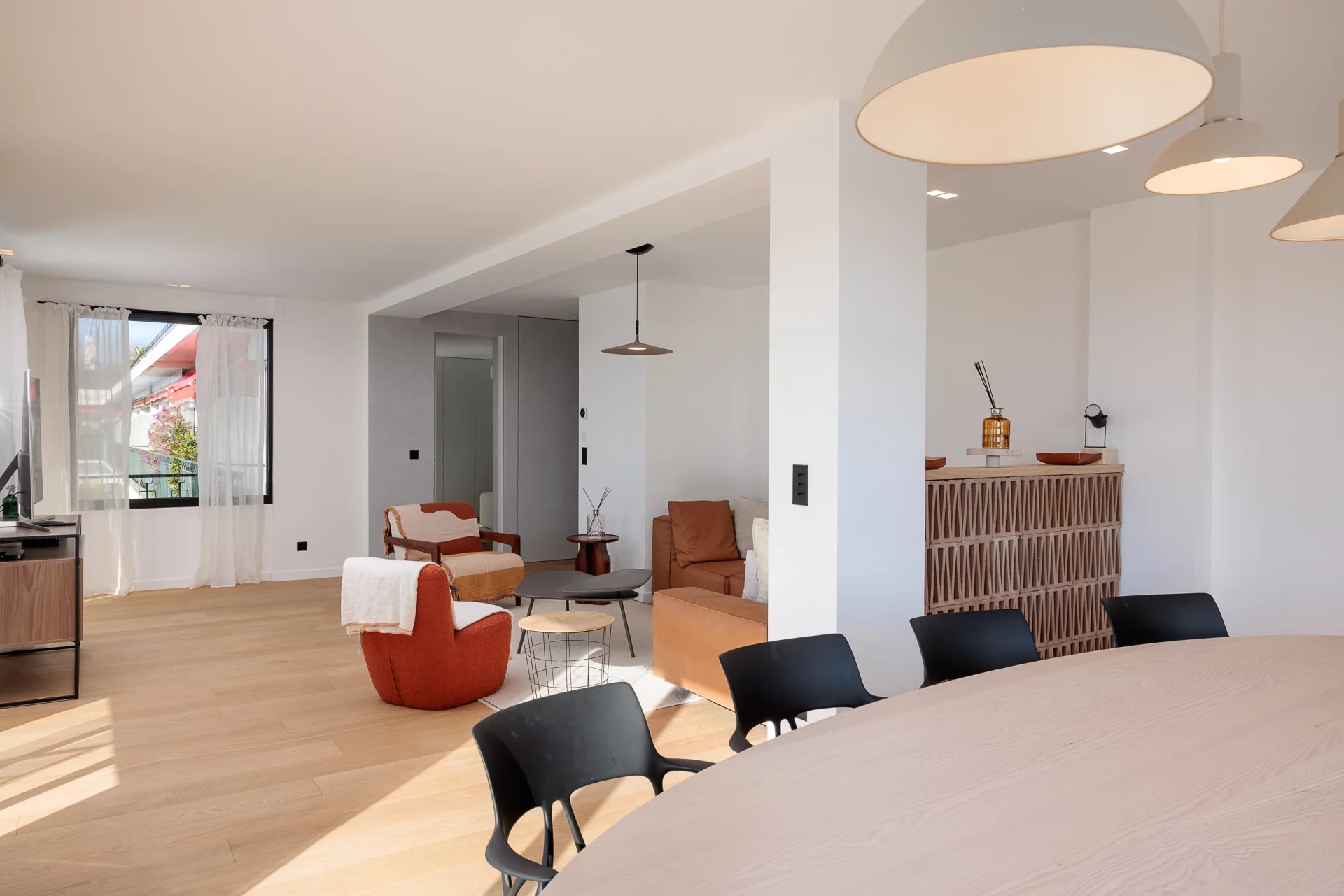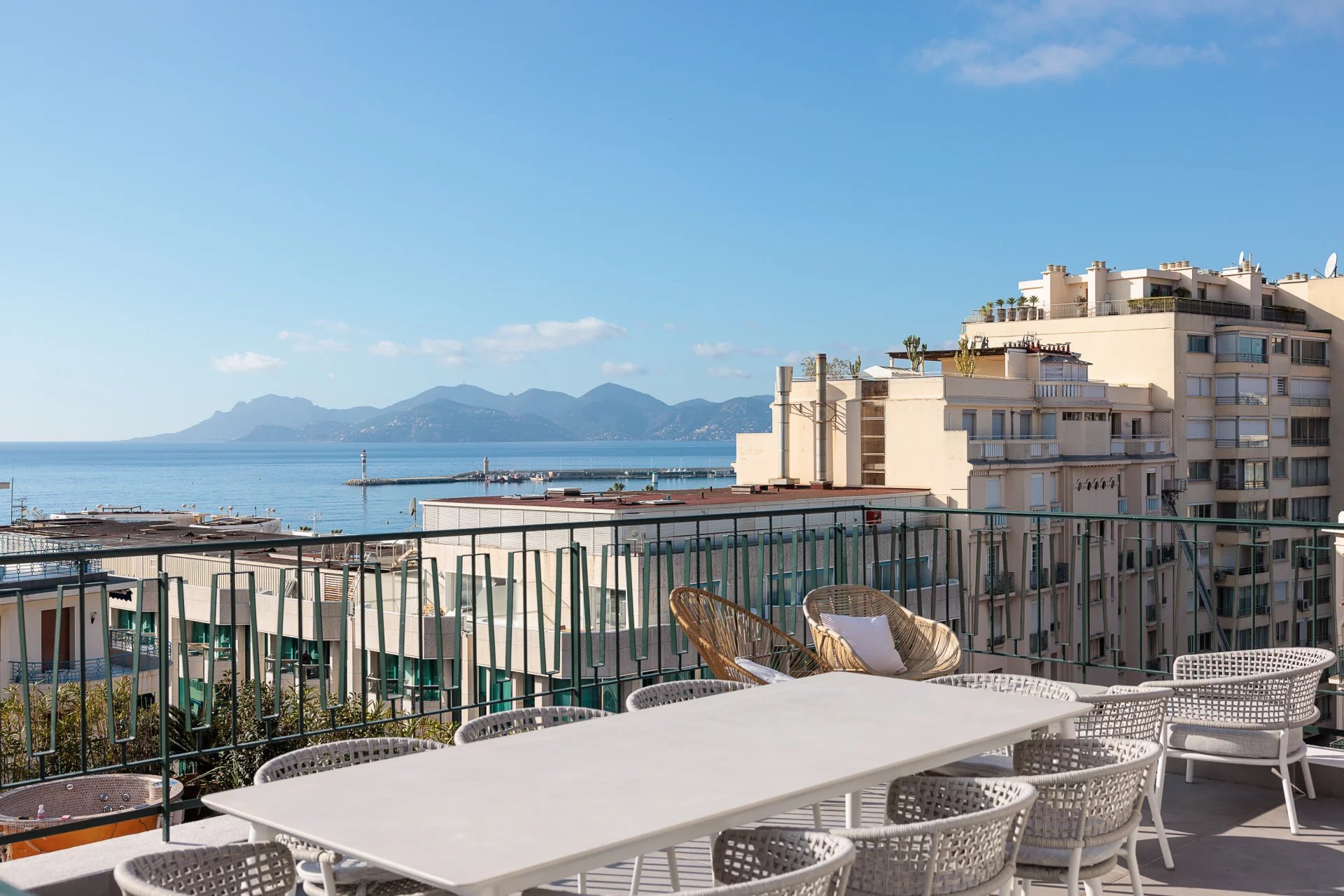 Magnifique 5 pièces meublé avec goût de 125 m2, au dernier étage, composé d'une large entrée, séjour, cuisine équipée et aménagée, 4 chambres dont une de maitre avec sa salle de douche, 2 salles de douche. large terrasse vue mer et terrasse aménagée sur le toit vue 180 ° . idéal congrès et séminaire . proche Palais.
