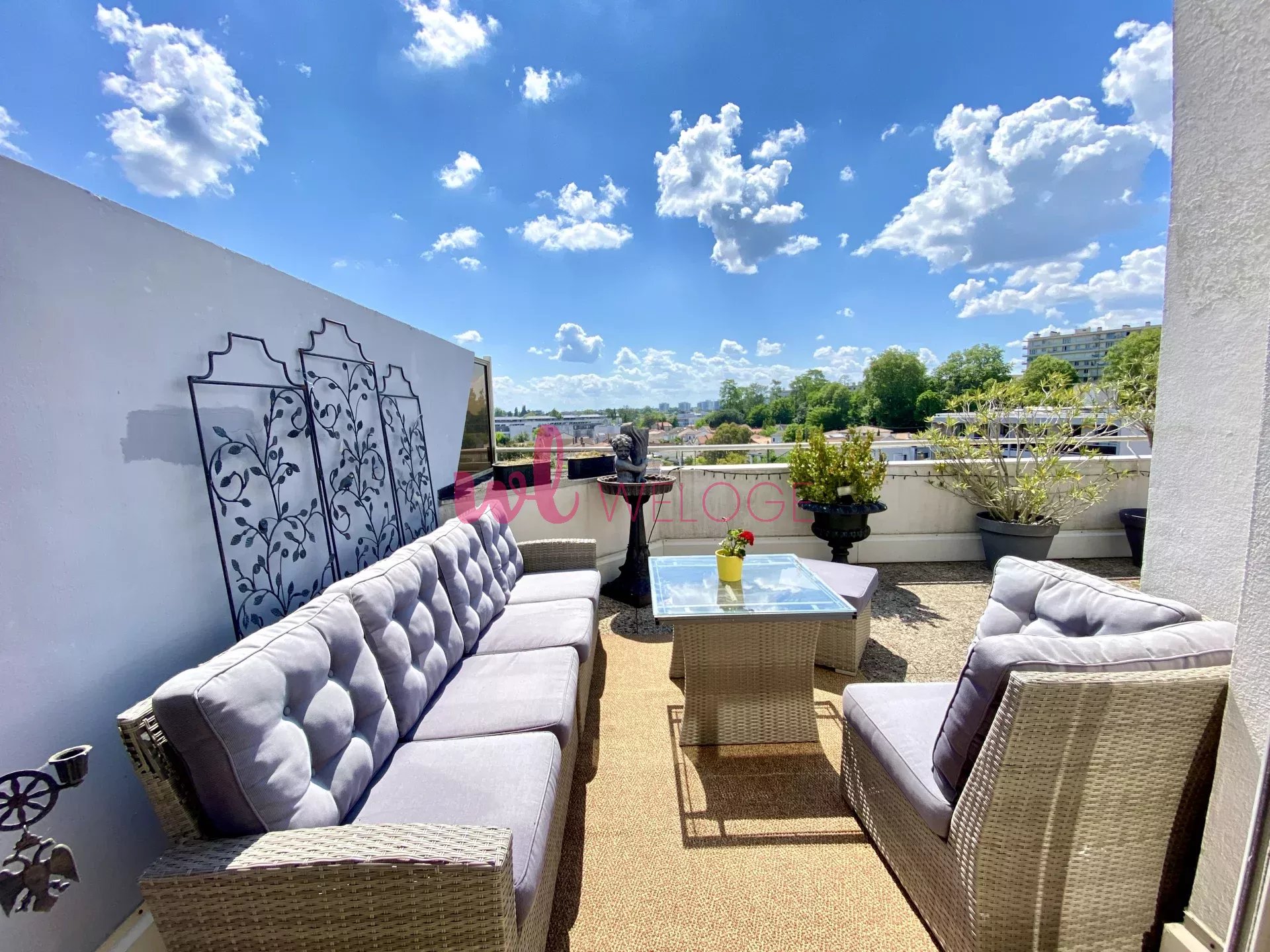 À Caudéran, dans un quartier résidentiel et paisible, découvrez une véritable maison sur le toit : un vaste duplex en dernier étage, offrant une atmosphère unique et des volumes généreux. Situé aux 3ᵉ et 4ᵉ/dernier étages d’une résidence de standing avec parc privé, cet appartement bénéficie d’une immense terrasse à ciel ouvert, exposée sud et ouest, offrant une vue dégagée et un cadre de vie exceptionnel, en toute tranquillité. Le premier niveau accueille une belle entrée ouvrant sur une grande pièce de vie traversante, élégamment décorée (parquet, cheminée, moulures et boiseries), prolongée par une loggia. Vous y trouverez également une cuisine séparée et deux superbes suites avec salles de bain/salles d’eau privatives et dressing. À l’étage, un vaste salon (ou bibliothèque) s’accompagne de deux chambres, d’une salle d’eau, d’une cuisine d’appoint et d’une véranda aménagée en espace de détente, donnant accès à la terrasse panoramique où l’on profite du soleil et de la vue panoramique. Avec ses espaces extérieurs uniques, sa vue dégagée et son esprit rooftop, cet appartement se vit véritablement comme une maison perchée au-dessus des toits. Il est complété par 2 places de stationnement sécurisées et 2 celliers.