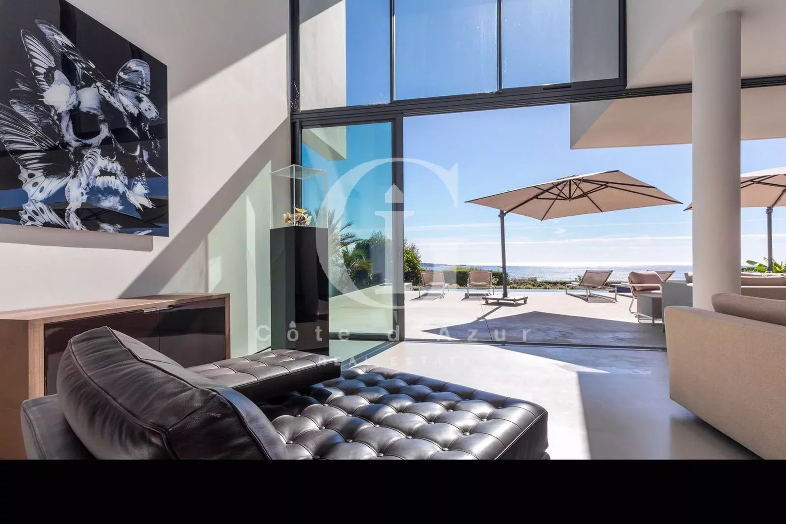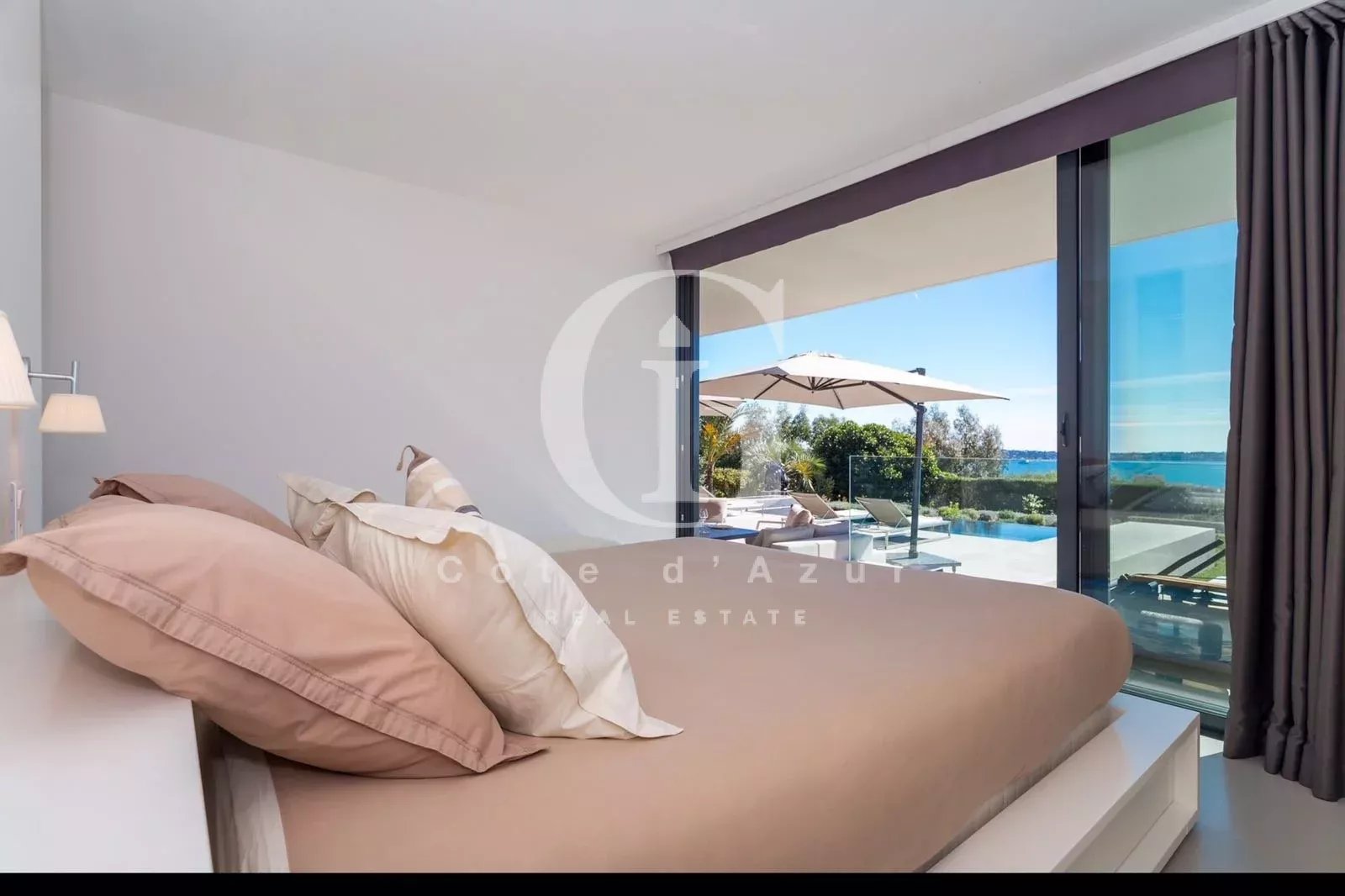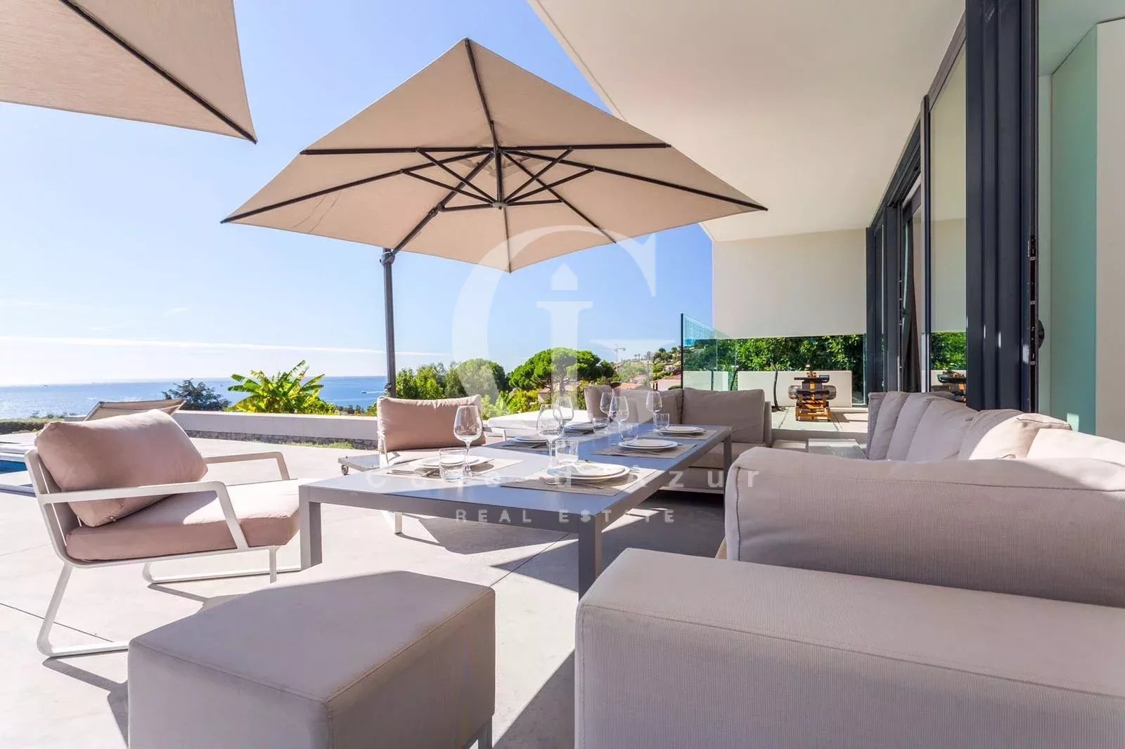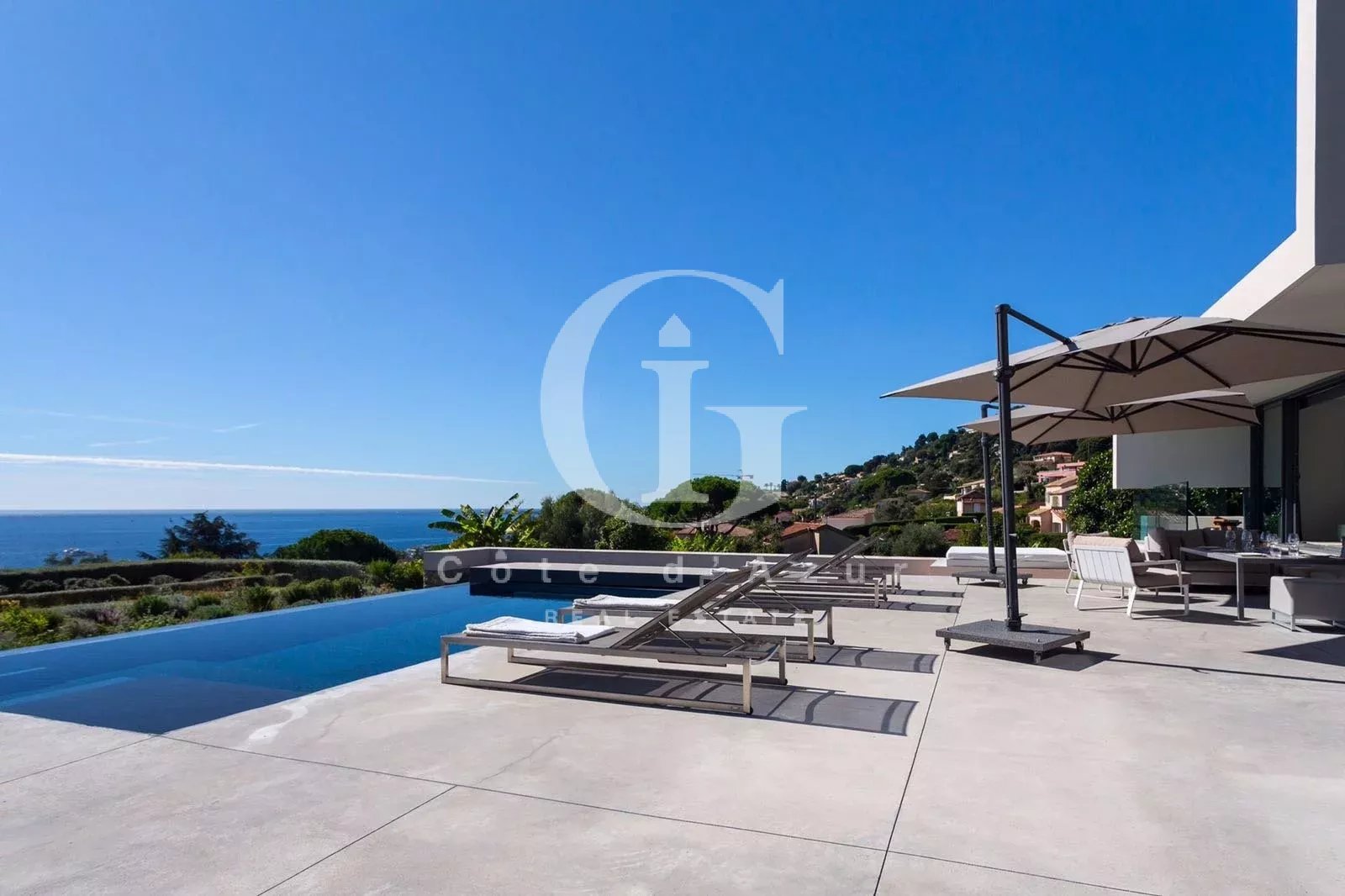 LOCATION SAISONNIERE Golfe Juan, proche mer, superbe villa contemporain offrant vue mer panoramique exposée plein sud. La villa propose salon, salle à manger face à la mer, cuisine ouverte, 4 chambres en suite. Piscine à débordement.