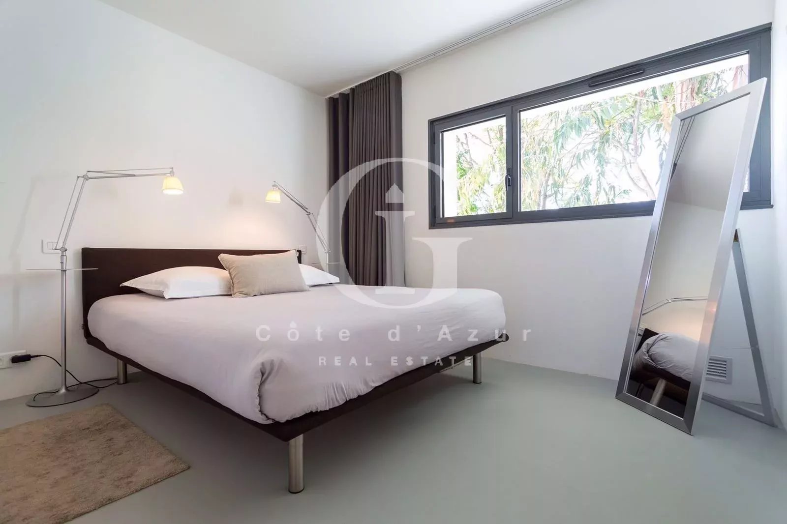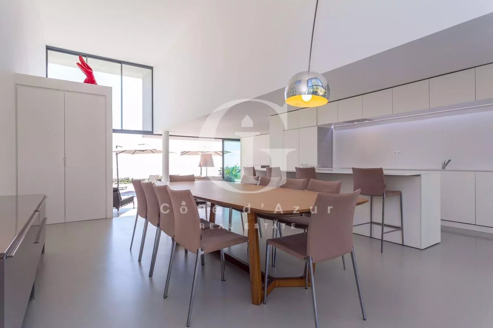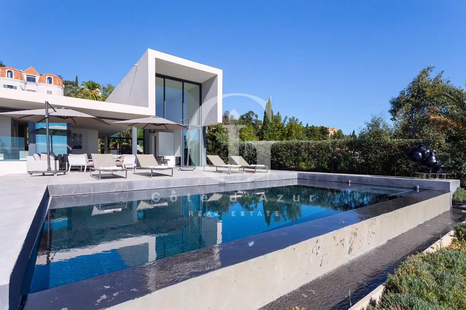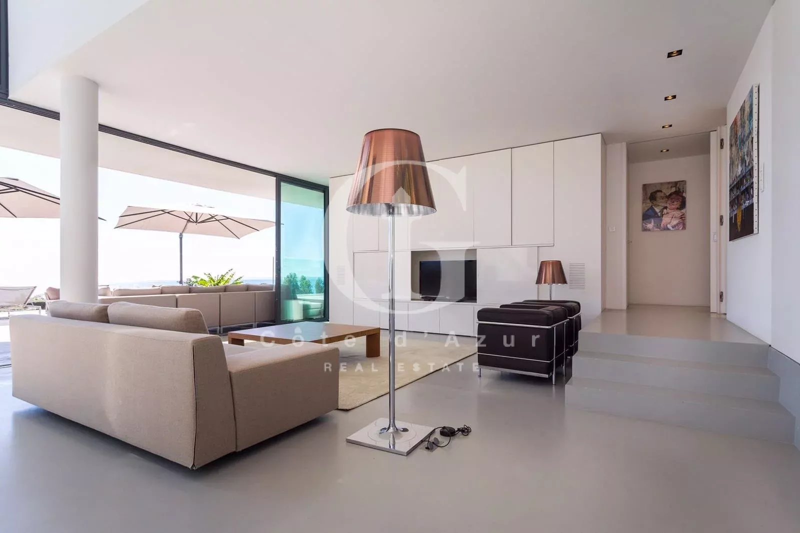 LOCATION SAISONNIERE Golfe Juan, proche mer, superbe villa contemporain offrant vue mer panoramique exposée plein sud. La villa propose salon, salle à manger face à la mer, cuisine ouverte, 4 chambres en suite. Piscine à débordement.