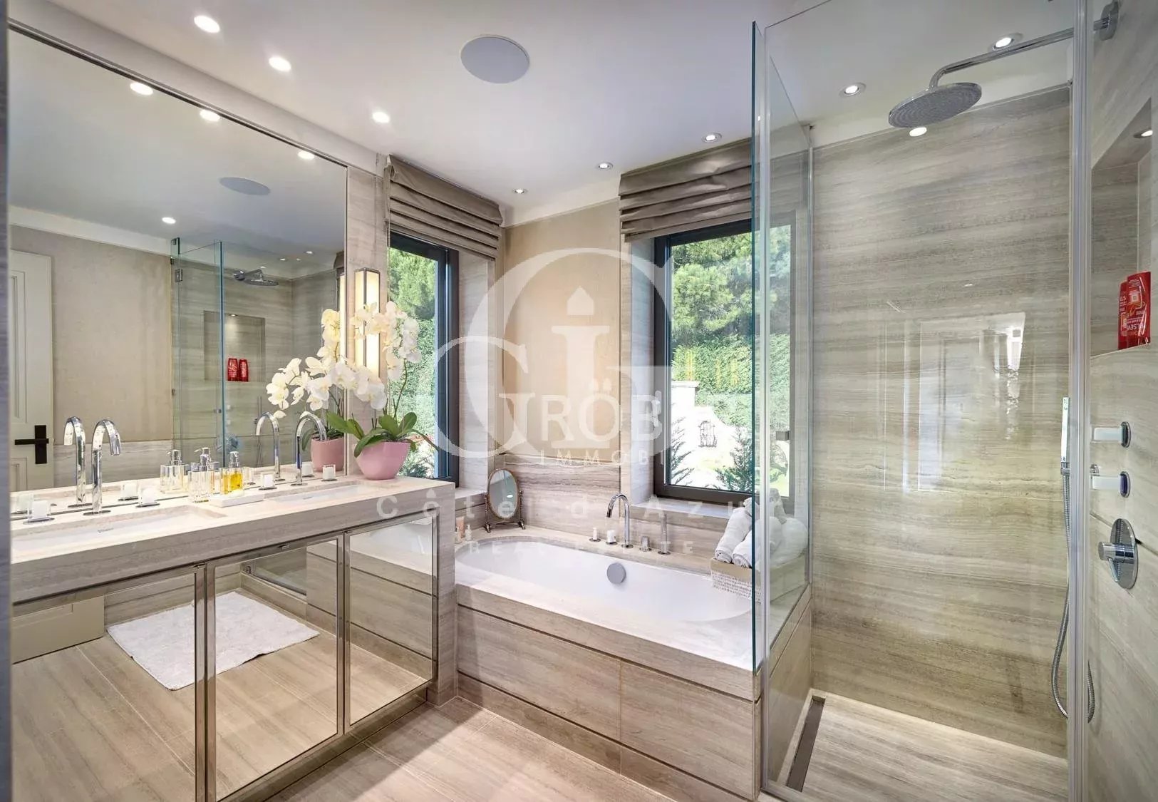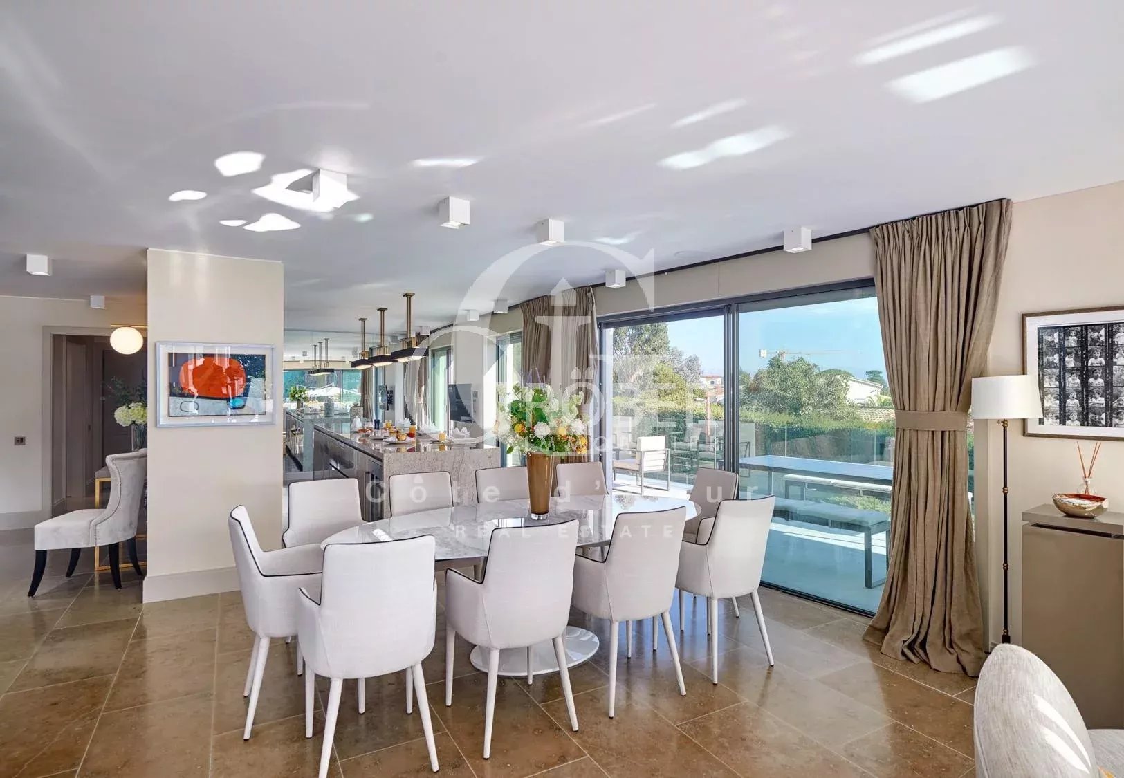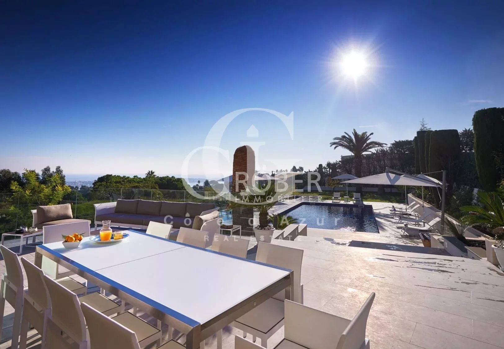 Super Cannes, à 10 minutes de la Croisette et 20 minutes de l'aéroport de Nice, superbe villa contemporaine aux prestations raffinées avec piscine et jacuzzi offrant vue mer. La villa offrant salon, salle à manger, cuisine équipée, 6 chambres en suite, 2 pièces indépendant. WIFI. Location meublée longue durée Dépot de garantie 2 mois