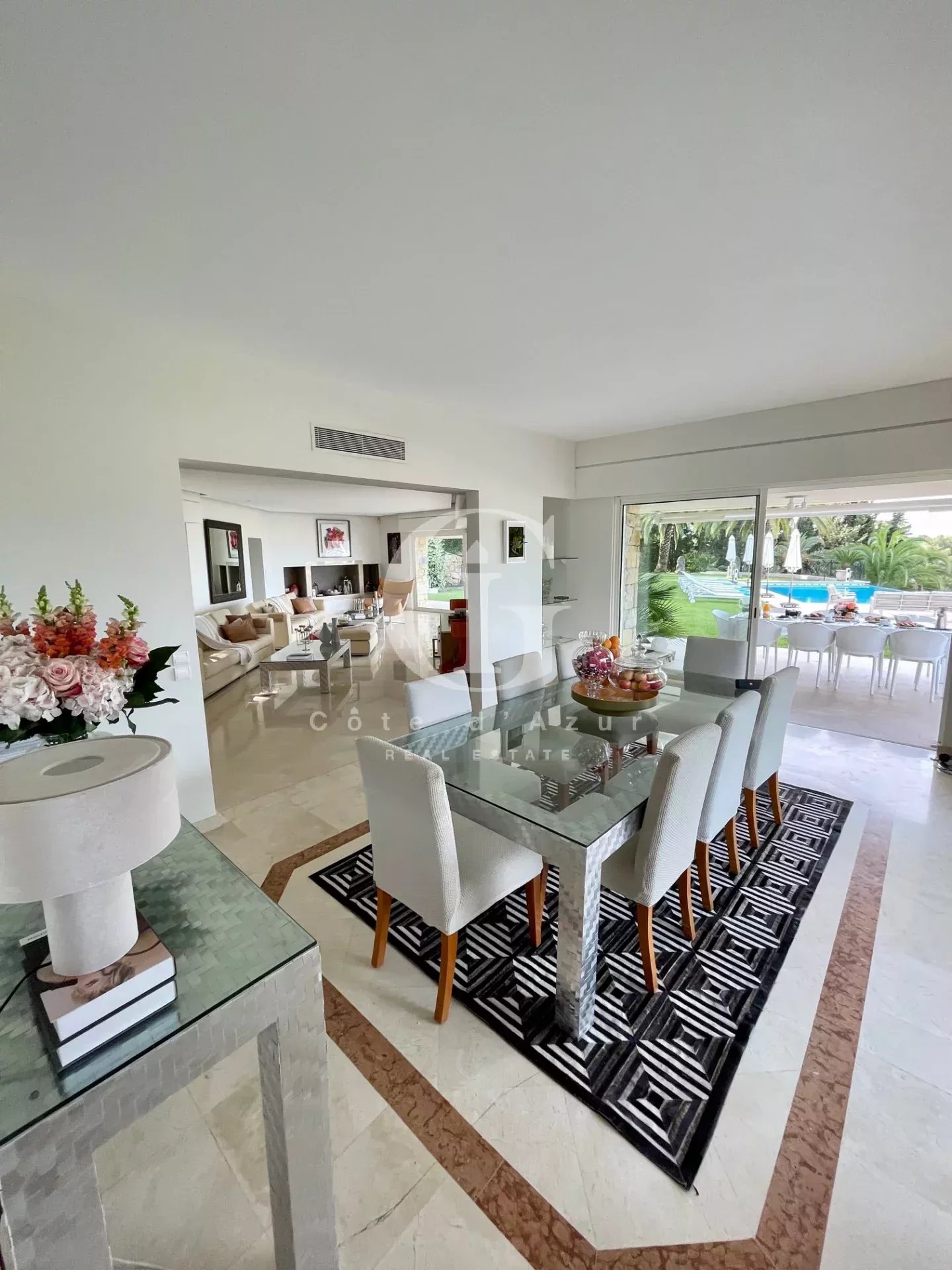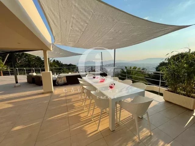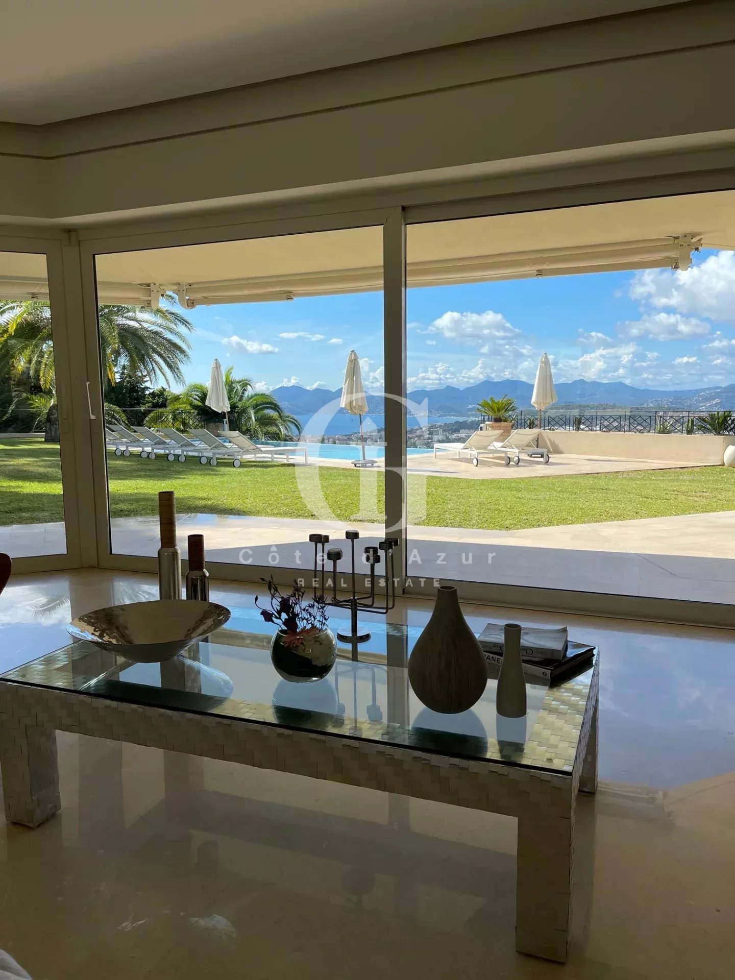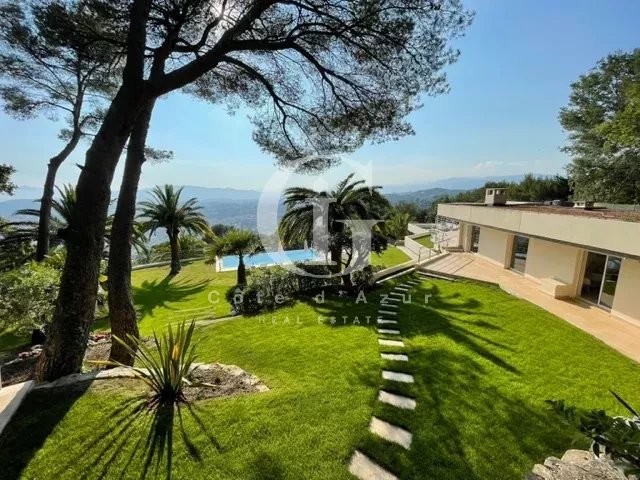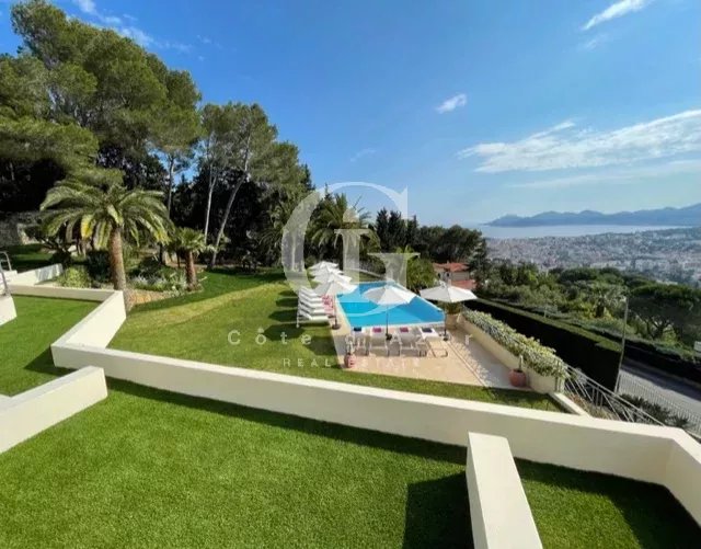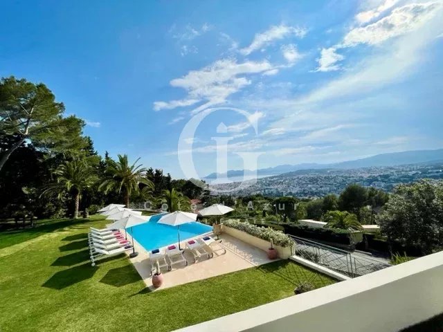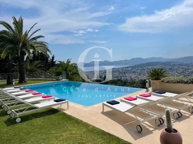 Sur les hauteurs de Cannes, au calme, dans quartier très recherché de la Californie, offrant vue mer panoramique, à 10 minutes de la Croisette, superbe propriété moderne de 350 m² sur 4.500 m² avec piscine à débordement. La villa propose entrée, cuisine séparée, salle à manger, salon, chambre de maître avec son dressing et sa salle de bains complète. 2 chambres en suite. A l'étage 3 chambres en suite. WIFI. Climatisation. Salle de fitness. Sutdio indépendant. Terrain de pétanques.