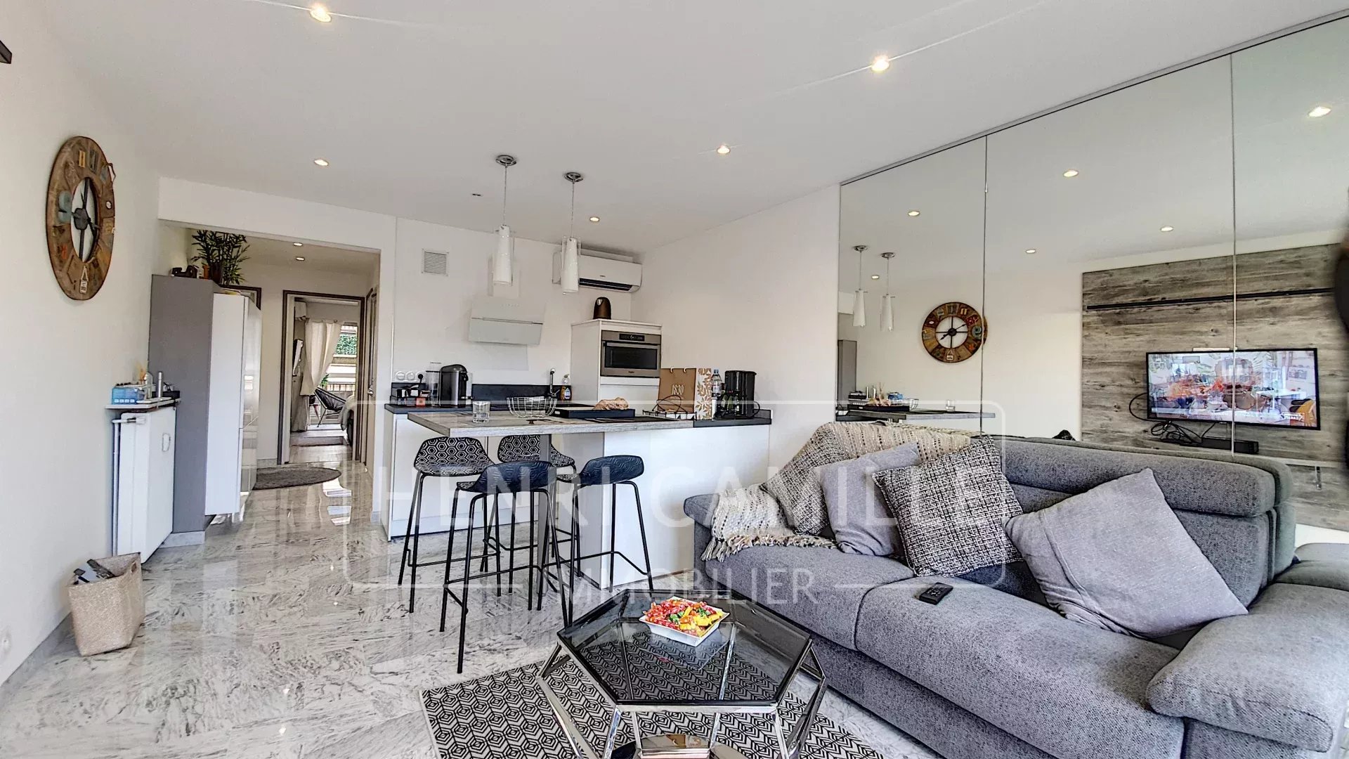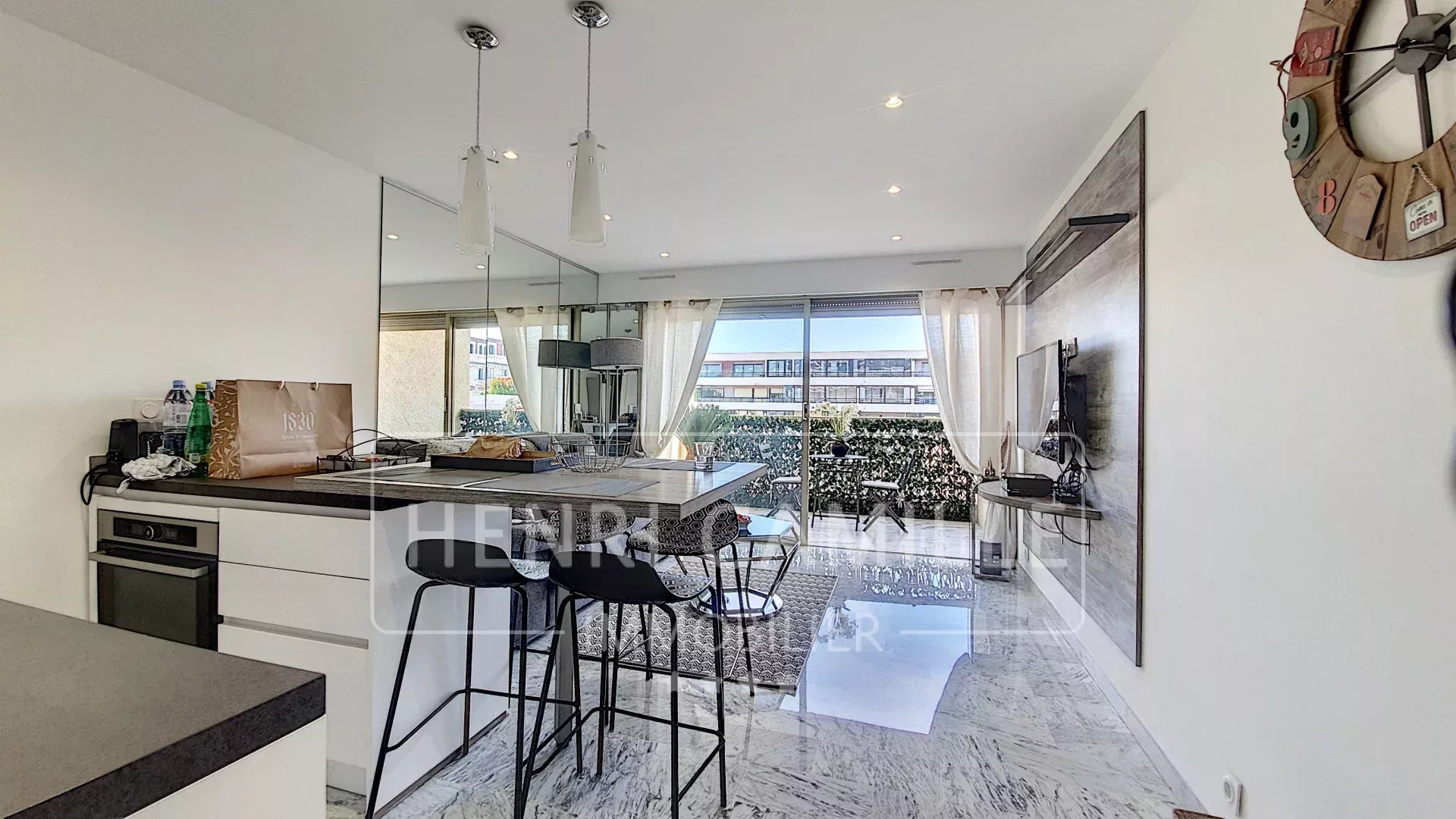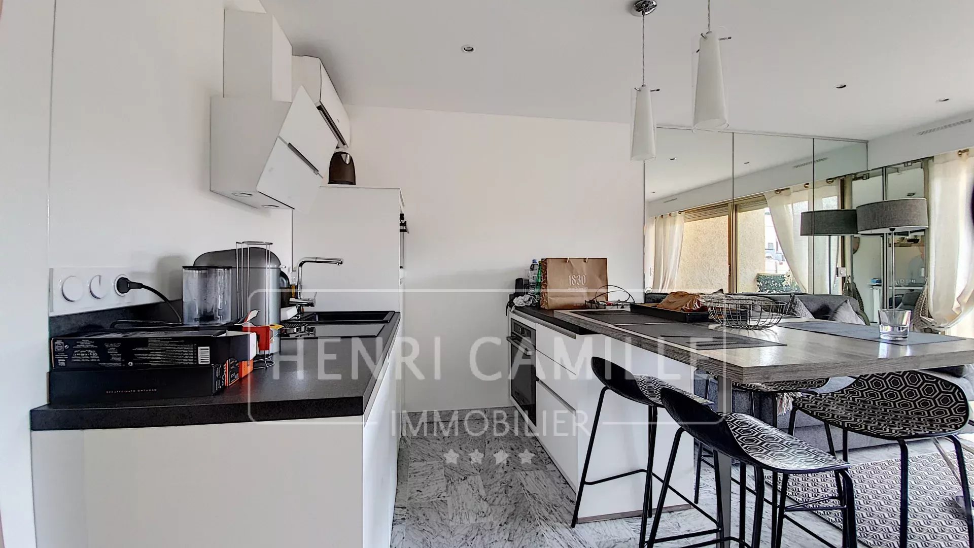Il est composé d'une entrée avec rangements, un beau salon avec canapé lit convertible ( vrai lit ) donnant sur une terrasse ensoleillée, une cuisine américaine toute équipée, une grande chambre avec lit double et rangements, 1 petite chambre avec un lit simple, toutes deux donnant sur un accès direct à une loggia joliment aménagée de 10m2 ( terrasse fermée ), une salle d'eau, WC séparé.
