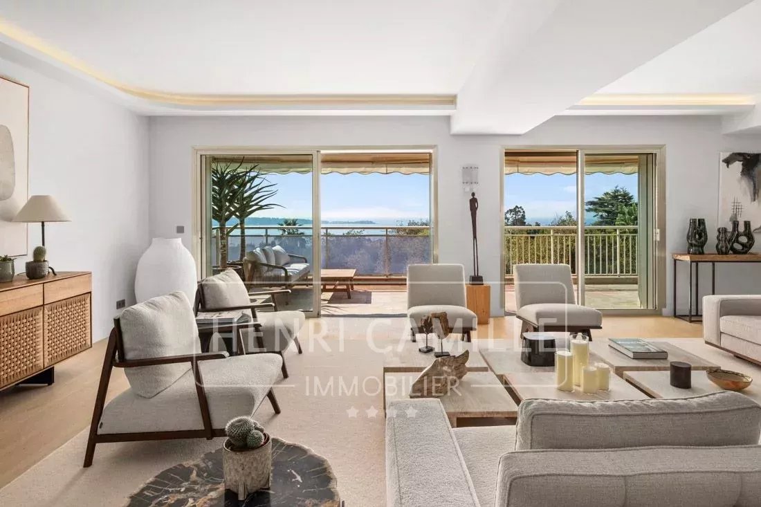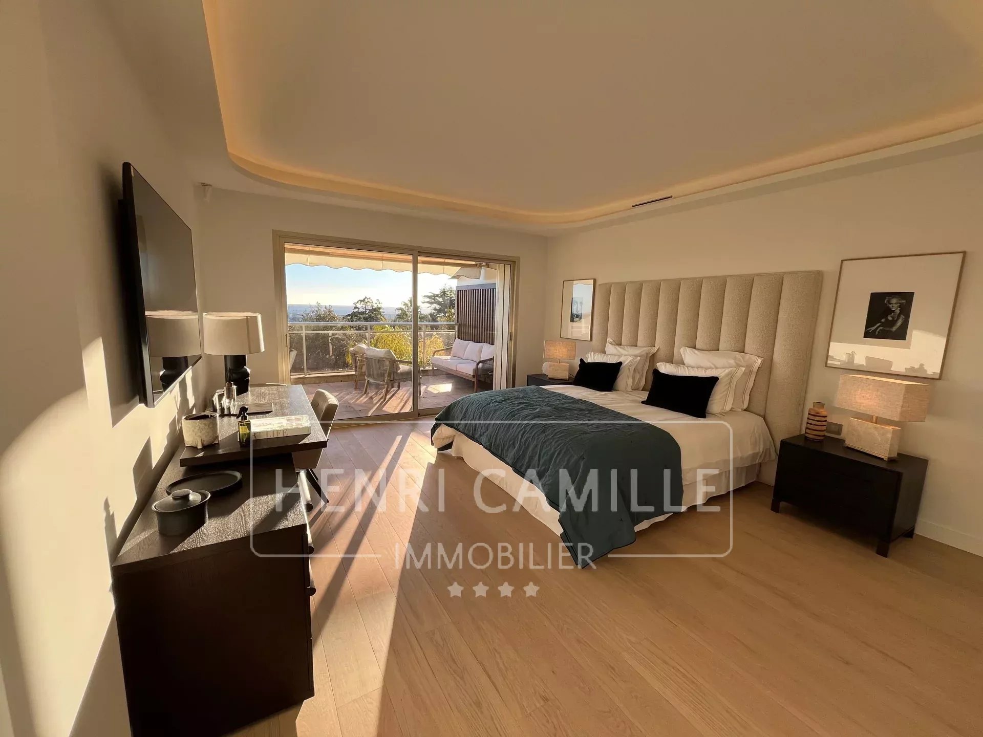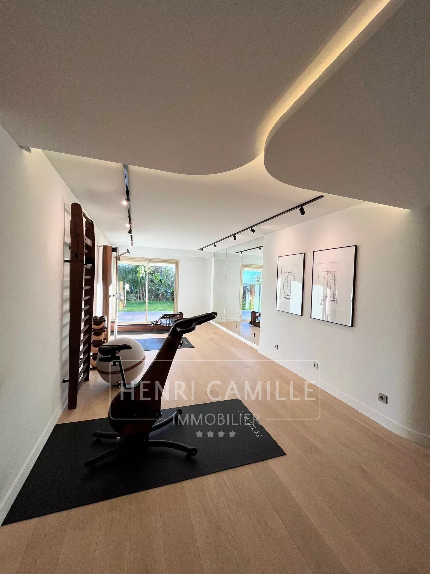 Au cœur d'une prestigieuse résidence sécurisée, cette villa de 315m² offre une vue panoramique sur les Iles de la Baie de Cannes. Composée d'un splendide salon et de 4 chambre en suite, on profite également d'une salle de sport, 2 garages doubles. Luxueusement rénovée, elle bénéficie d'un écrin dans lequel on trouve piscine et tennis. Haut de gamme.