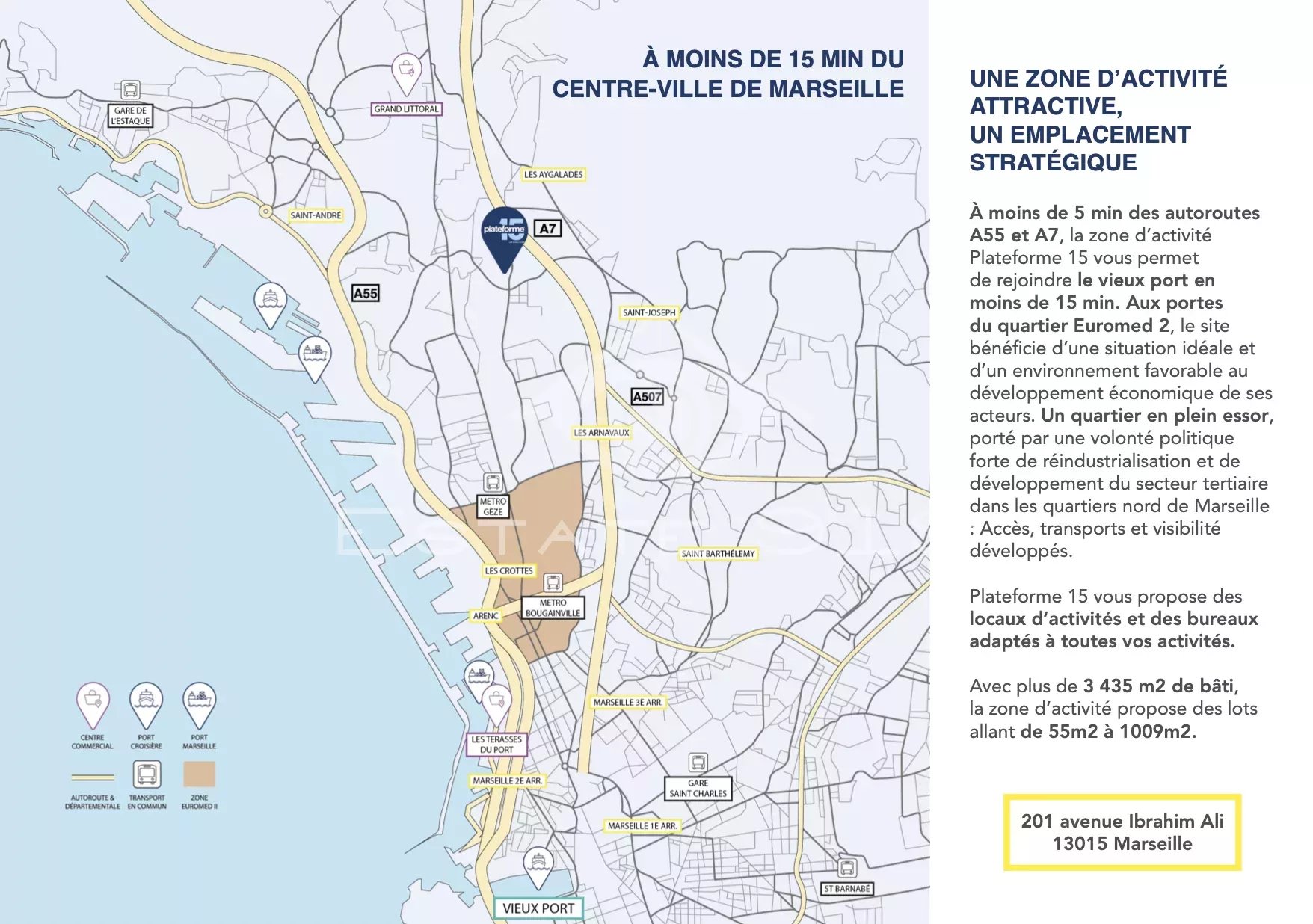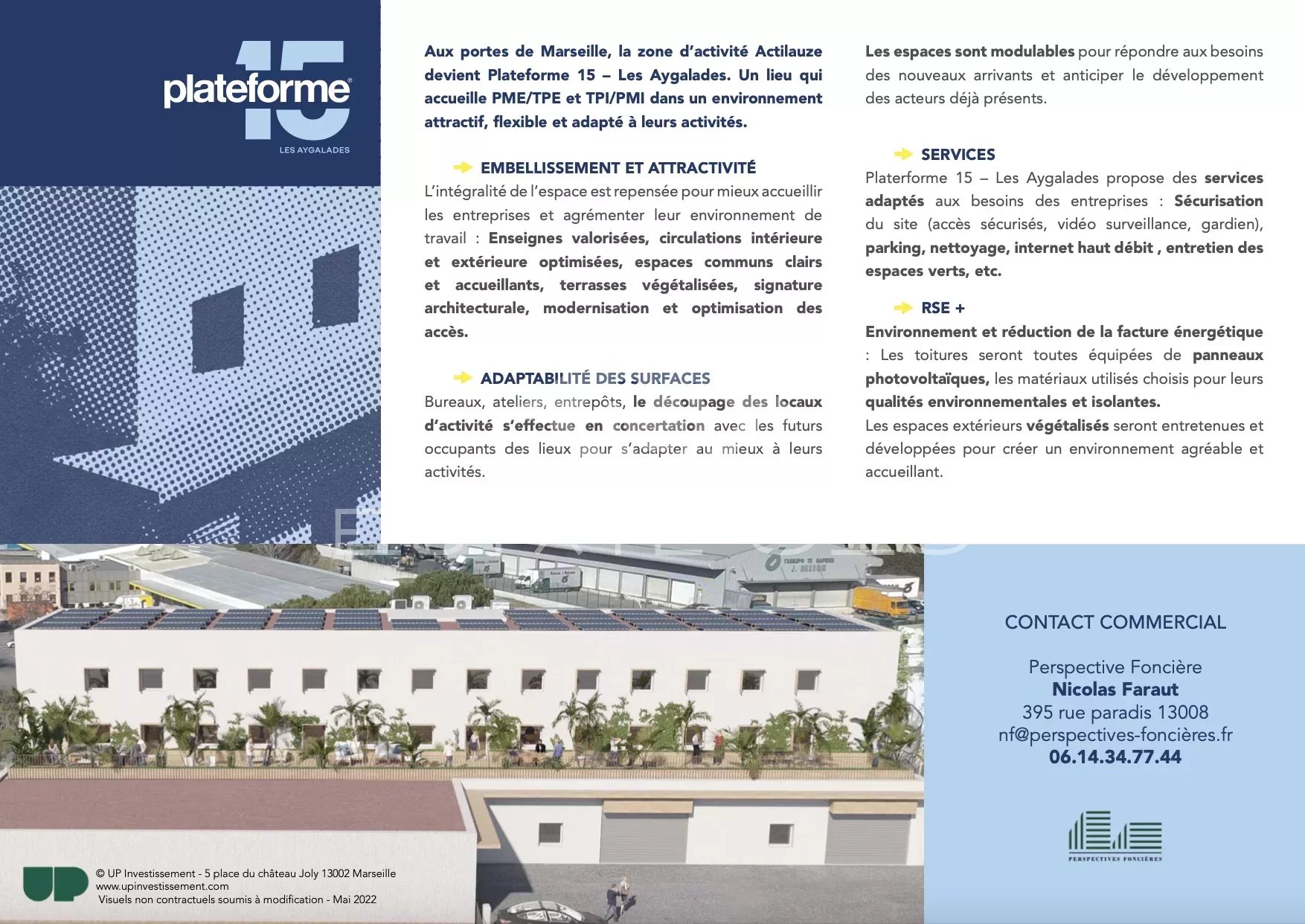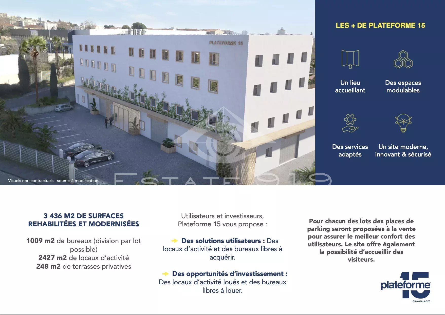 Aux portes de Marseille, au sein du Parc de la Lauzière, Plateforme 15eme fait l'objet d'une remise niveau complète, ravalement, espaces verts, terrasses, végétalisation des façades pour offrir un environnement attractif, flexible, sécurisé et adapté aux TPE / PME.