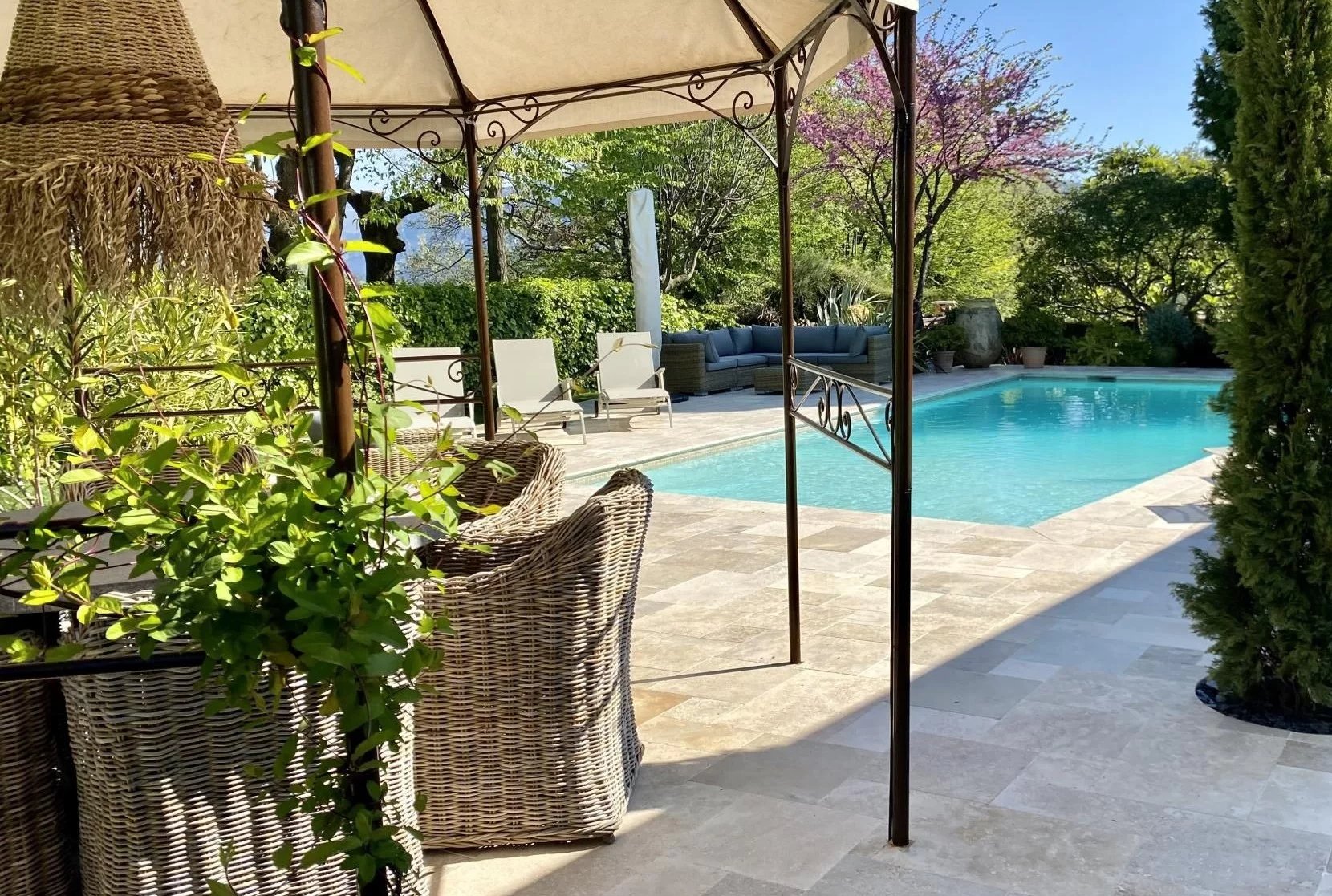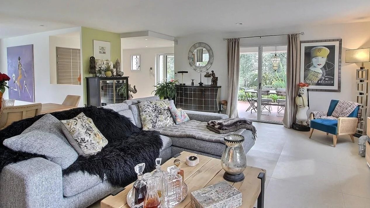Rare à la vente Au calme ! Magnifique propriété située à pieds des commerces en position dominante. La villa de plain pied comprend un vaste séjour très lumineux exposée S/O, ouvert sur une grande cuisine équipée haut de gamme donnant accès à une jolie terrasse avec piscine et une superbe vue dégagée sur les montagnes du loup. Vous trouverez également un bel espace nuit composé de deux grandes chambres dont une avec dressing (possibilité de recréer la 3ème chambre), une salle de bain/WC et un WC invité. Au niveau inférieur, appartement de 2 pièces d'environ 60m2 relié, comprenant un séjour et sa cuisine US, une chambre, une SDD/WC et une buanderie. Charmante terrasse ombragée, grand bassin avec ses carpes KOÏ et un abri de jardin viennent compléter le tout. Deux garages pour 3 voitures, en plus d'un grand parking extérieur. Pour tous renseignements contactez votre interlocuteur privilégié Martine SCHELLINO - Téléphone : +33660958115 ou par mail info@martine-schellino.com