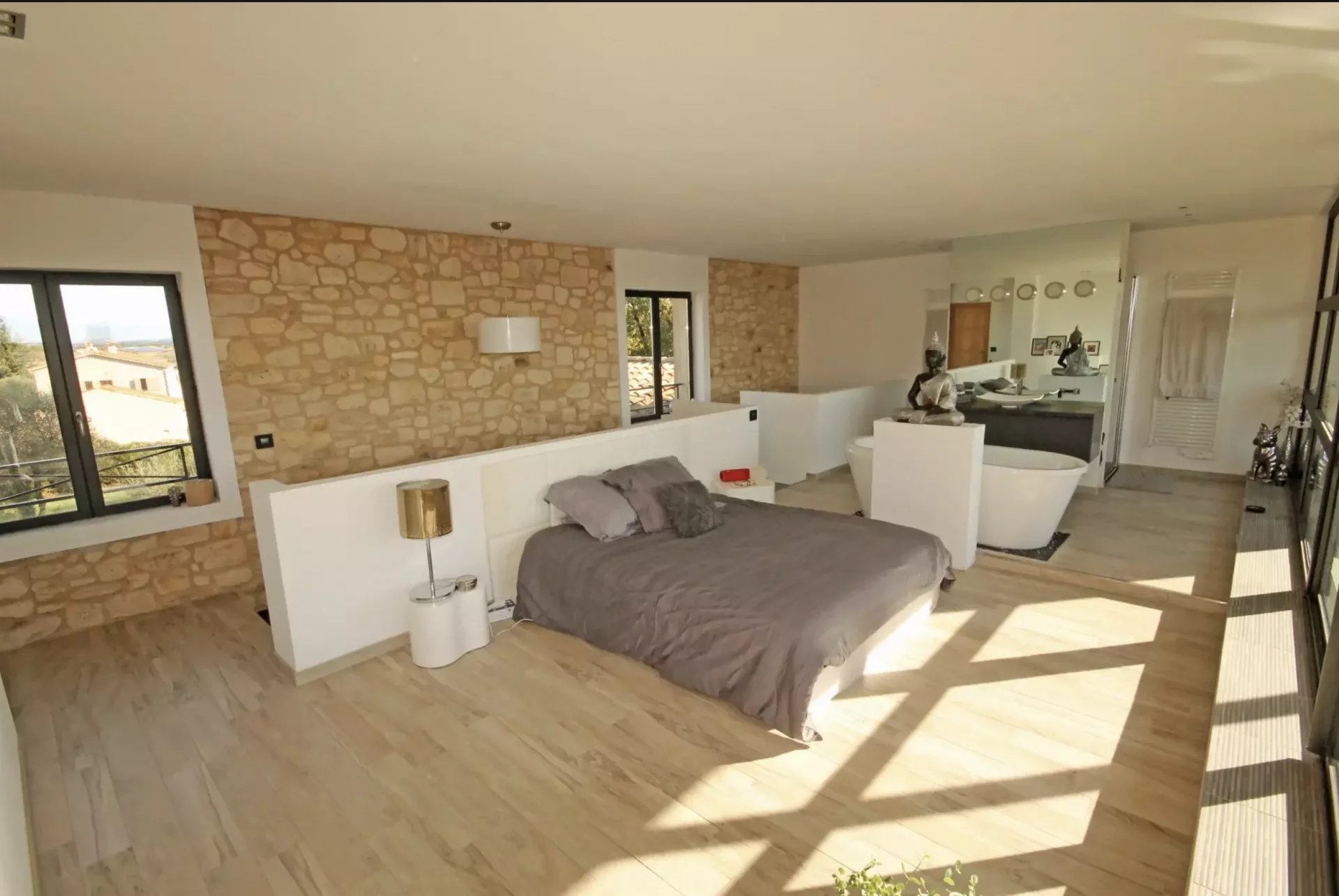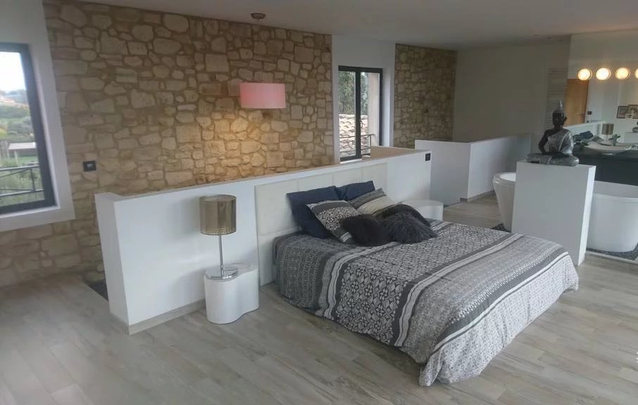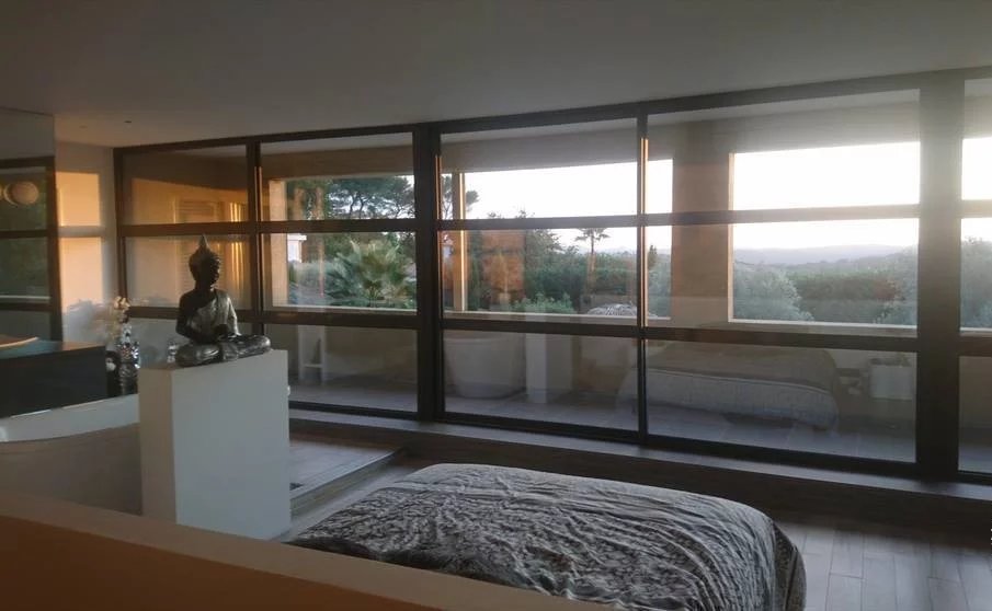 A l'étage, suite parentale de 45 m² avec dressing, baignoire en îlot, douche, wc indépendant, balcon couvert de 13 m², baie vitrée de 10 mètres de large avec vue panoramique sur l'Esterel