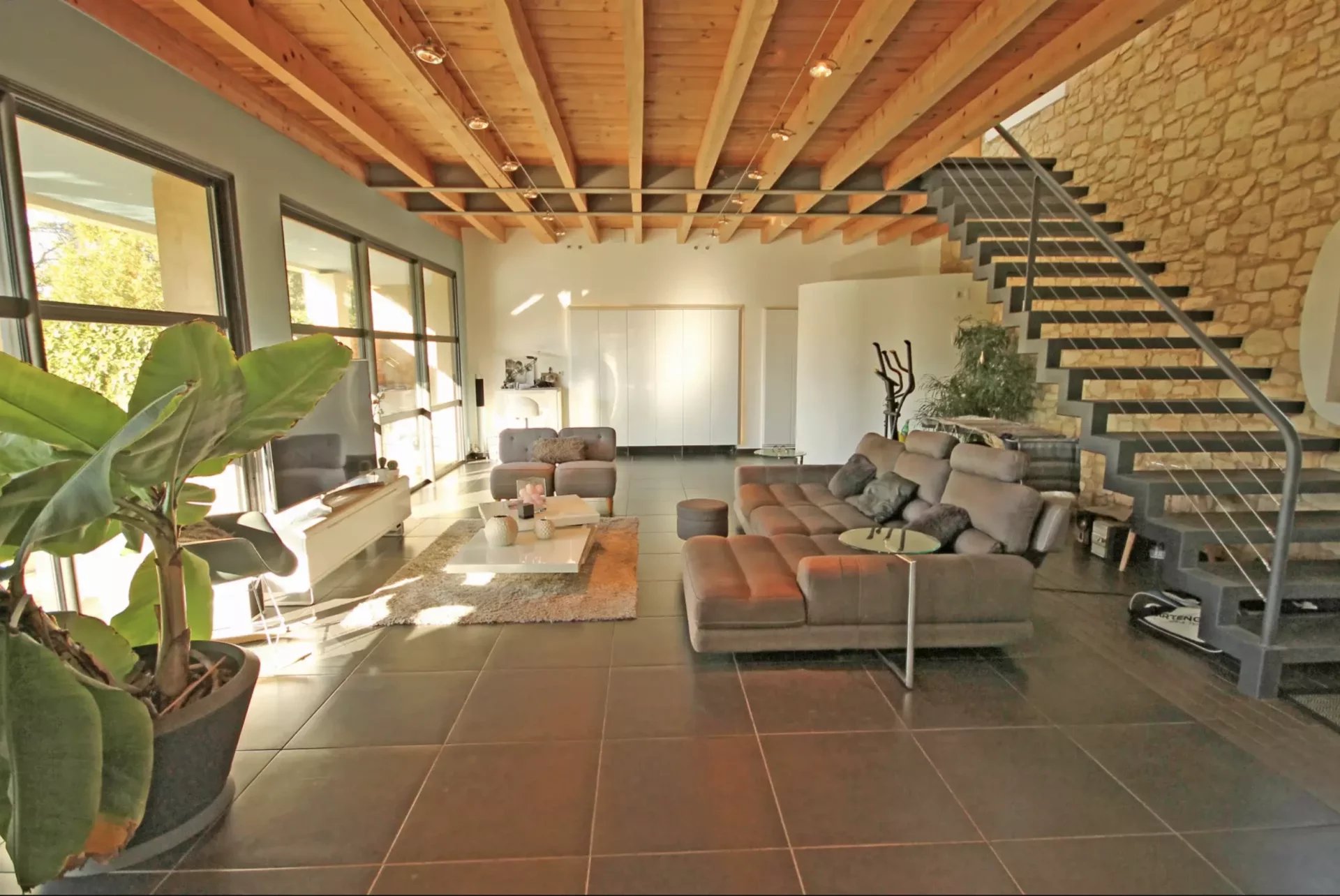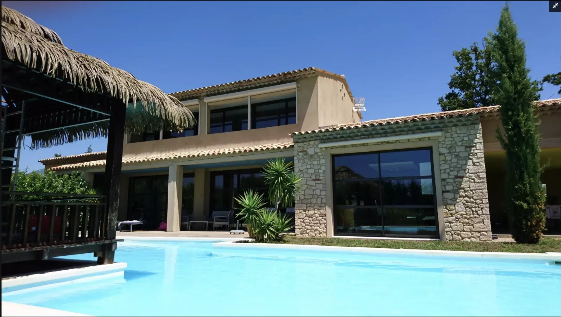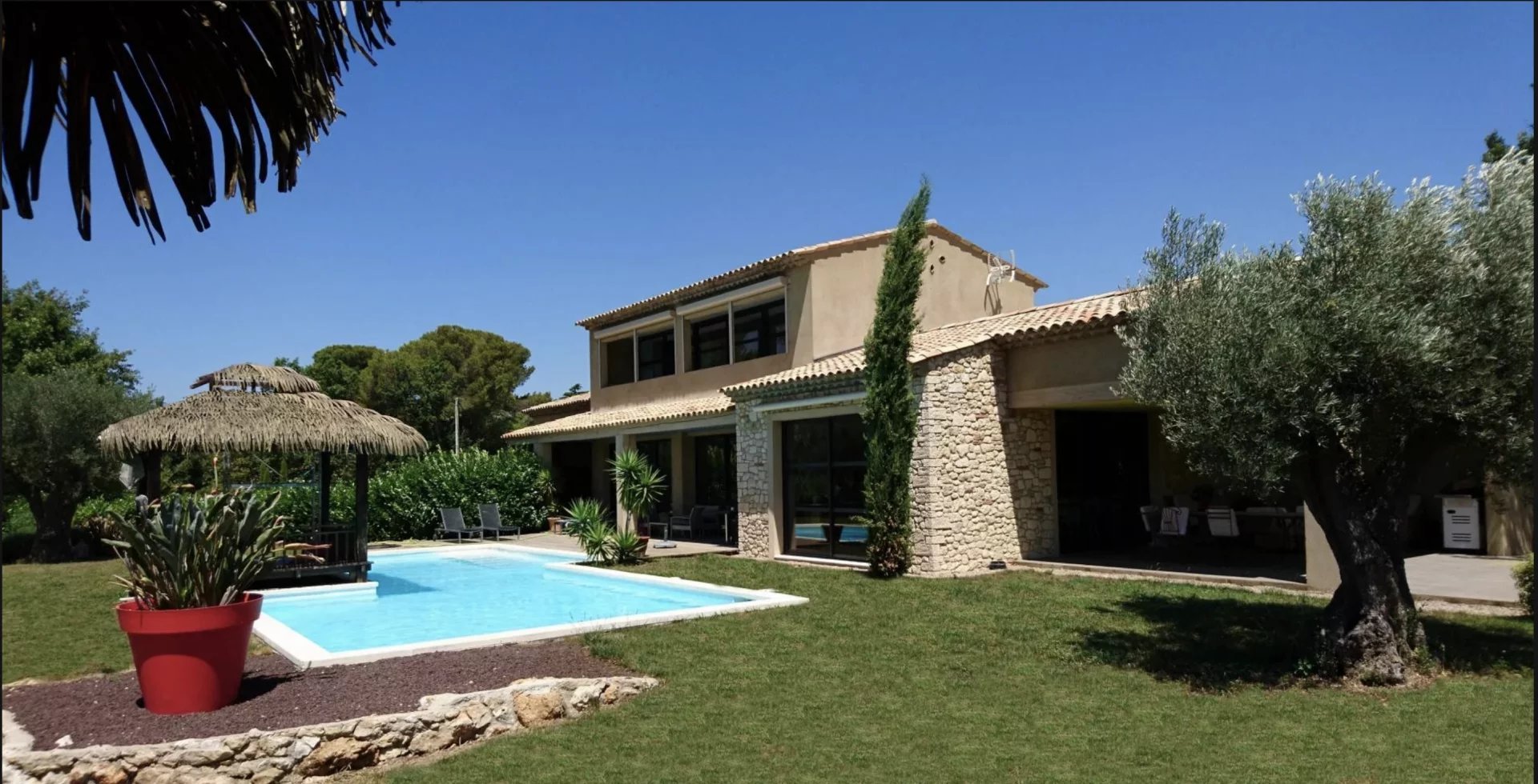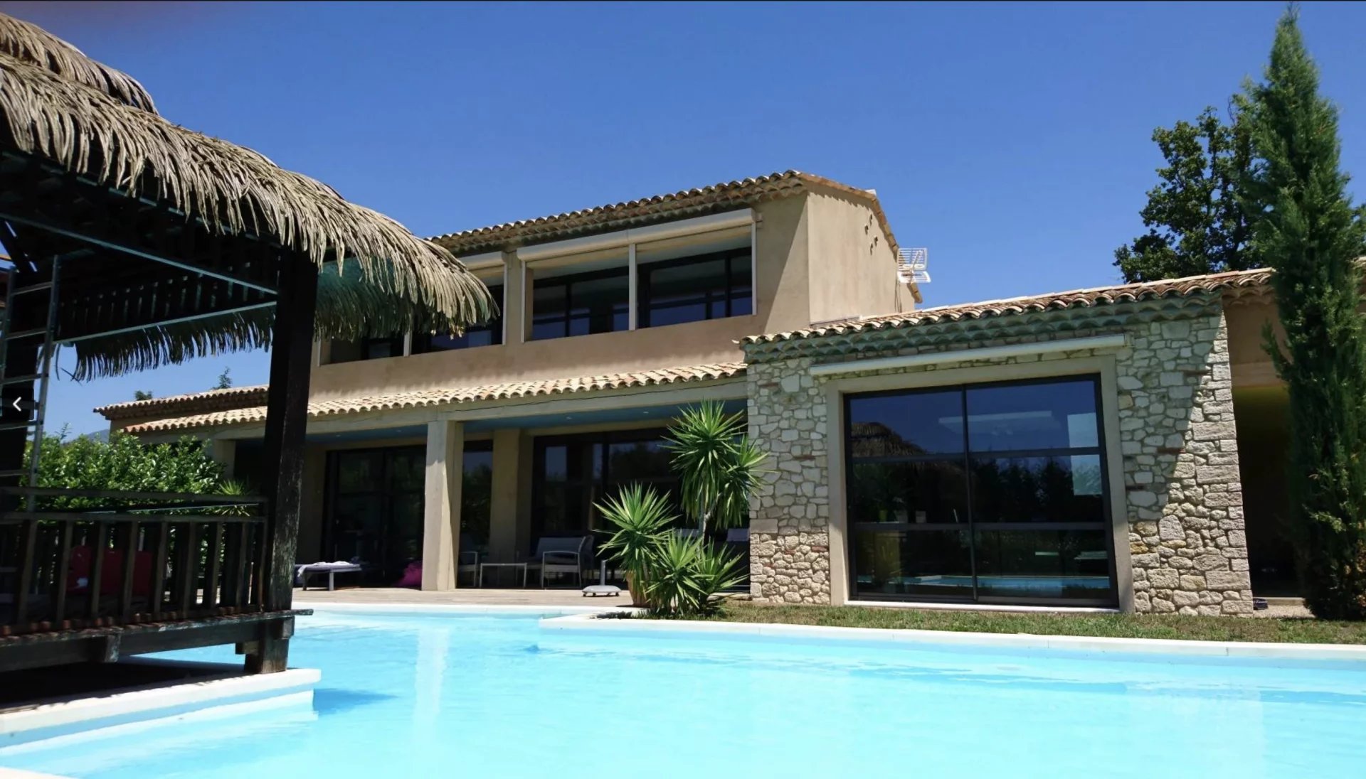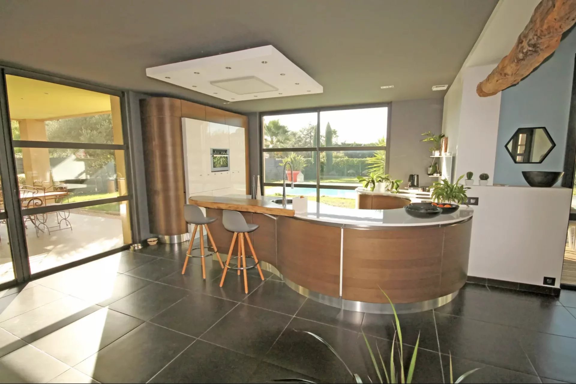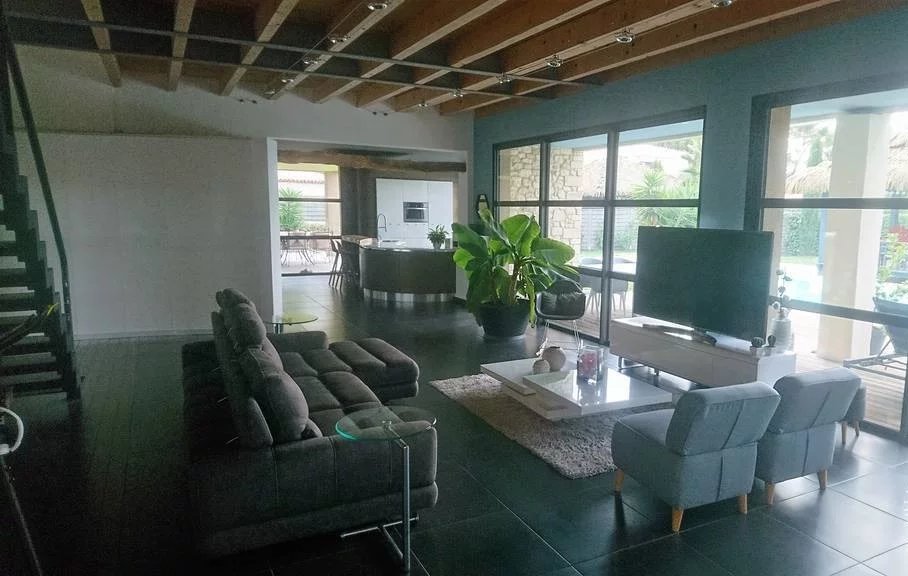 Quartier résidentiel villa d'architecte d'environ 270 m2 en totalité comprenant une vaste réception de 108 m2 donnant sur 2 grandes terrasses dont 1 couverte, ainsi que 2 suites équipées chacune d'un coin cuisine, salle de douche WC.
