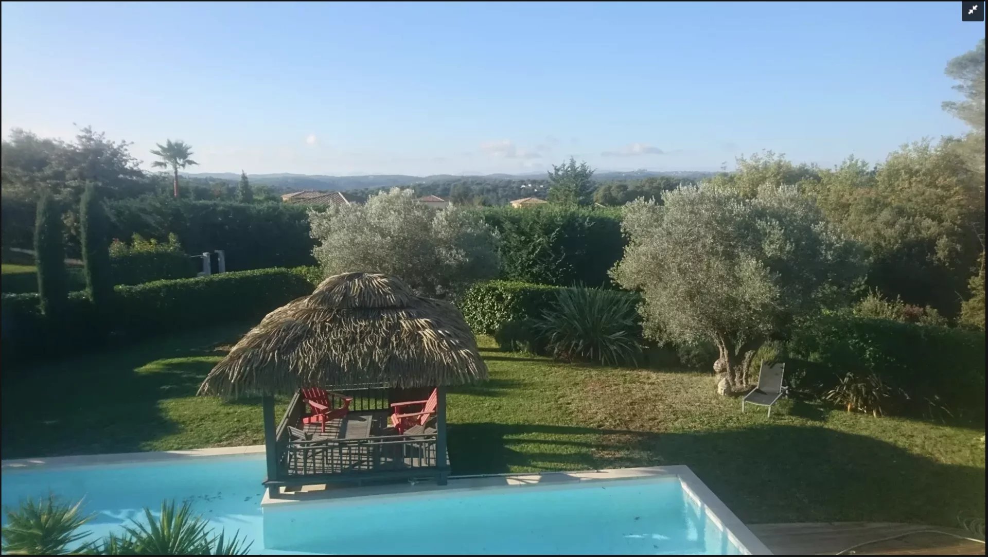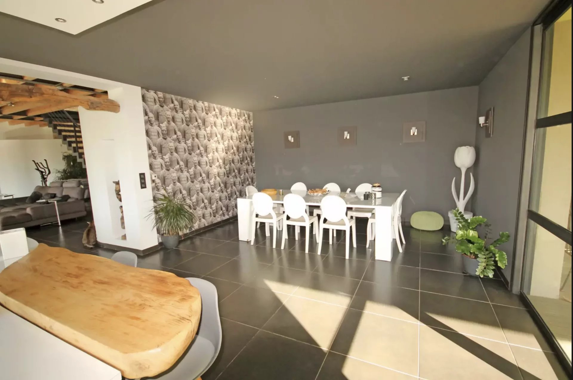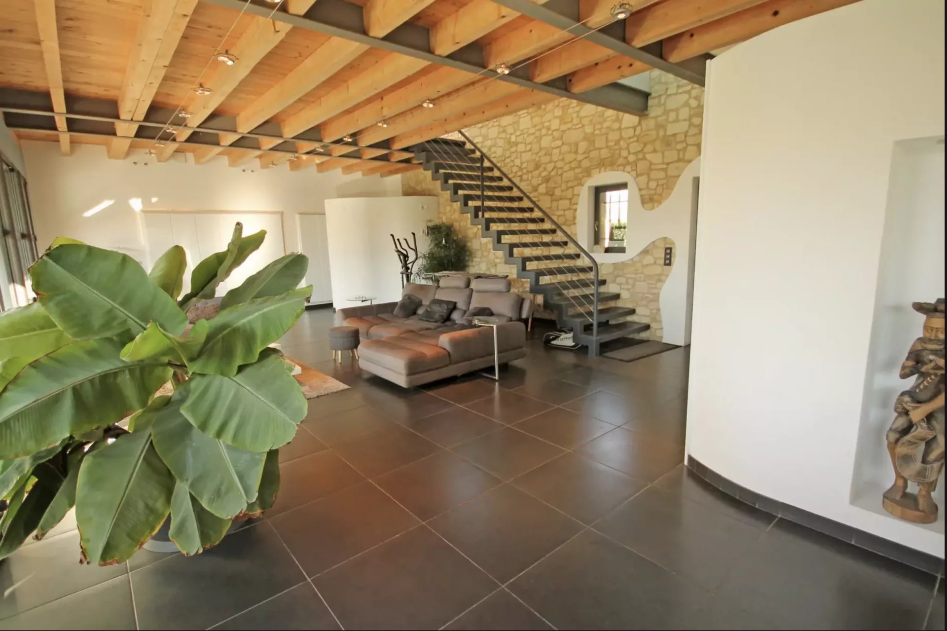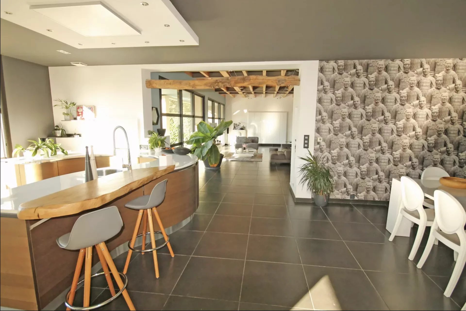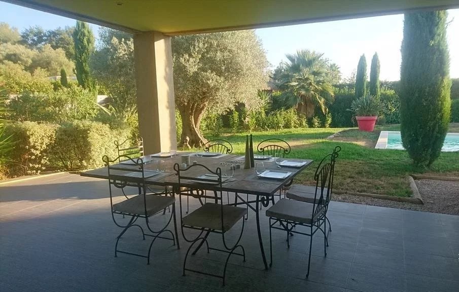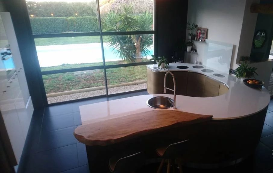 Quartier résidentiel villa d'architecte d'environ 270 m2 en totalité comprenant une vaste réception de 108 m2 donnant sur 2 grandes terrasses dont 1 couverte, ainsi que 2 suites équipées chacune d'un coin cuisine, salle de douche WC.