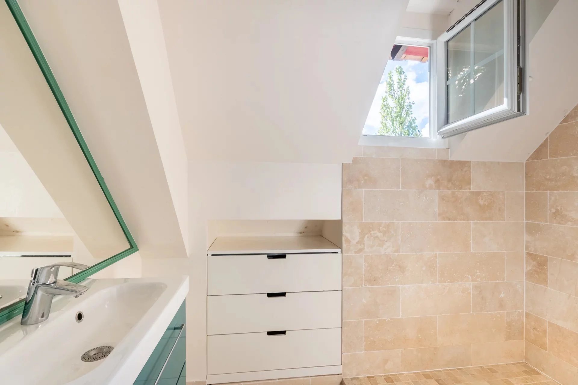 Au 2nd étage, le palier dessert 3 chambres sous combles avec placards, une salle de douche et des toilettes. En entre-sol : l’ancien garage a été aménagé en family room, studio équipé avec espace cuisine, salle de douche, toilettes, buanderie, espace chaufferie.