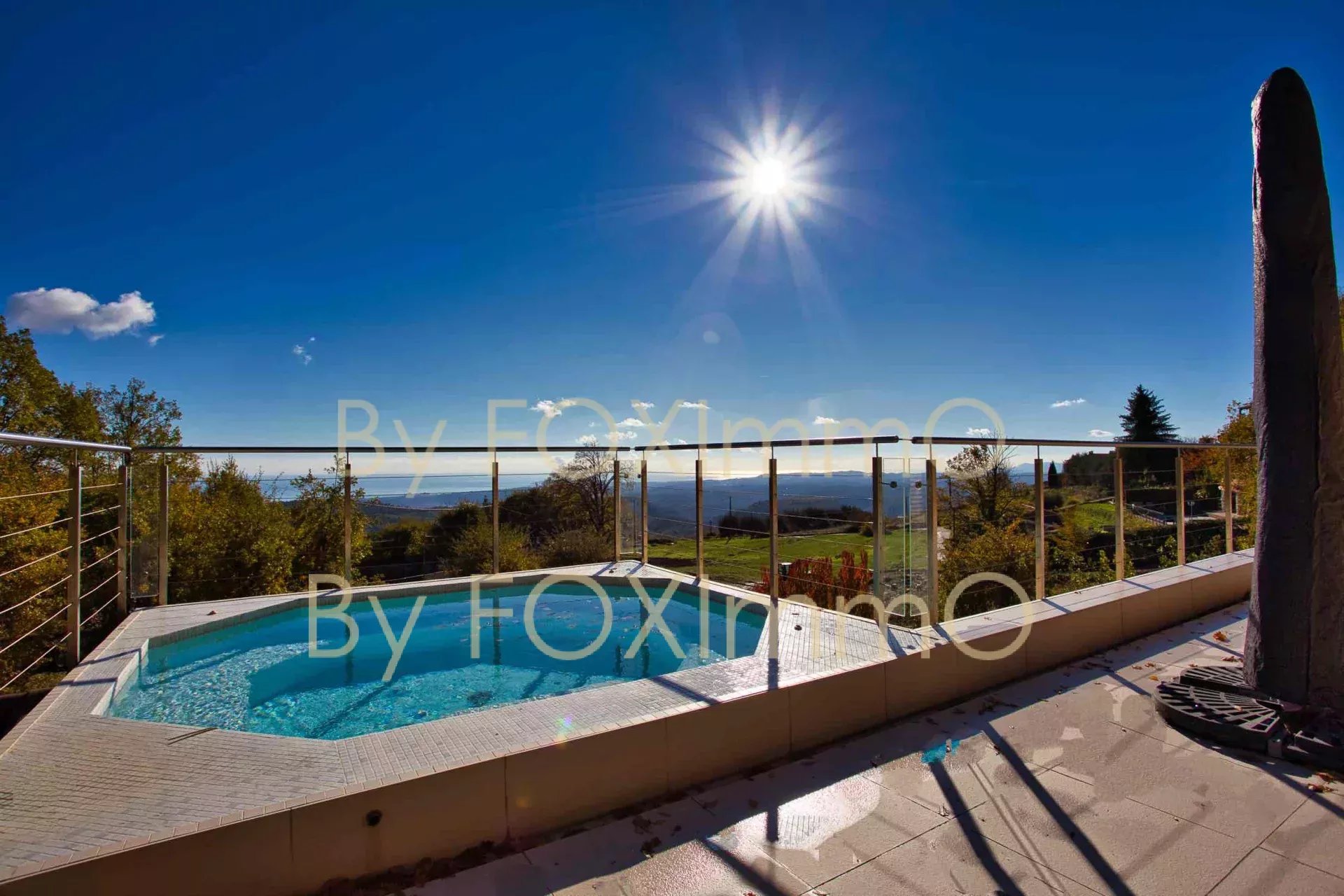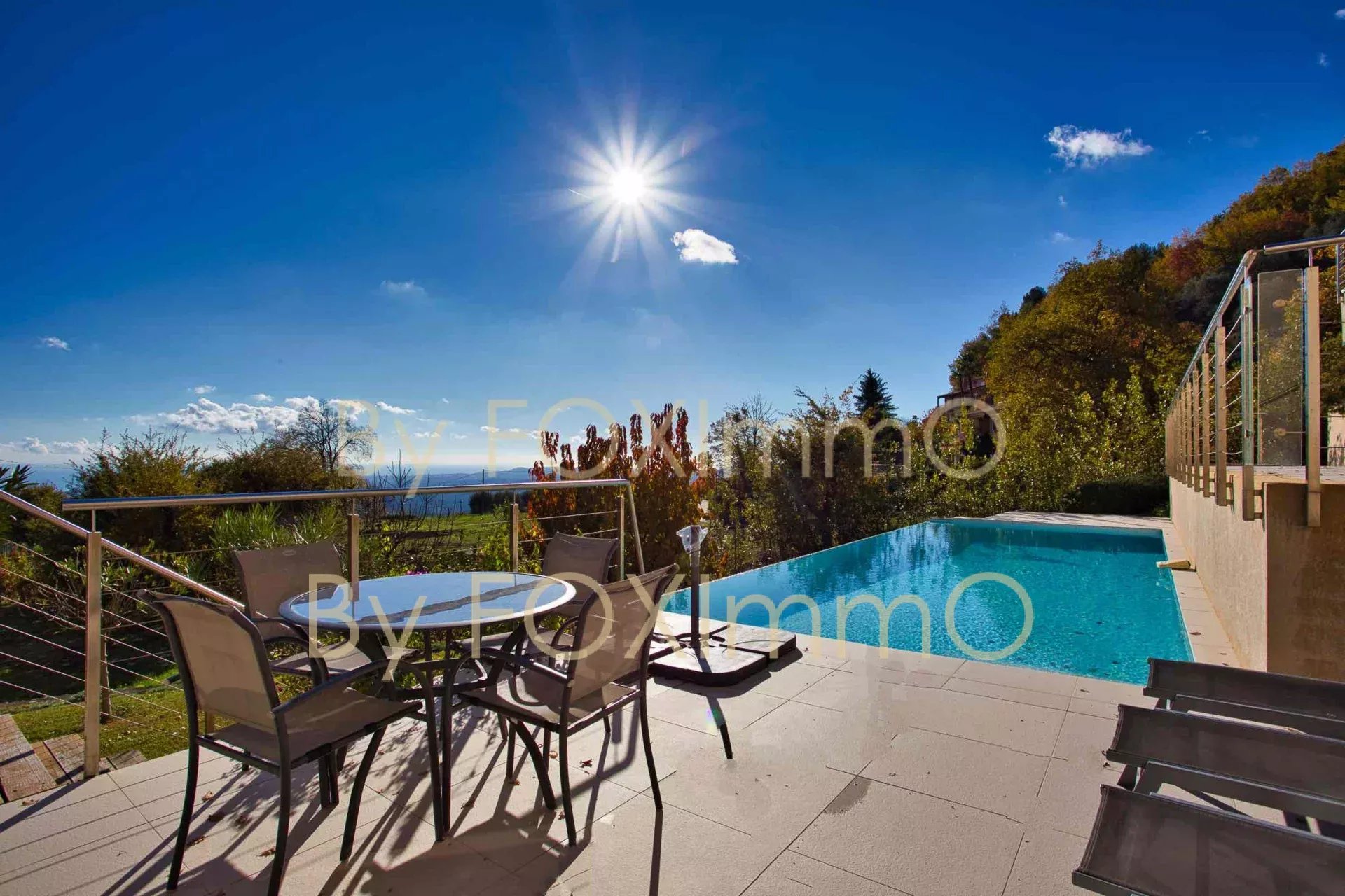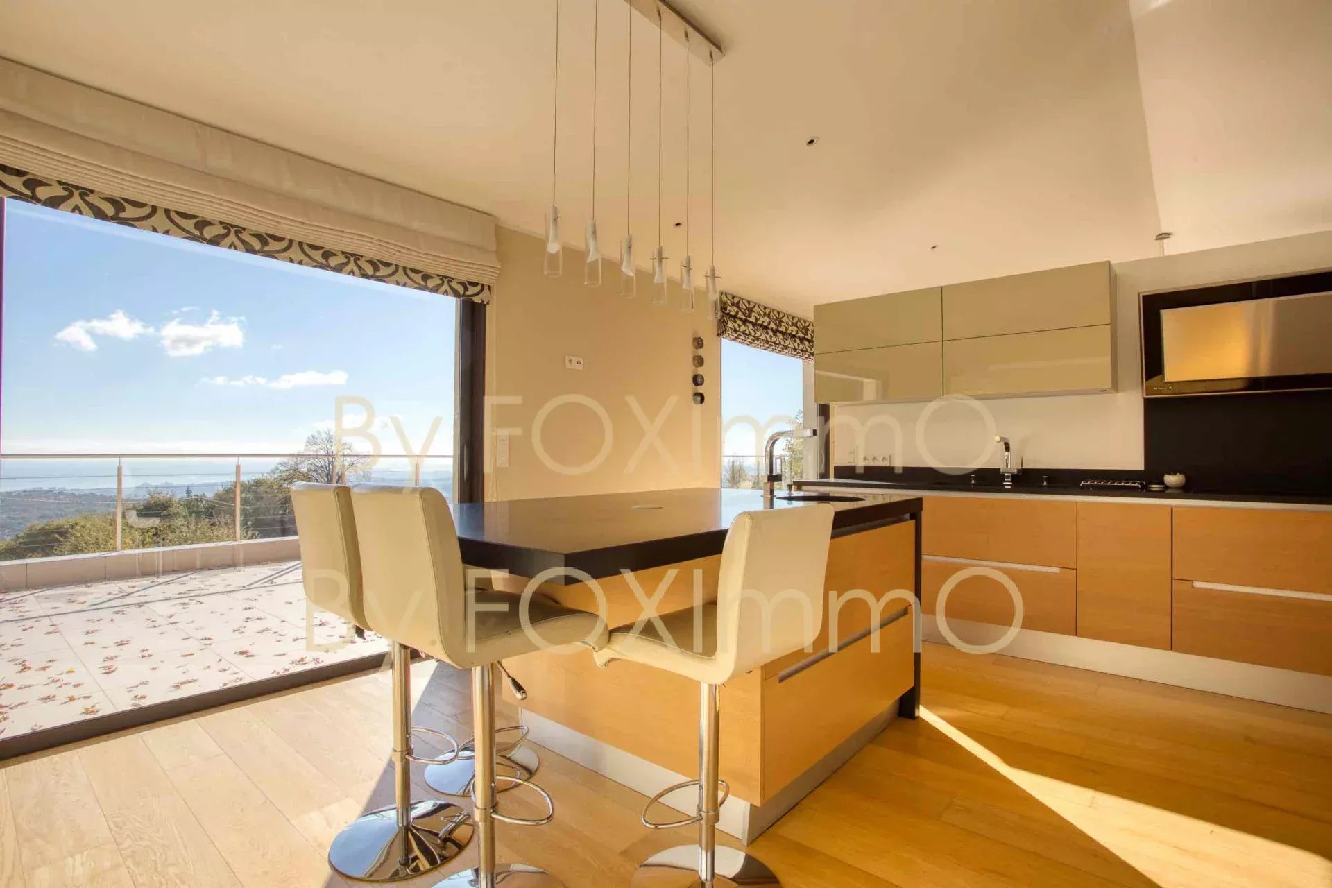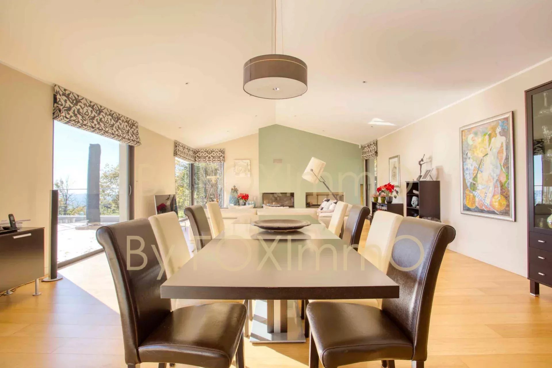 Sulla Costa Azzurra, vicino a Vence, nel comune di Tourrettes sur Loup, vicino al villaggio in un ambiente idilliaco e pastorale. Questa bella villa contemporanea di recente costruzione si estende per 395 m2 su circa 7000 m2 di terreno, in una posizione dominante con vista panoramica sul mare fino alla Corsica, Vanta volumi magnifici, una disposizione ben studiata, caratteristiche di alta gamma e materiali di qualità. C'è un enorme salone/sala da pranzo che si apre sulle due grande terrazze e sulla vasca idromassaggio, una spaziosa cucina con una moderna isola centrale completamente attrezzata, un ampio soggiorno con camino, una zona pranzo e una grande cucina a pianta aperta. Nella casa principale ci sono 4 camere da letto, di cui 3 con bagno, un bagno con doccia, un gran numero di armadi e spogliatoi su misura a tutta altezza, un ripostiglio e uno spazio di 70 m2 che può essere convertito in base alle proprie esigenze (home cinema, palestra, ecc.). Un trilocale di 50 m2, indipendente e collegato all'edificio principale, composto da un salone, una cucina completamente attrezzata, due camere da letto e un bagno con doccia, vi permetterà di accogliere comodamente i vostri ospiti e la vostra famiglia o di generare una significativa rendita da locazione. La piscina a sfioro è riscaldata e vanta anche una vista sul mare da un'ampia terrazza. Garage e ampio parcheggio per 10-12 auto. Una proprietà rara ed eccezionale, da visitare assolutamente! Le informazioni sui rischi a cui è esposto questo immobile sono disponibili sul sito web di Géorisques: georisques.gouv.fr Commissione del venditore inclusa nel prezzo di vendita Nostro riferimento :3523YBEFEN