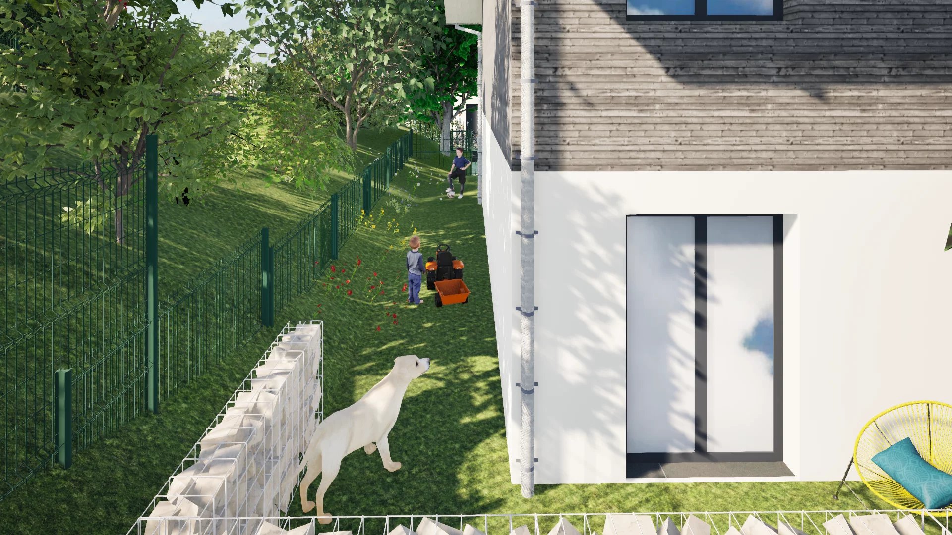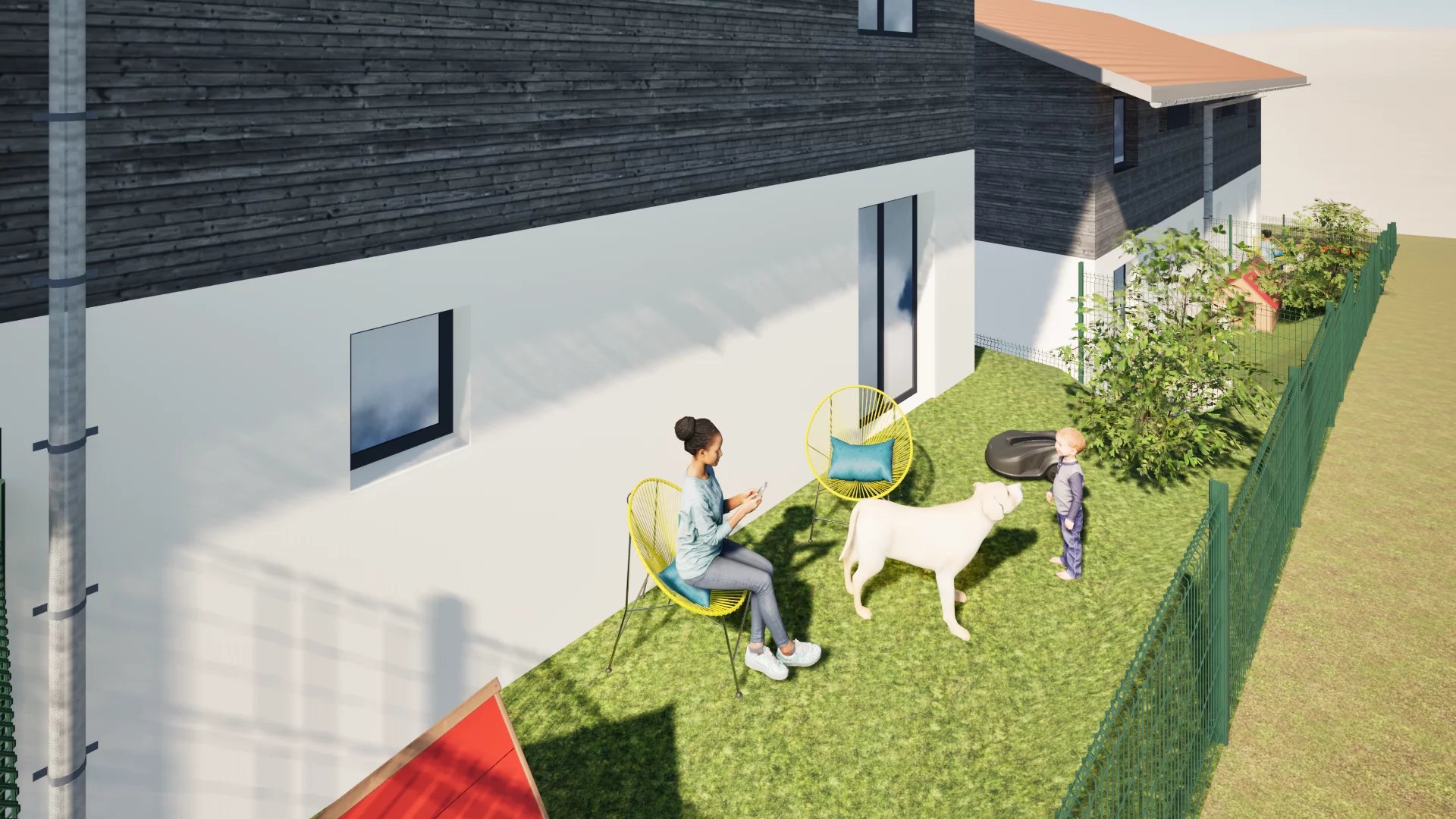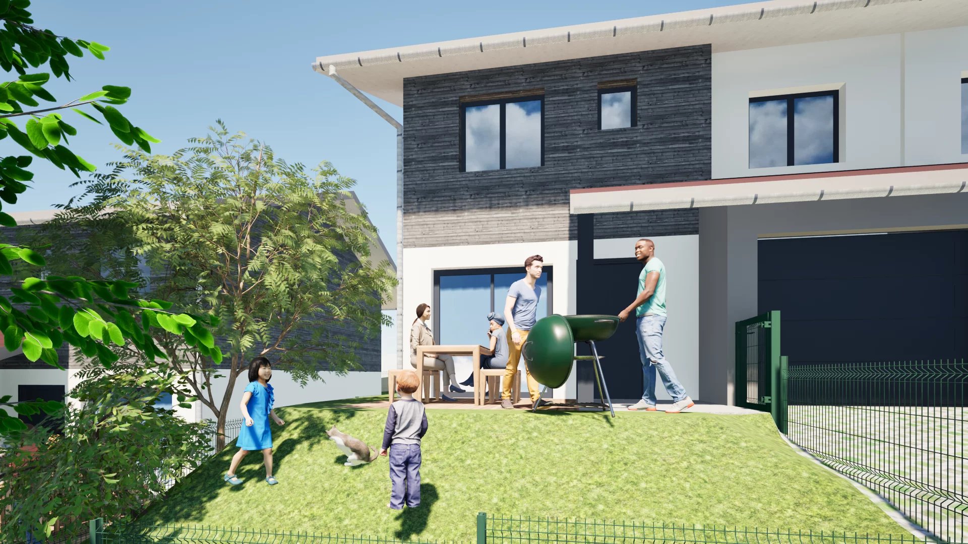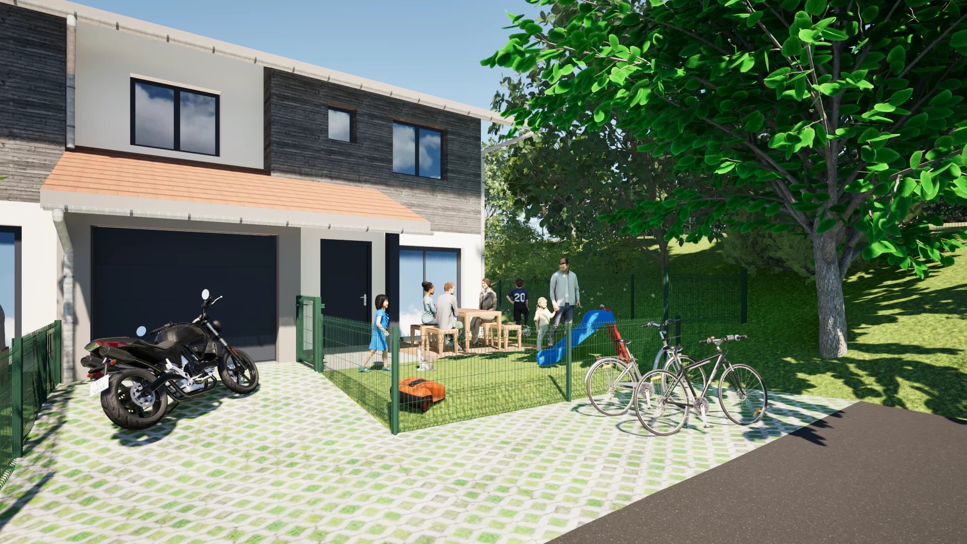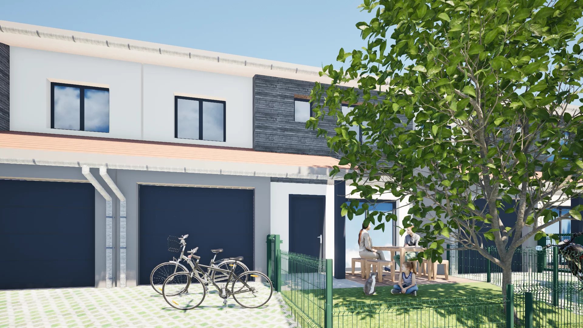 Espaces extérieurs sans travaux pour les acquéreurs : Finition parkings extérieurs, espaces verts, plantations et gazons réalisés en partie privative ainsi que les clôtures séparatives. Séparation pare vue et terrasses bois. Voierie goudron, stockage déchets et boîtes à lettres.
