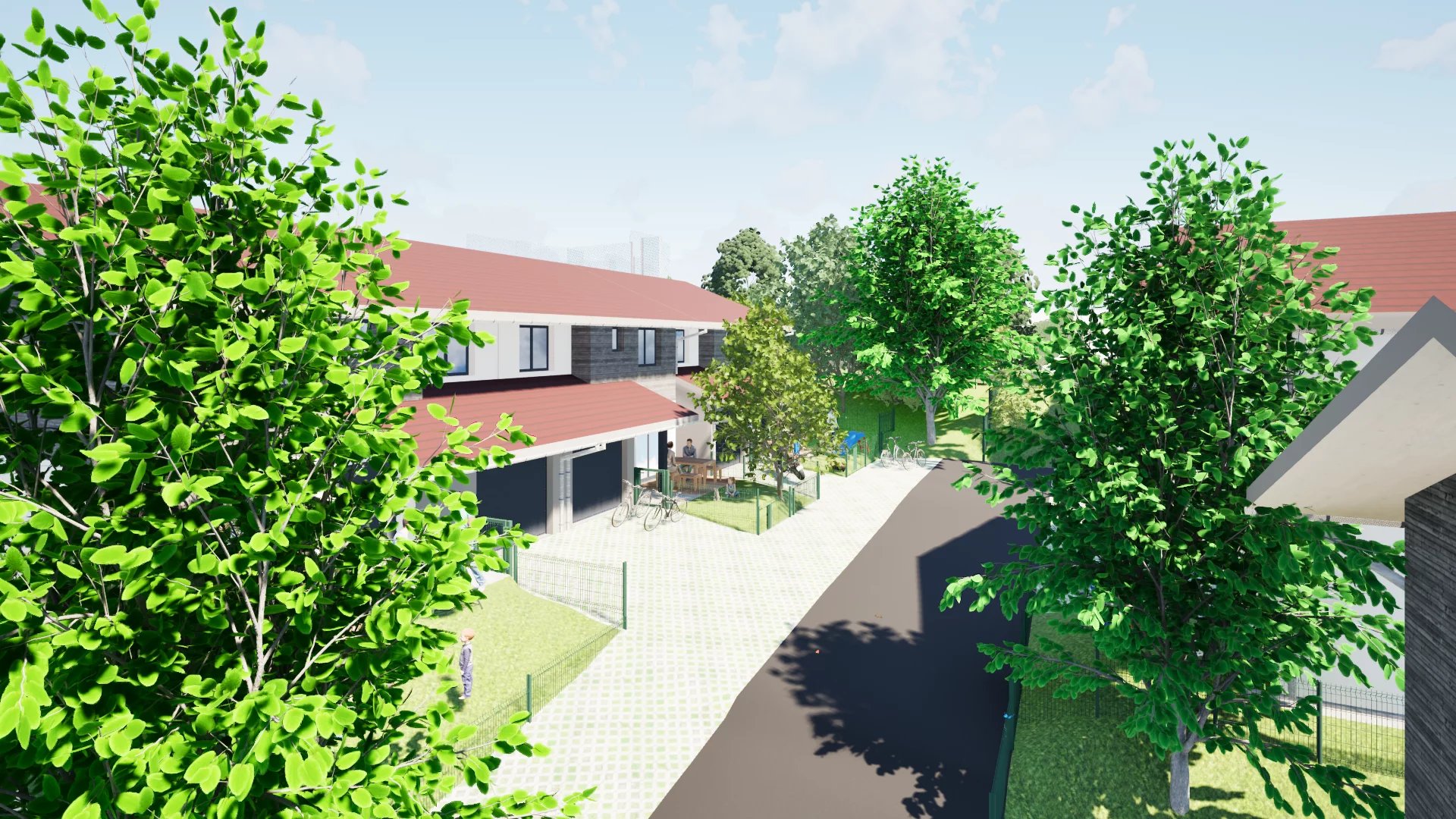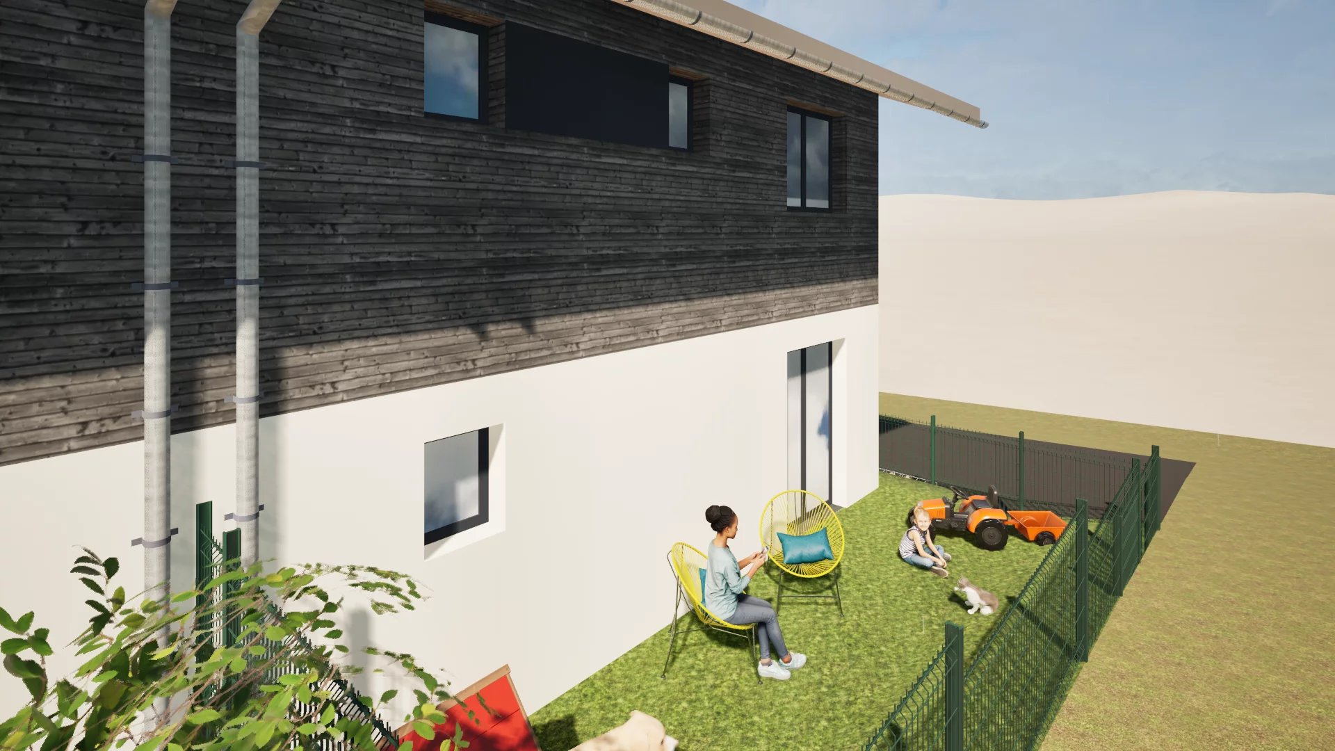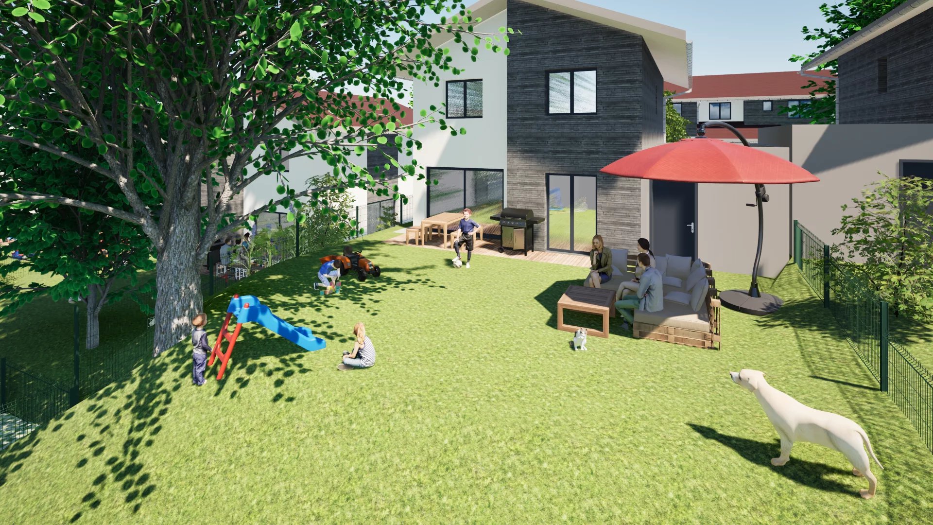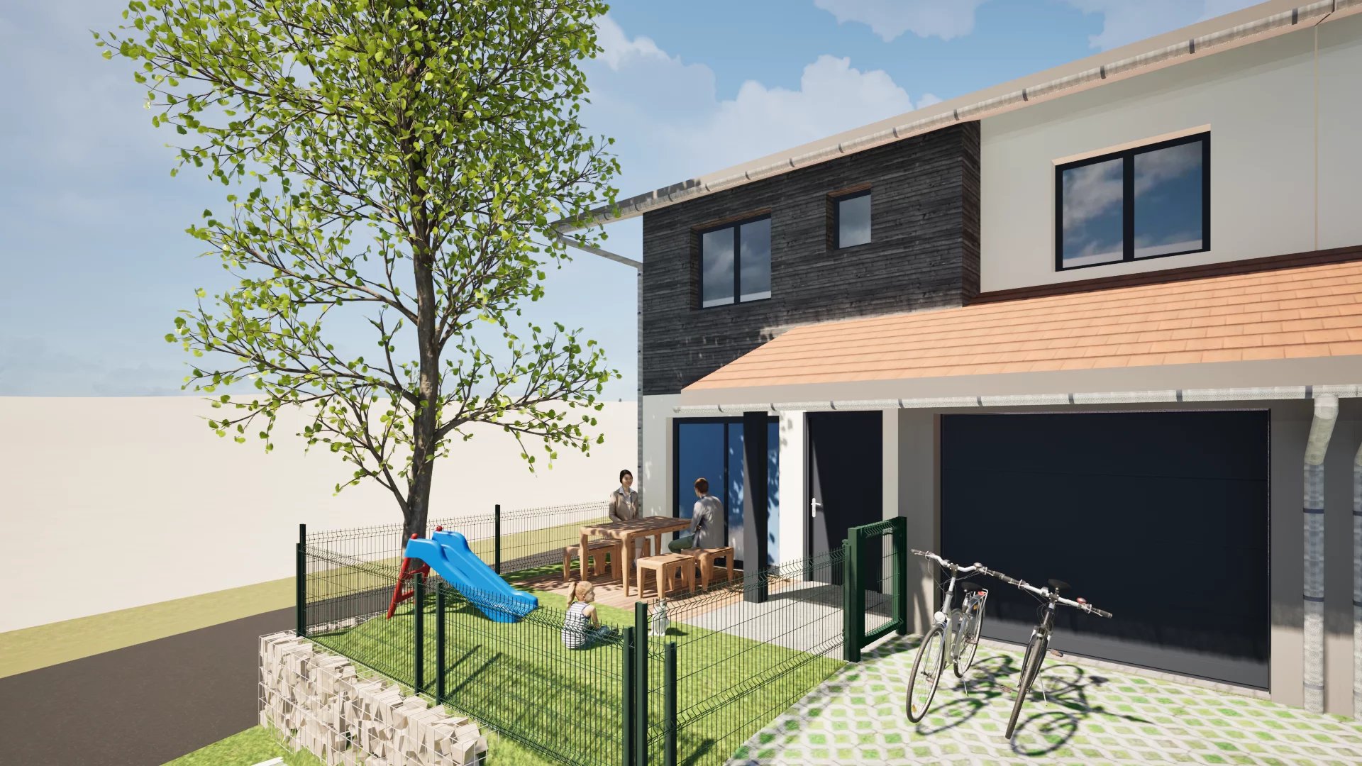 Espaces extérieurs sans travaux pour les acquéreurs : Finition parkings extérieurs, espaces verts, plantations et gazons réalisés en partie privative ainsi que les clôtures séparatives. Séparation pare vue et terrasses bois. Voierie goudron, stockage déchets et boîtes à lettres.