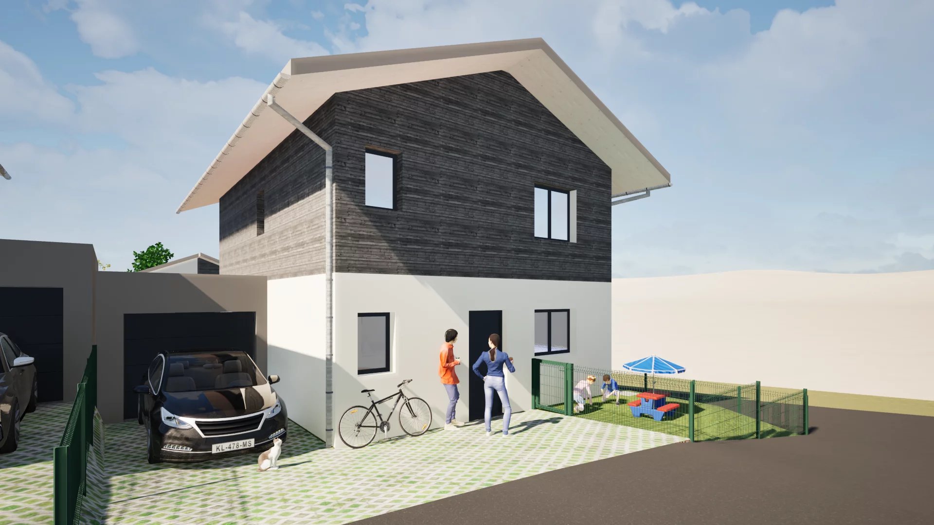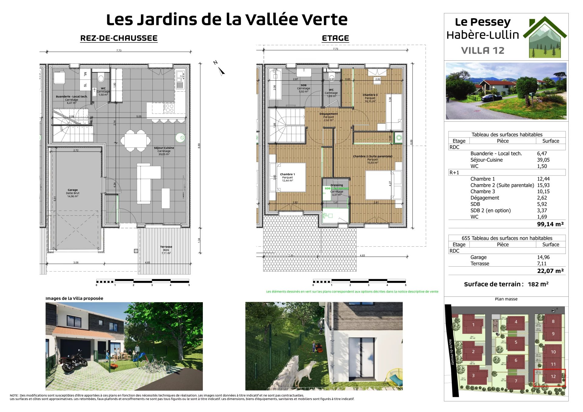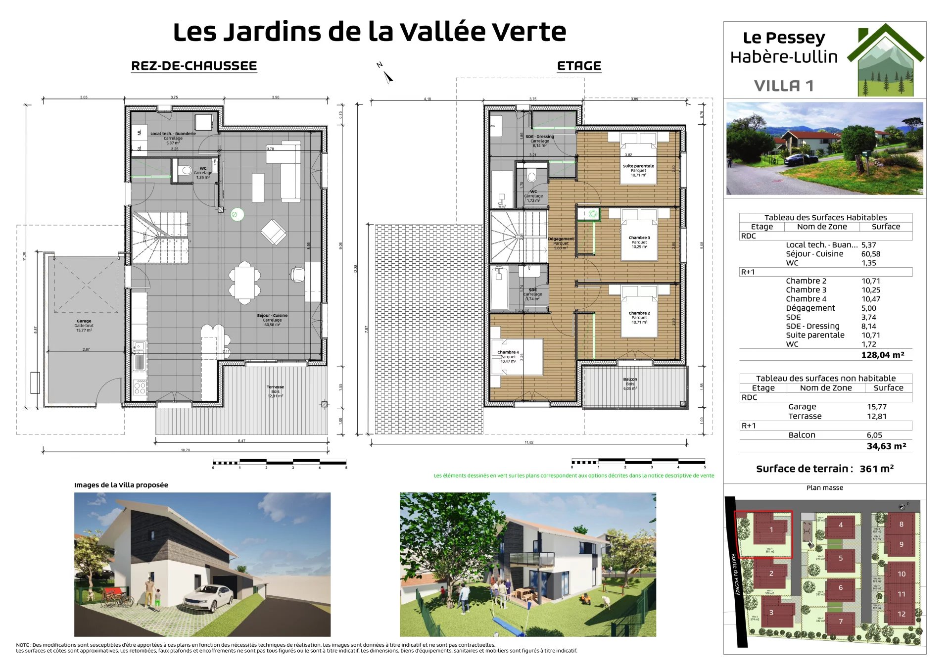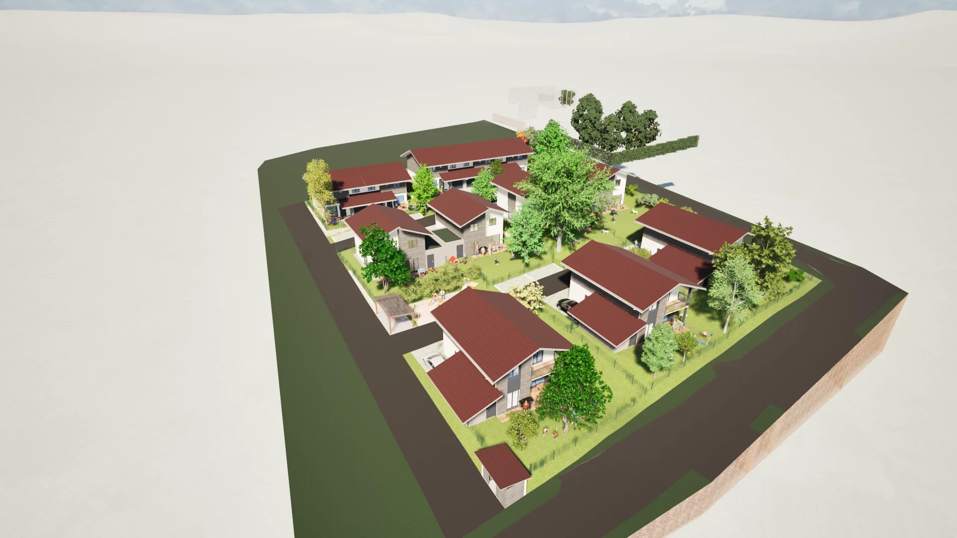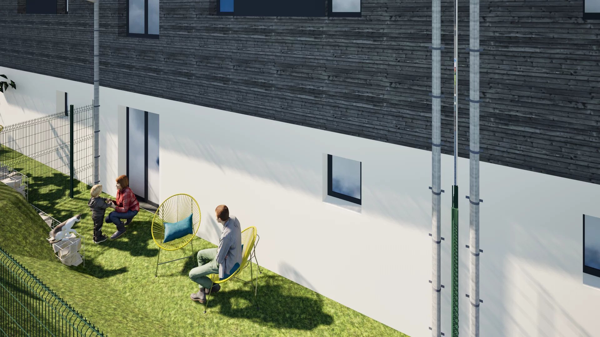 Espaces extérieurs sans travaux pour les acquéreurs : Finition parkings extérieurs, espaces verts, plantations et gazons réalisés en partie privative ainsi que les clôtures séparatives. Séparation pare vue et terrasses bois. Voierie goudron, stockage déchets et boîtes à lettres.