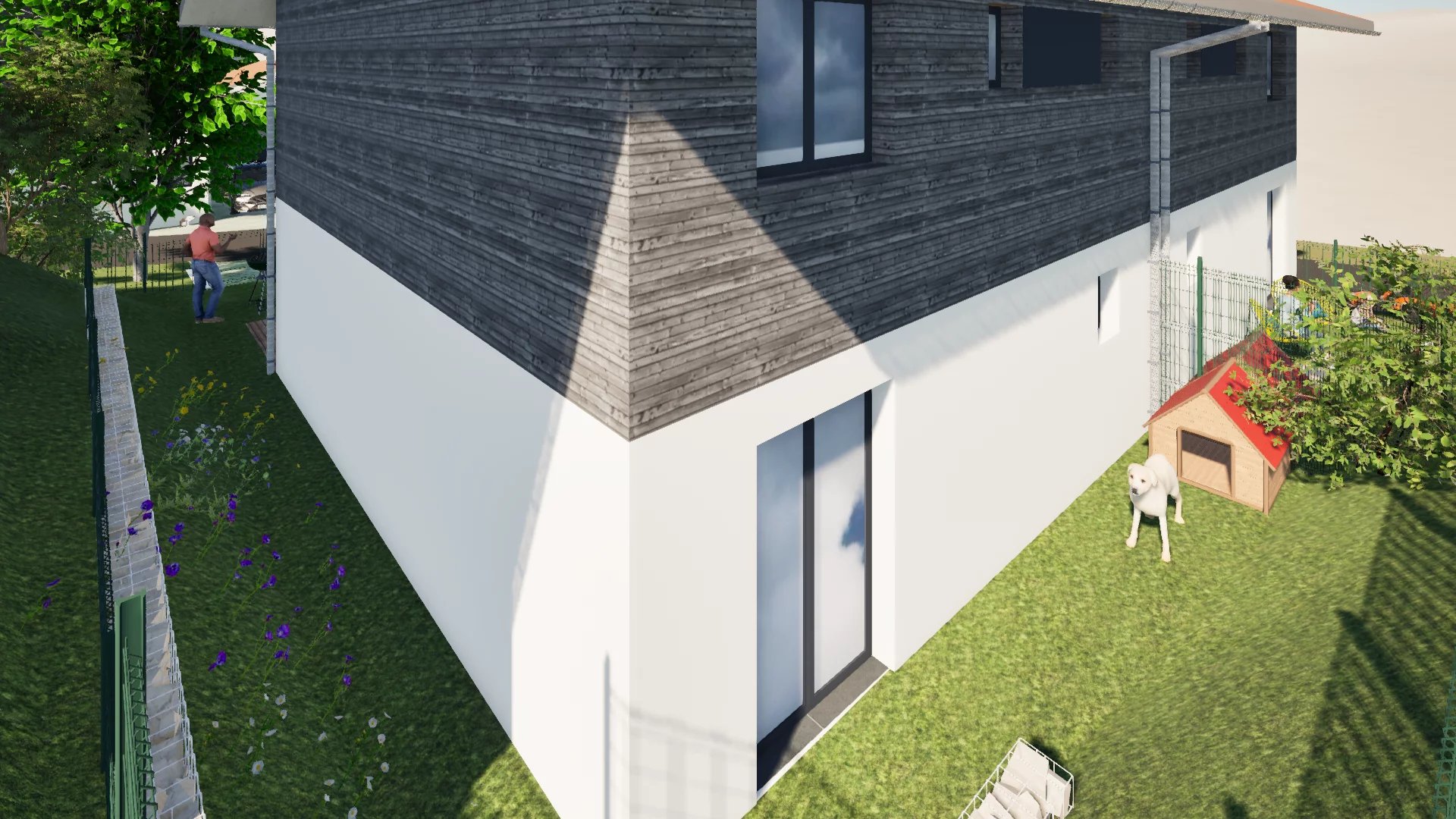 Menuiseries bois ou Alu avec BSO (Brise Soleil Orientable) dans les pièces de vie (pour garder la luminosité tout en se protégeant des apports solaires l’été) et volets roulants électriques dans les chambres (apportant une meilleure occultation).