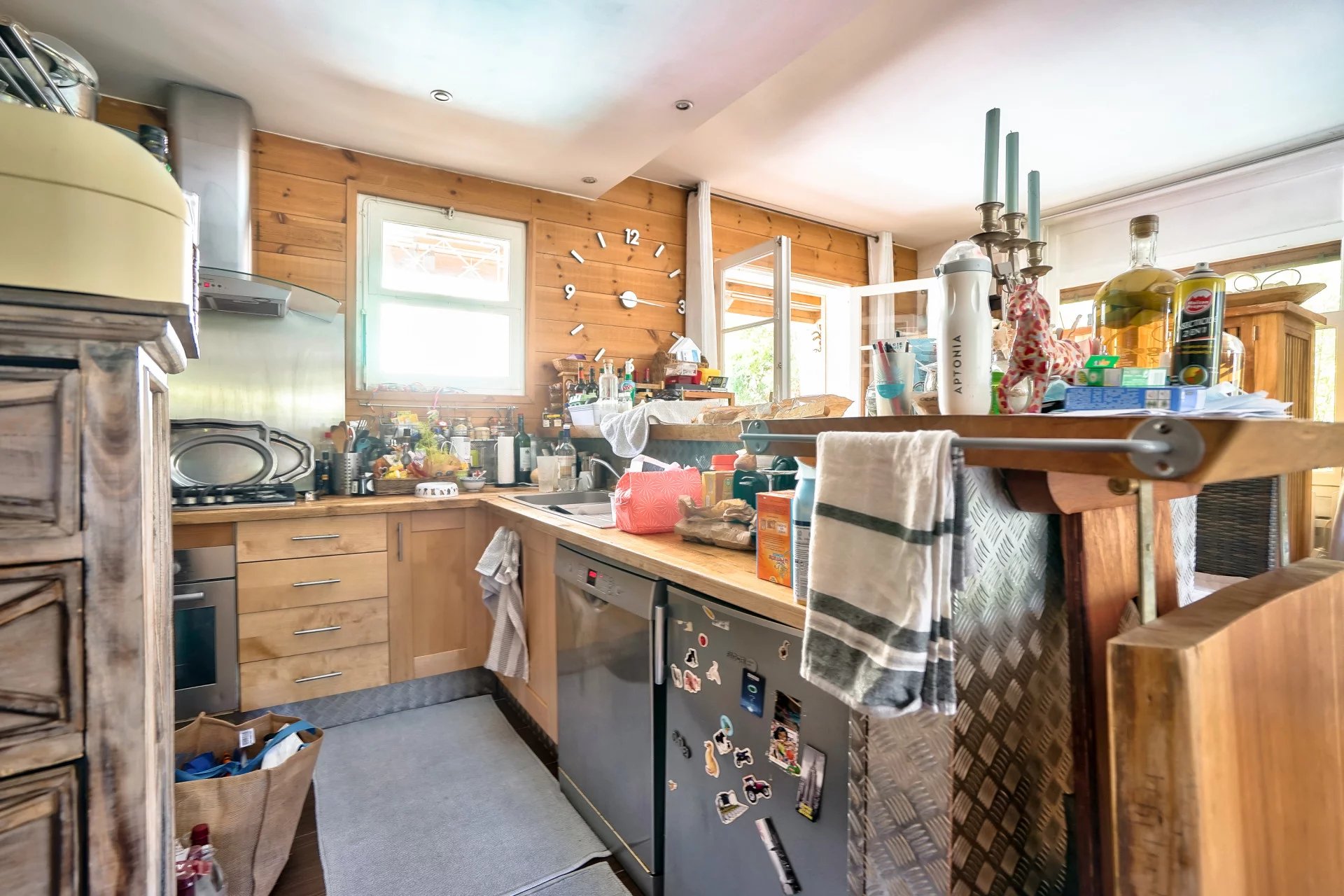 Actuellement, la maison offre au rez-de-chaussée une entrée, une spacieuse pièce de vie en angle baignée de lumière avec une cheminée dans un coin, une cuisine ouverte avec plan dinatoire, deux chambres, ainsi qu'une salle de bains comprenant une douche à l'italienne et une grande baignoire, sans oublier des toilettes séparées.