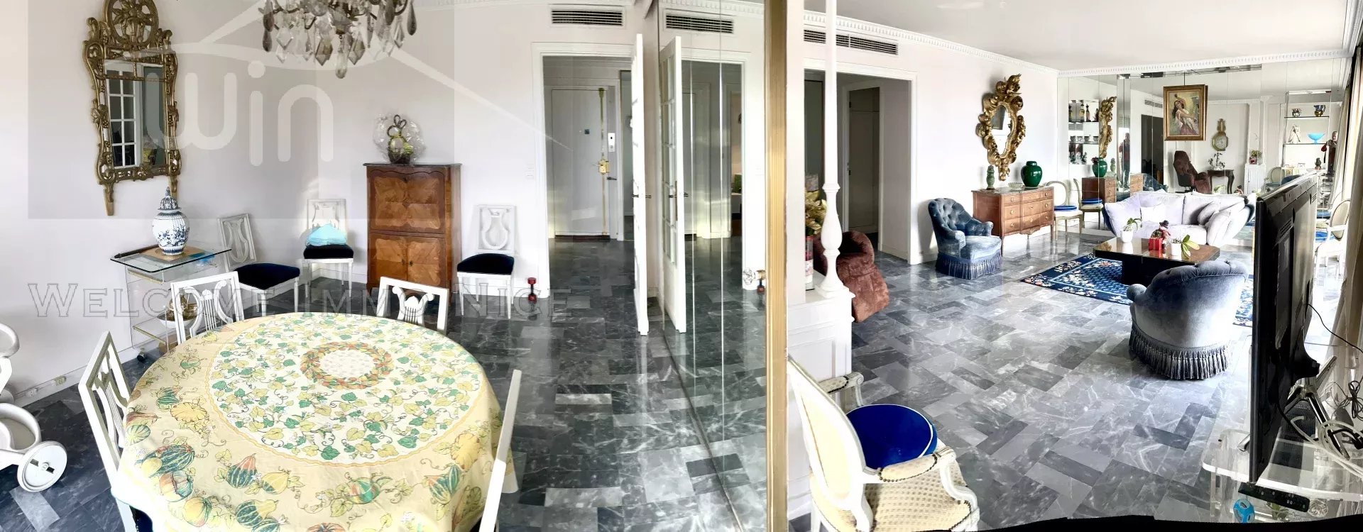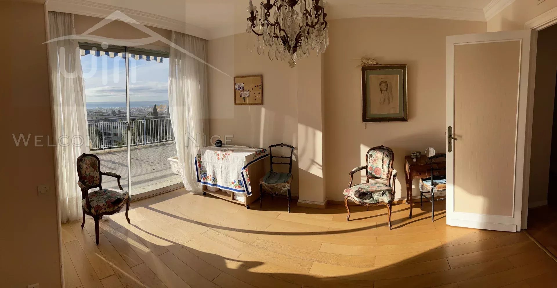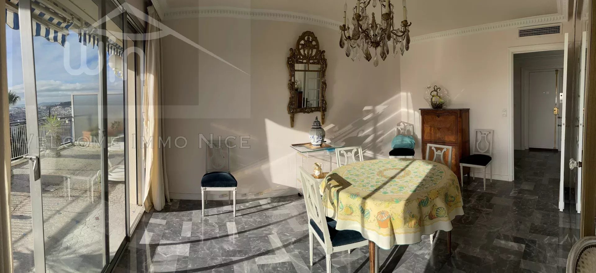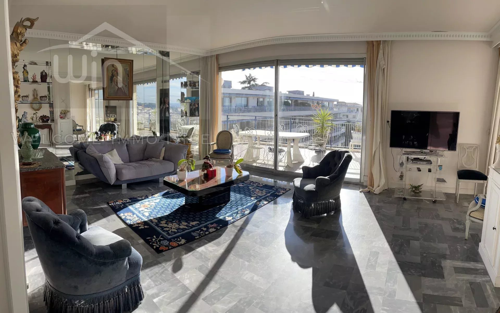 Au 5ème et dernier étage, l'appartement dispose d'un accès privé par ascenseur, d'une vaste entrée donnant sur les pièces de reception salon et salle à manger donnant sur l'immense terrasse de 150m2 entourant l'ensemble de l'appartement, offrant une vue panoramique des collines à la mer.