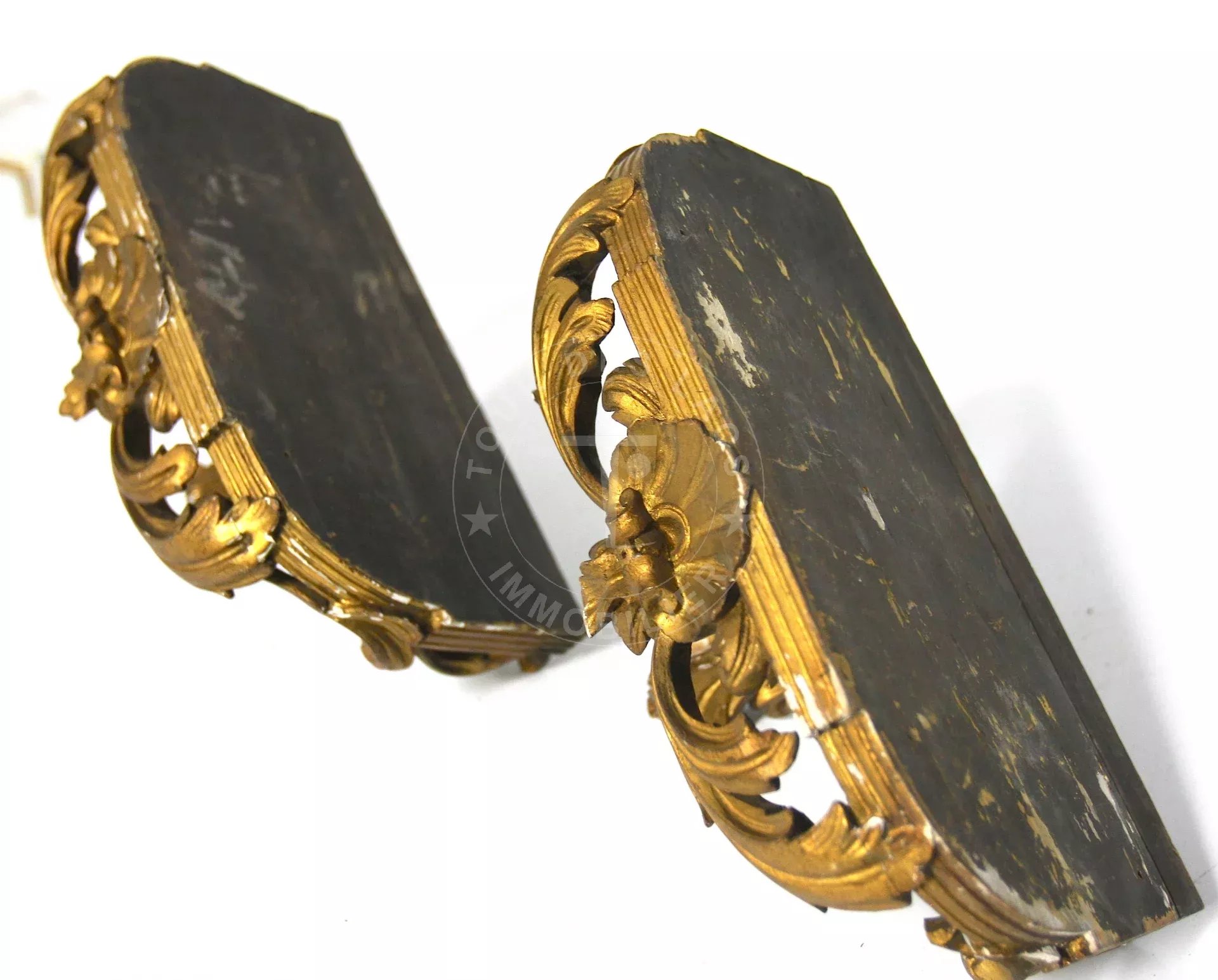 Paire de consoles d'appliques en bois sculpté et doré Contact : Thierry UOMOBONO - 06 09 65 63 89