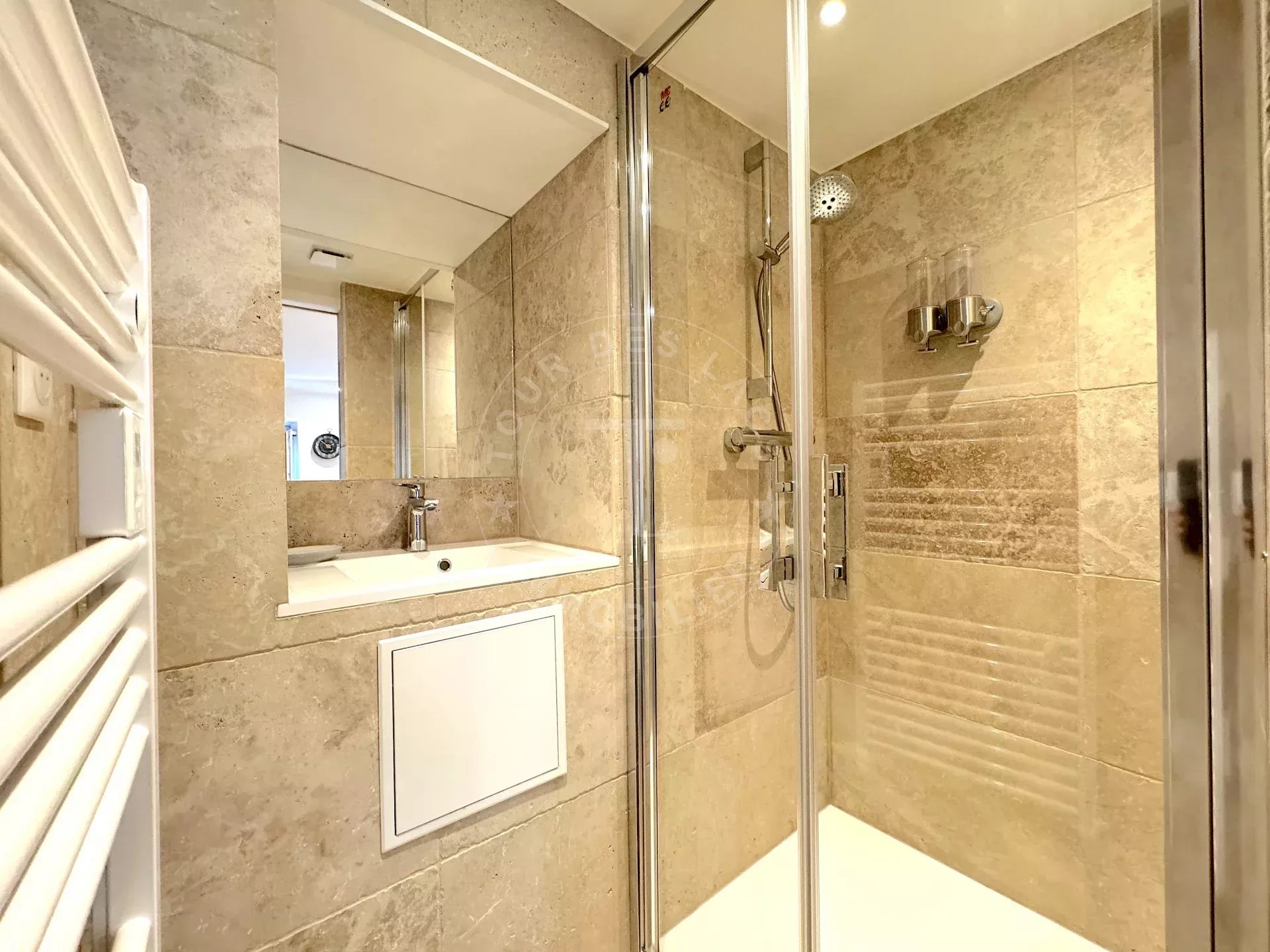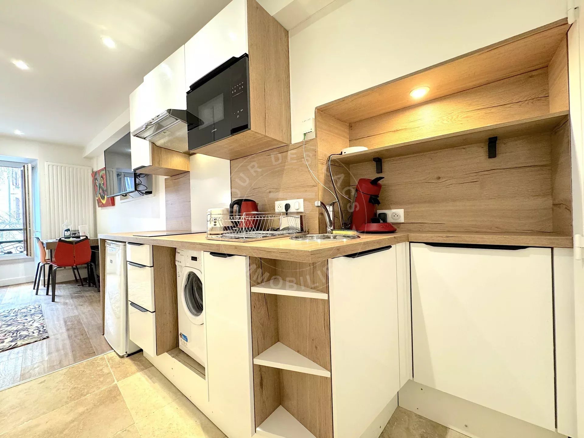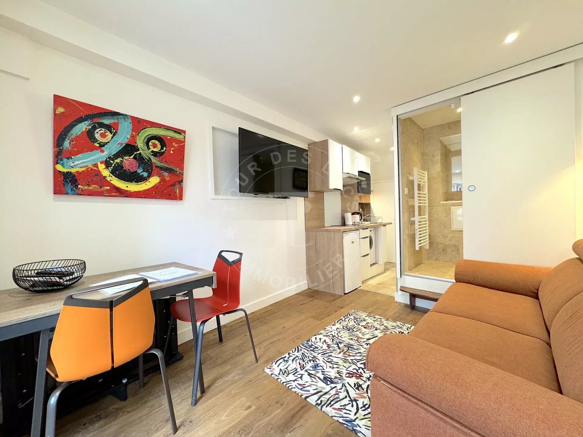 Lumière et Confort : La pièce principale, baignée de lumière, bénéficie d'une kitchenette très fonctionnelle et au design contemporain, vous permettant de vivre confortablement au quotidien. La salle de douche, entièrement carrelée, allie esthétique et praticité.